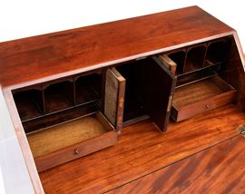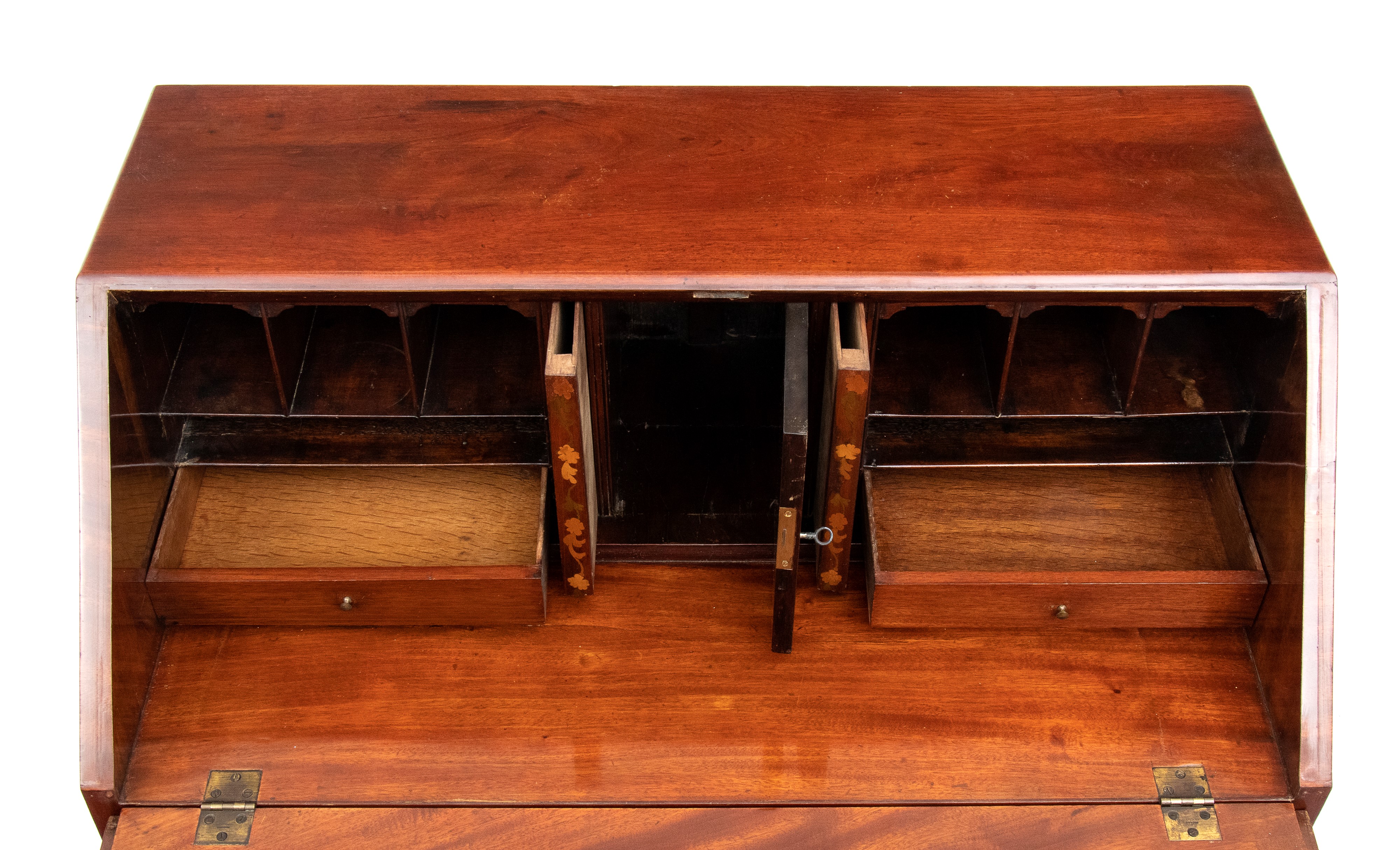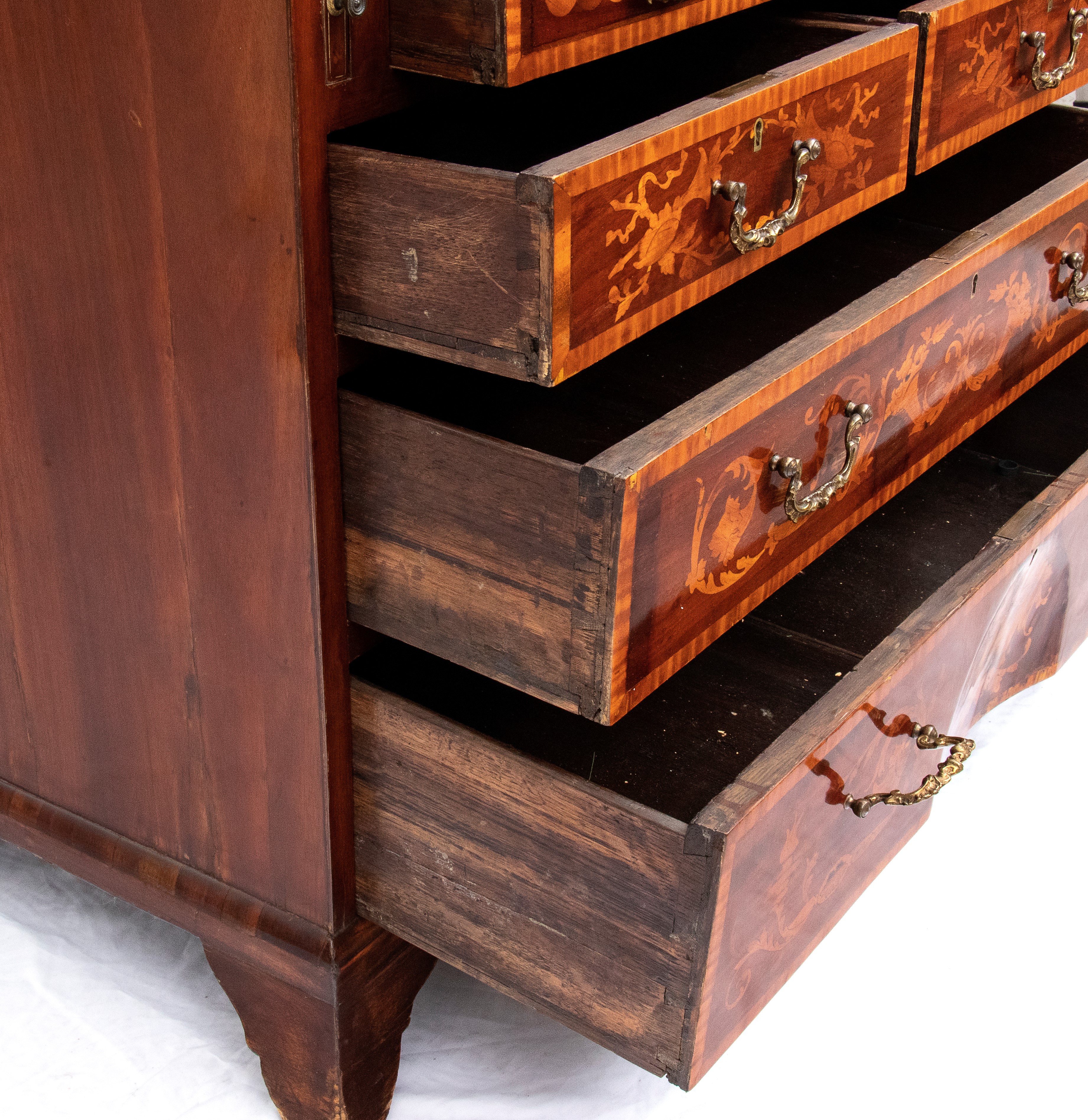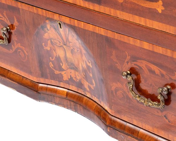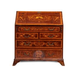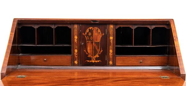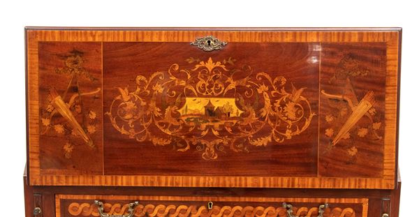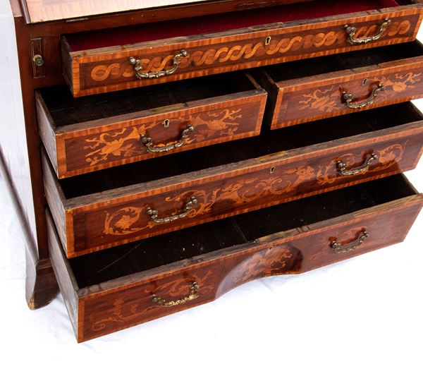 a fronte mosso con piano scrittoio ribaltabile e quattro cassetti sottostanti. Realizzata in legno di mogano, piuma di mogano, satinwood e legni di frutto. Intarsi a motivi floreali, musicali e architettonici. Maniglie in bronzo. Piedi a sciabola e ultimo cassetto con parte centrale concava.