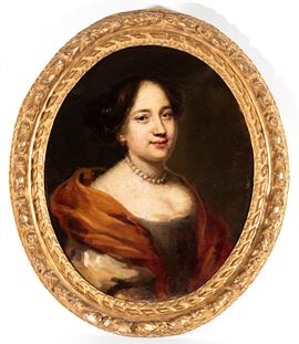 olio su tela, personaggio femminile di tre quarti, cornice intagliata e dorata coeva e lavorata.