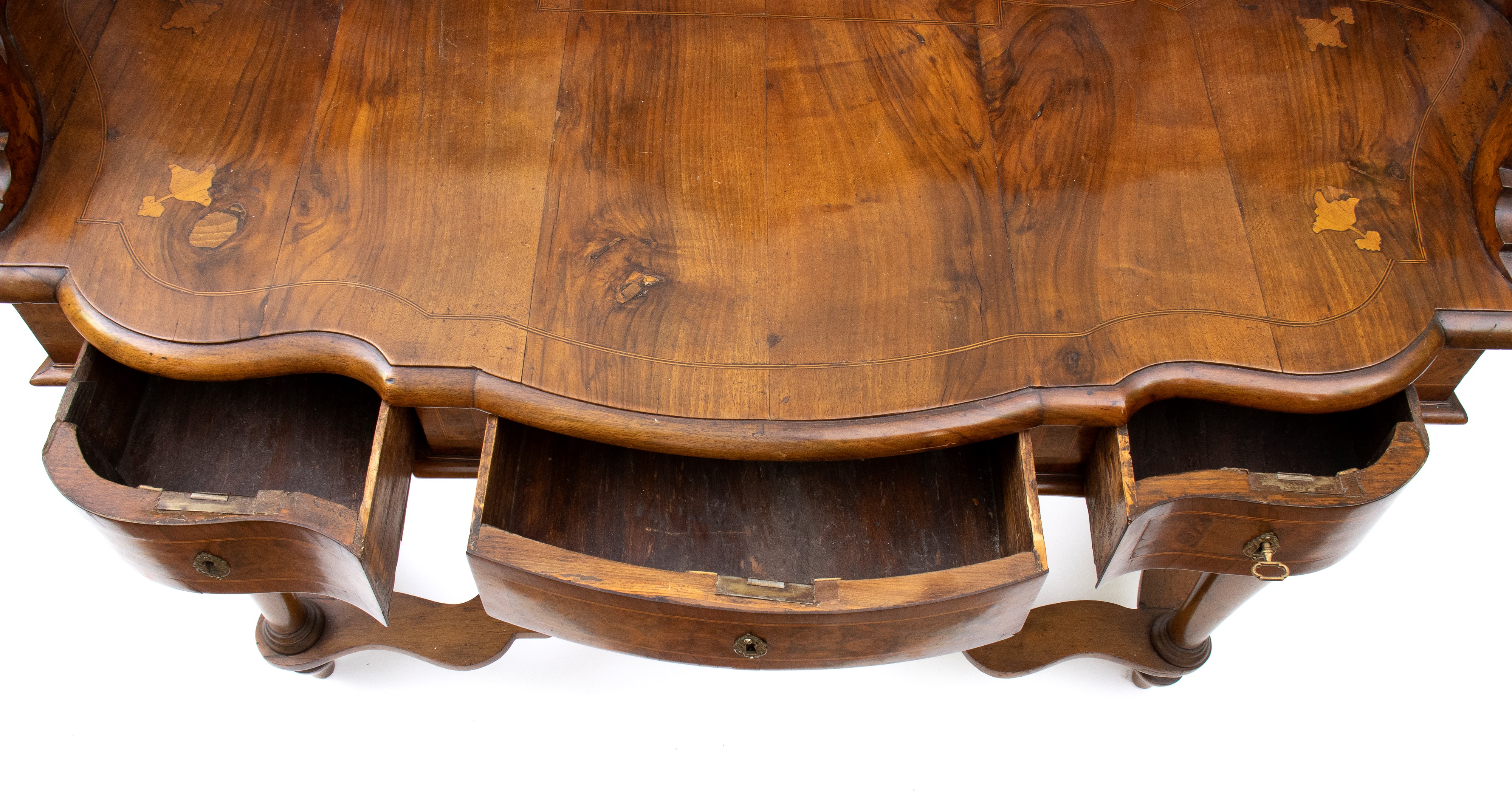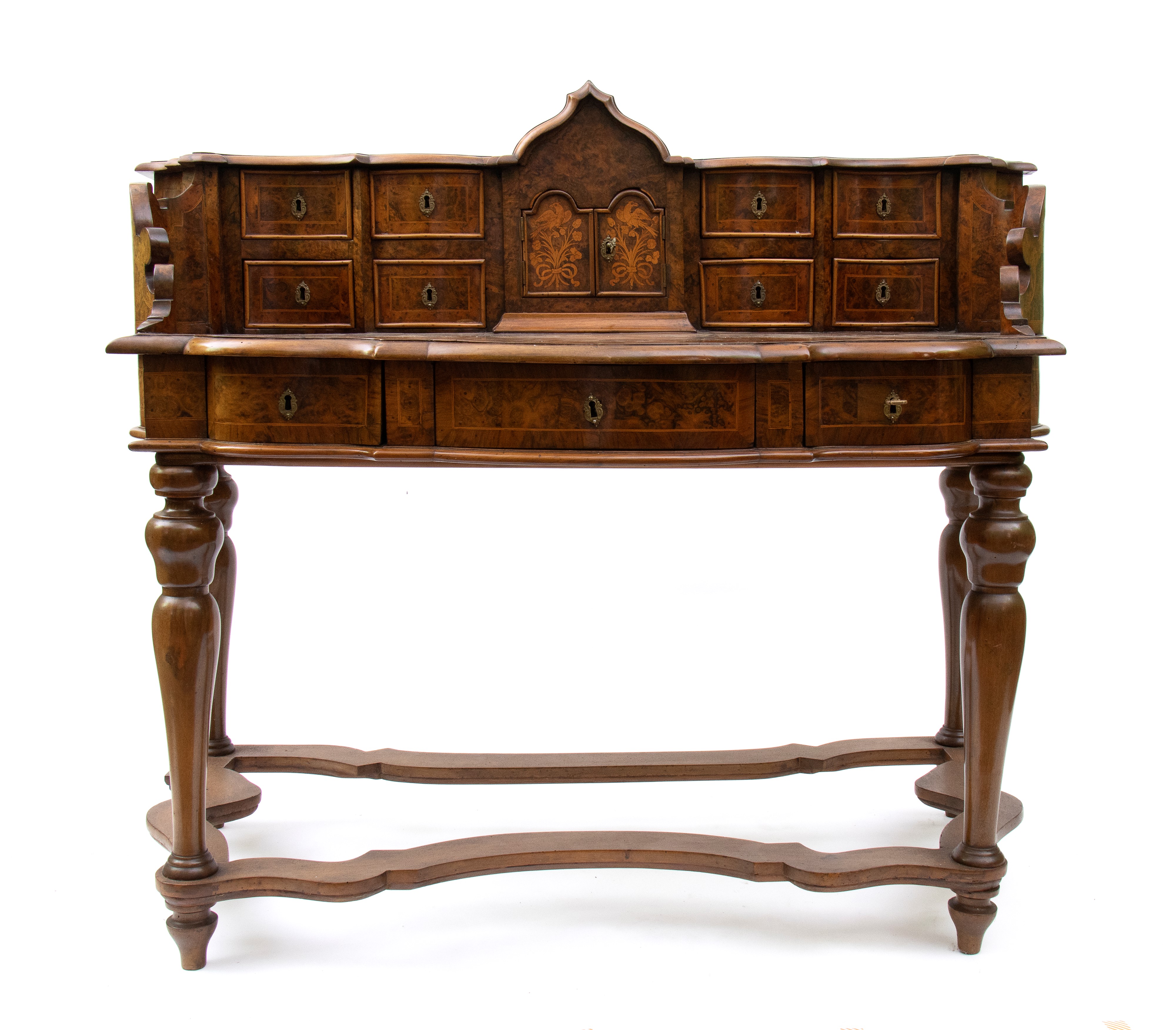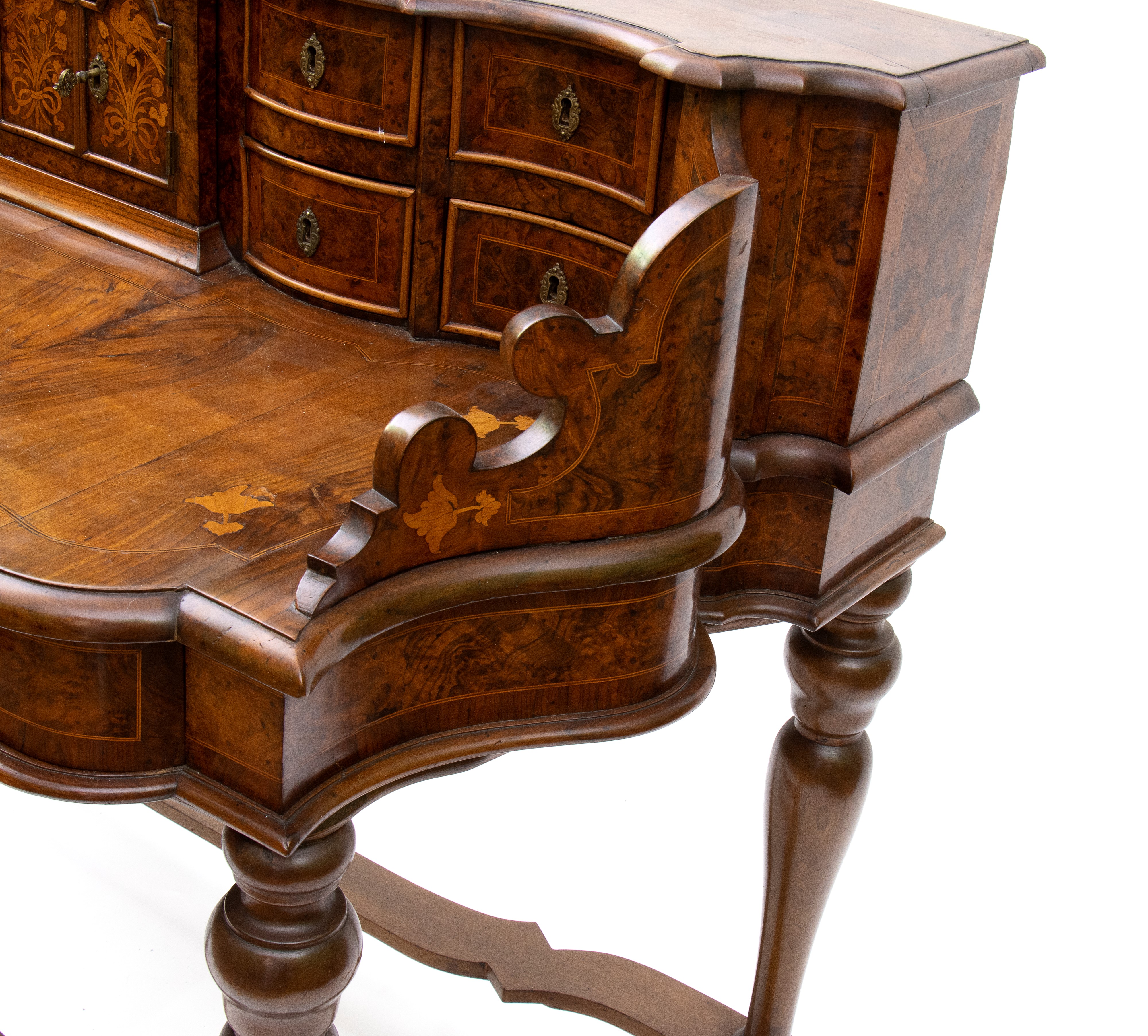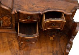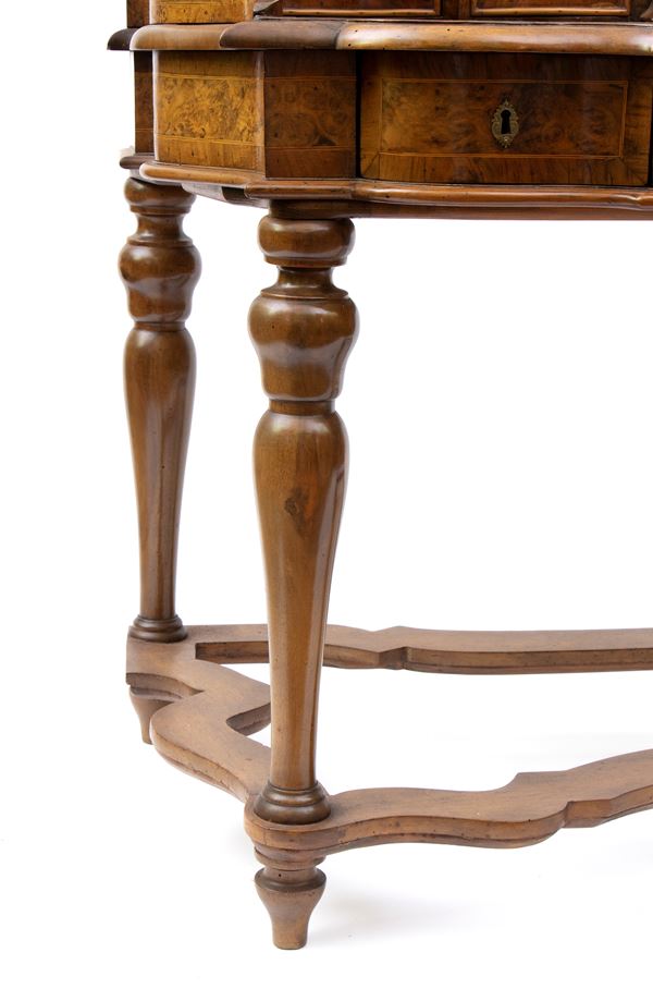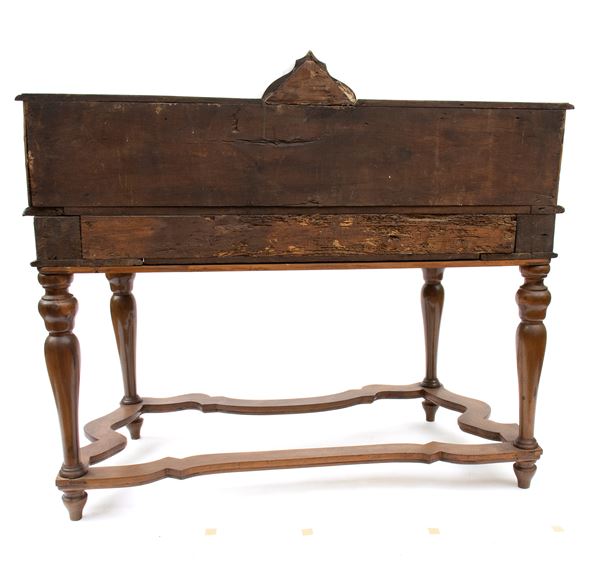 in radica di noce e noce massello, intarsi in legni di frutto. Piano con alzata a più cassetti, sorretta da gambe tornite riunite da traversa sagomata. Ferramenta originale e coeva al periodo fine XVII inizi XVIII secolo.