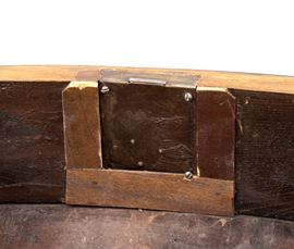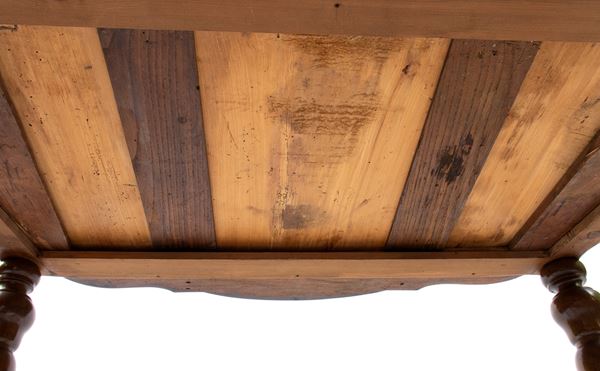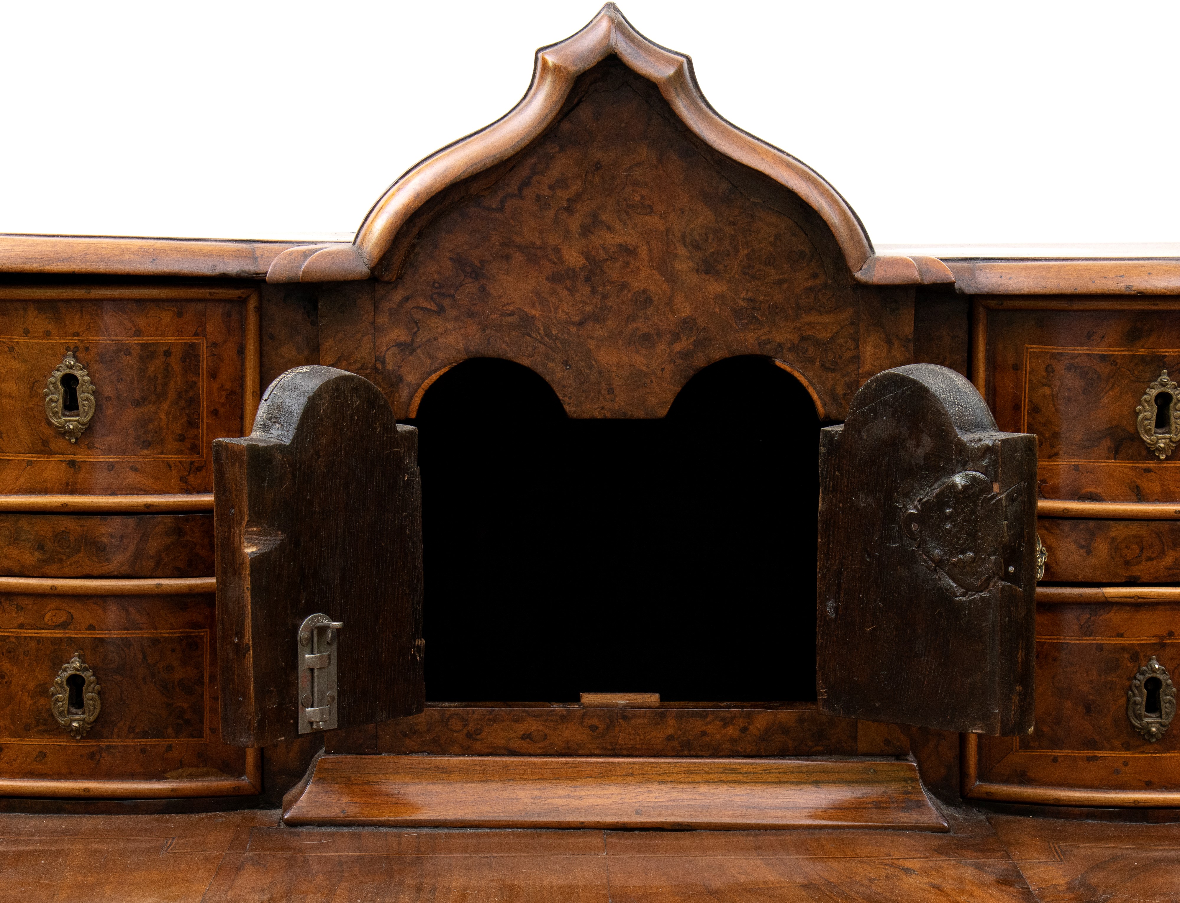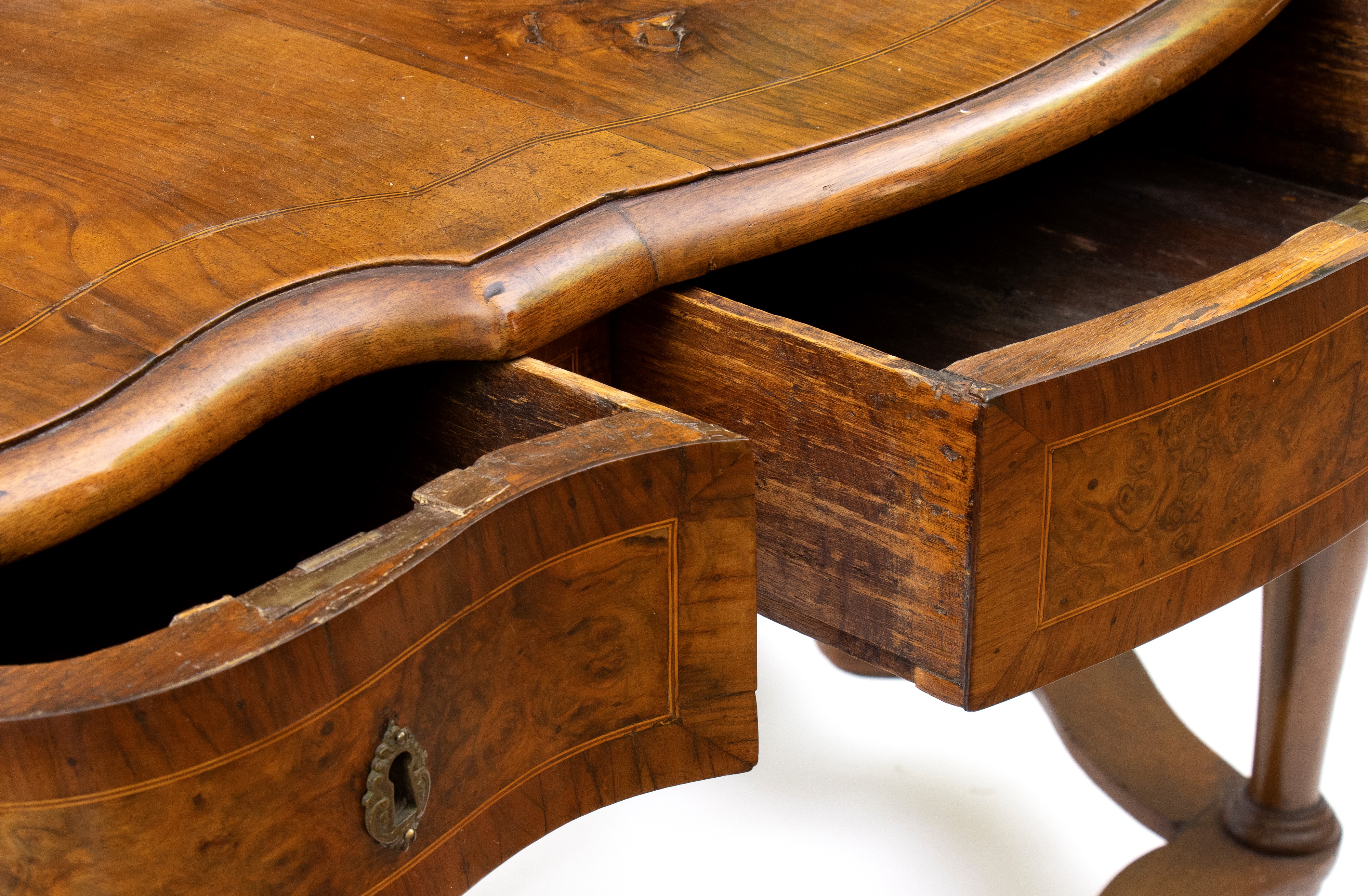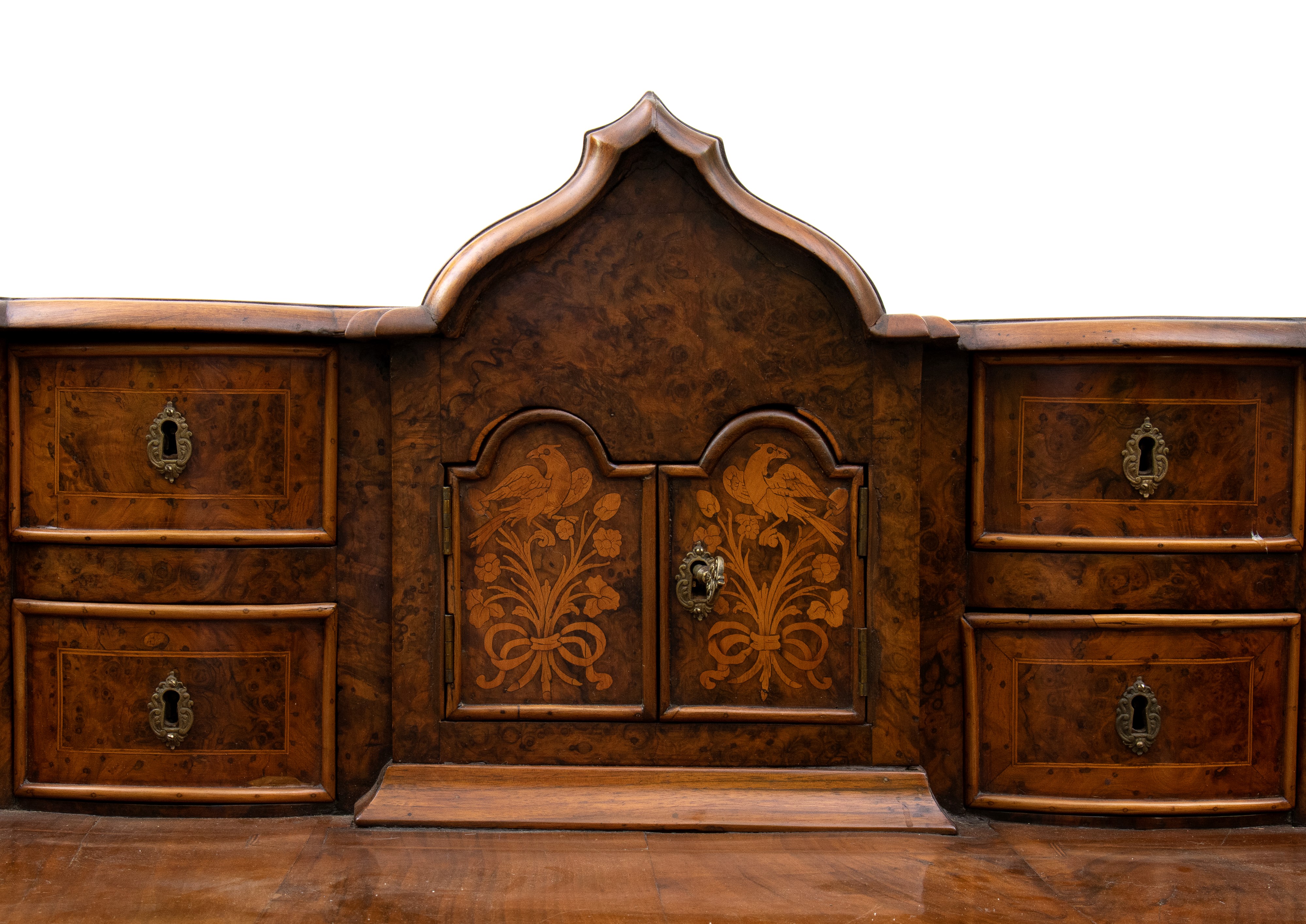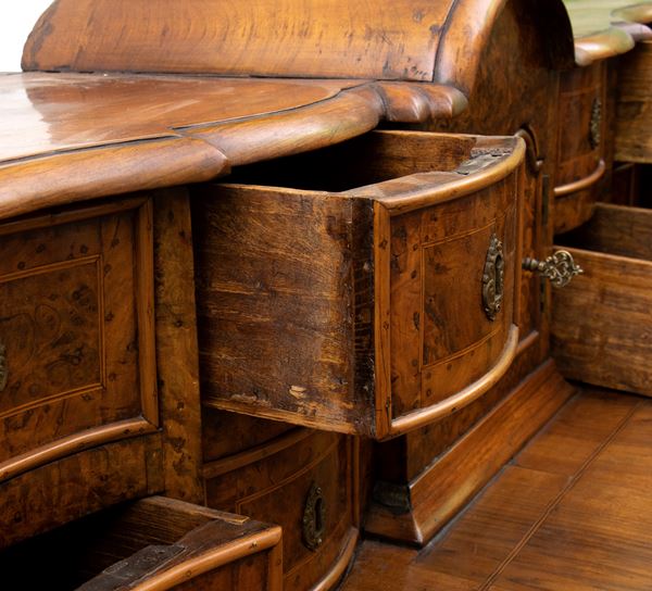 in radica di noce e noce massello, intarsi in legni di frutto. Piano con alzata a più cassetti, sorretta da gambe tornite riunite da traversa sagomata. Ferramenta originale e coeva al periodo fine XVII inizi XVIII secolo.