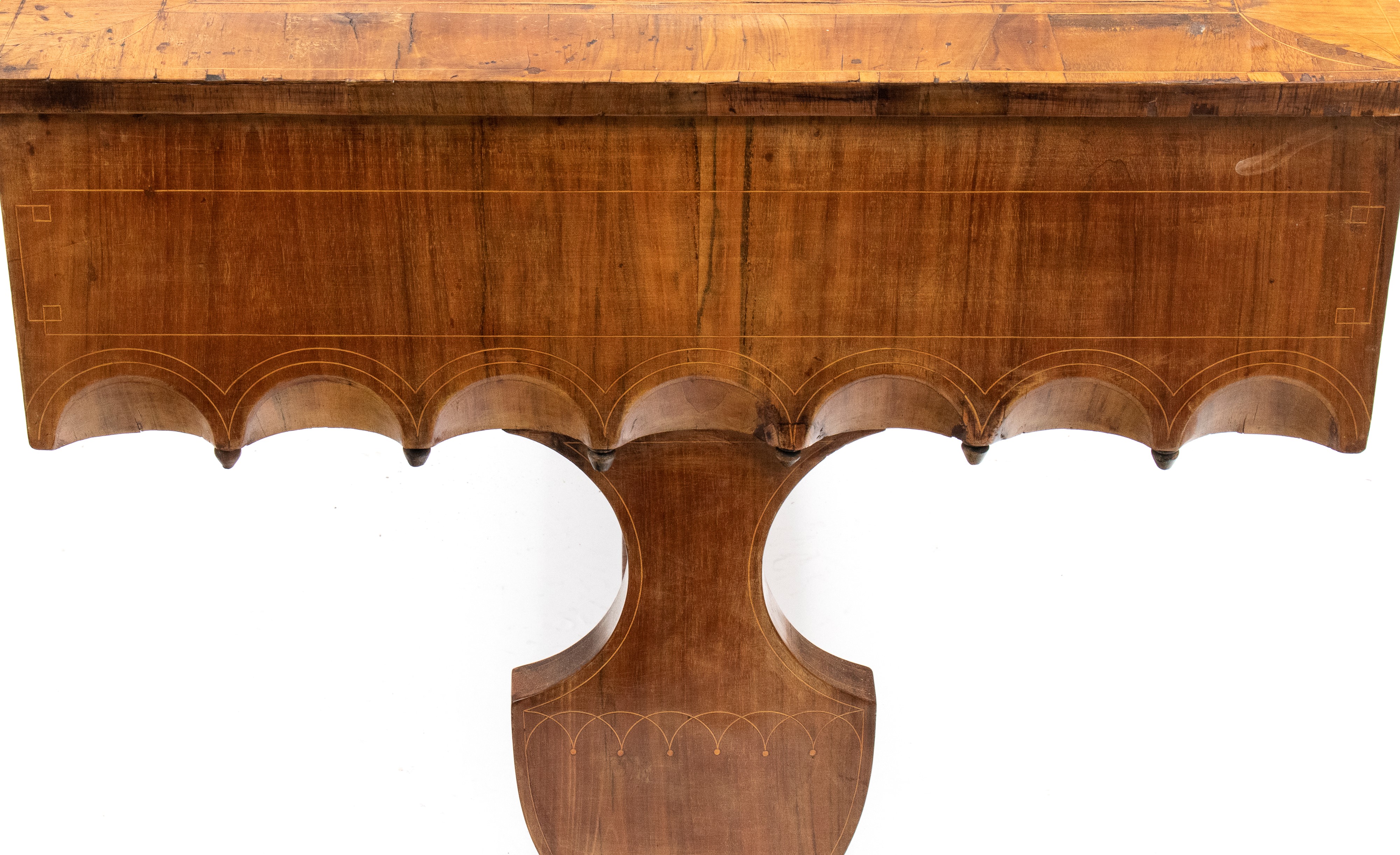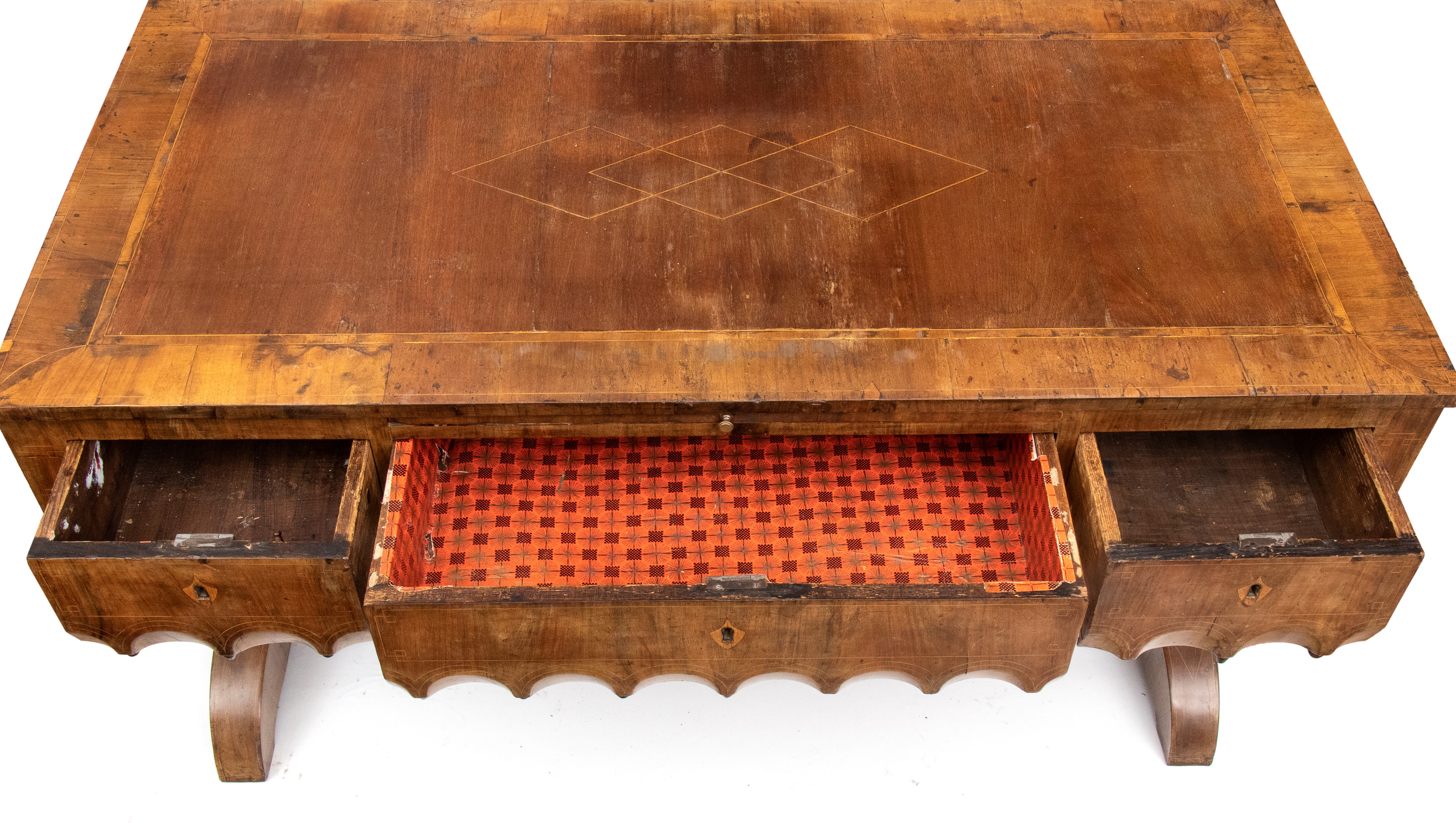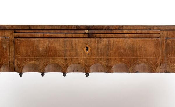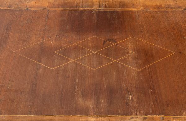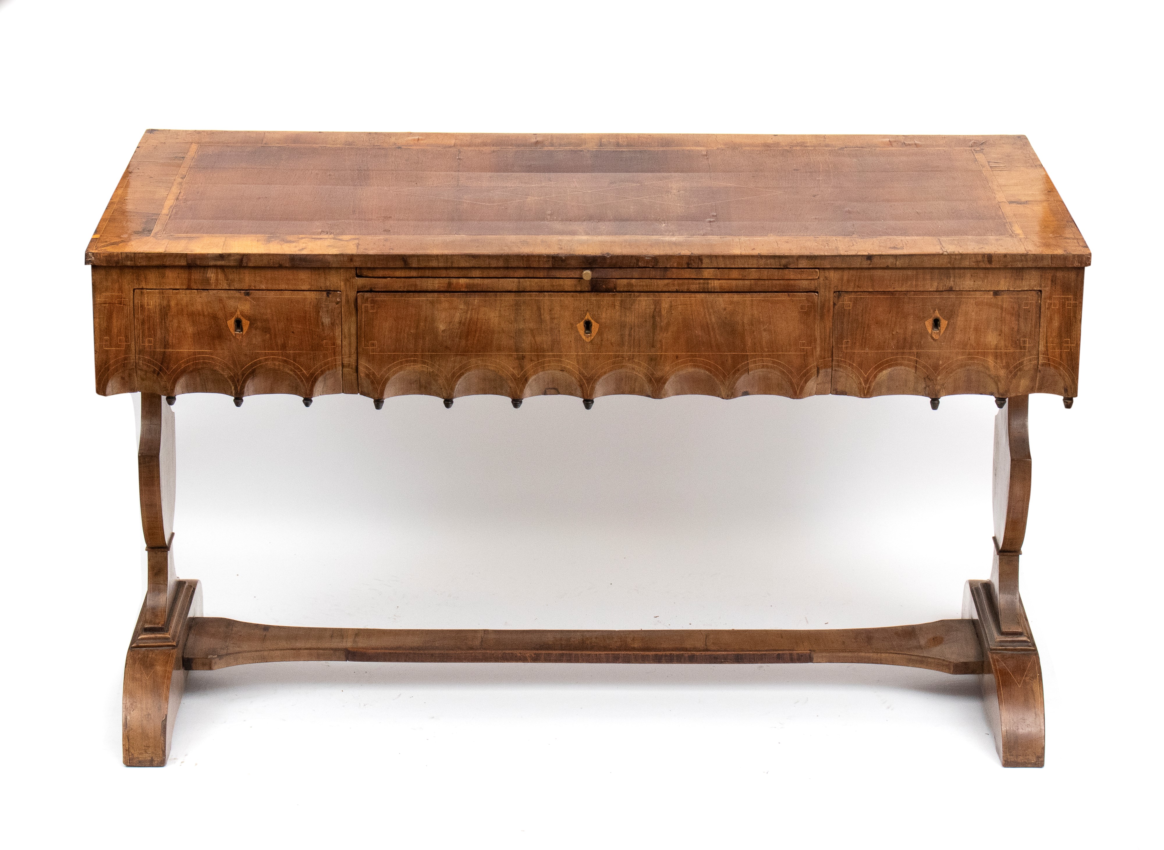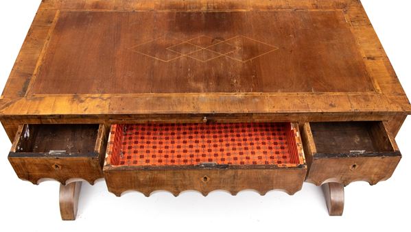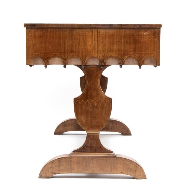 impreziosita da filettature in legno chiaro a motivi geometrici. Tre cassetti sul fronte con decoro a archi intrecciati, piano estraibile sopra il cassetto centrale, gambe sagomate e collegate da traversa piatta a forma di "H". Piano intarsiato.