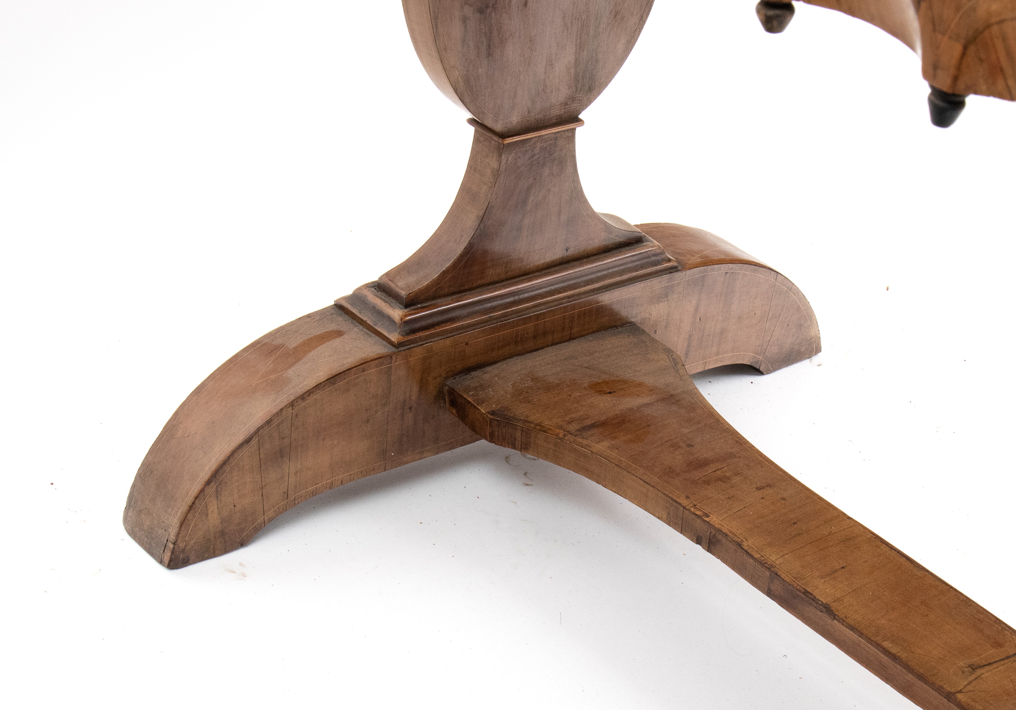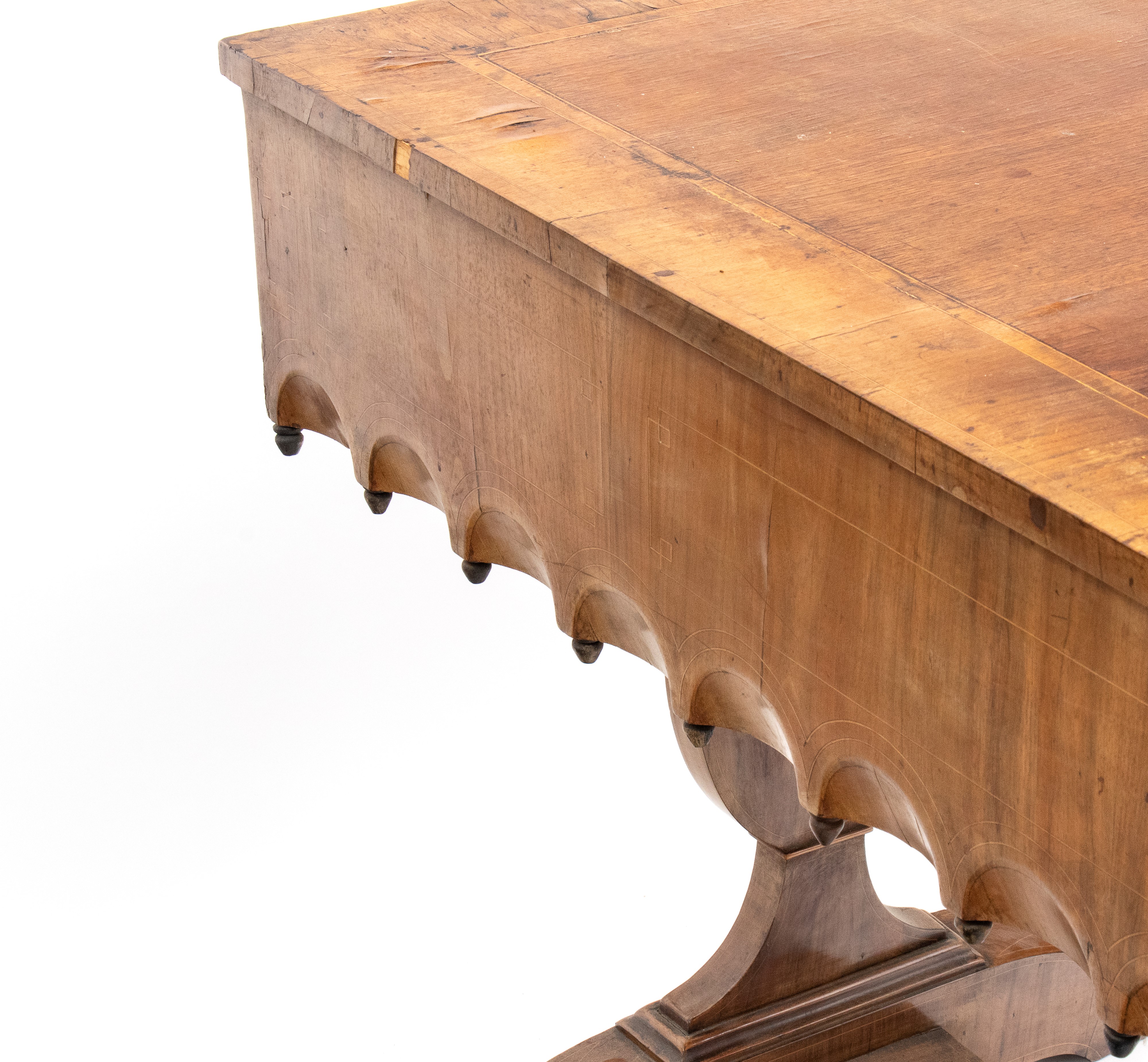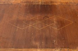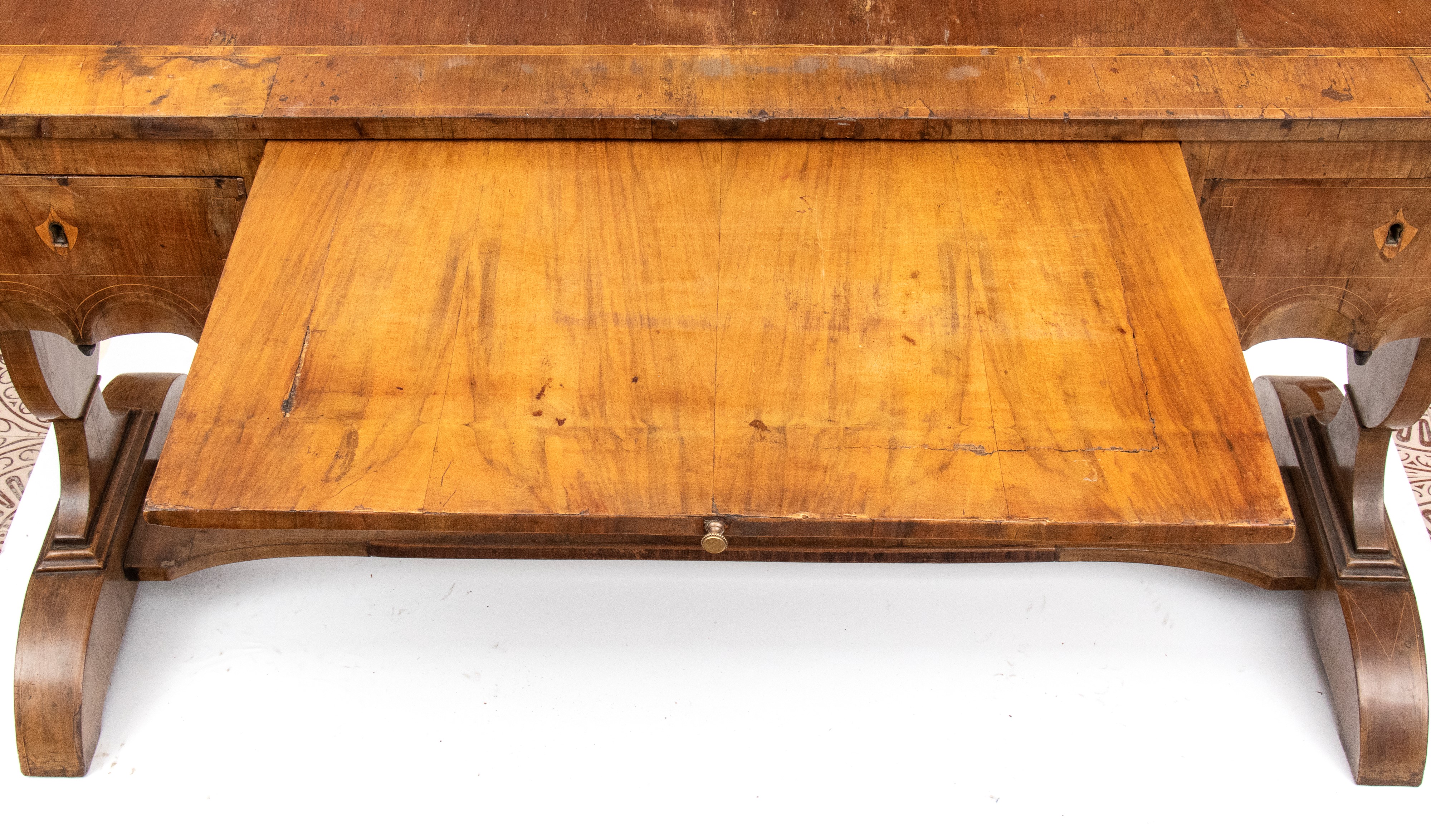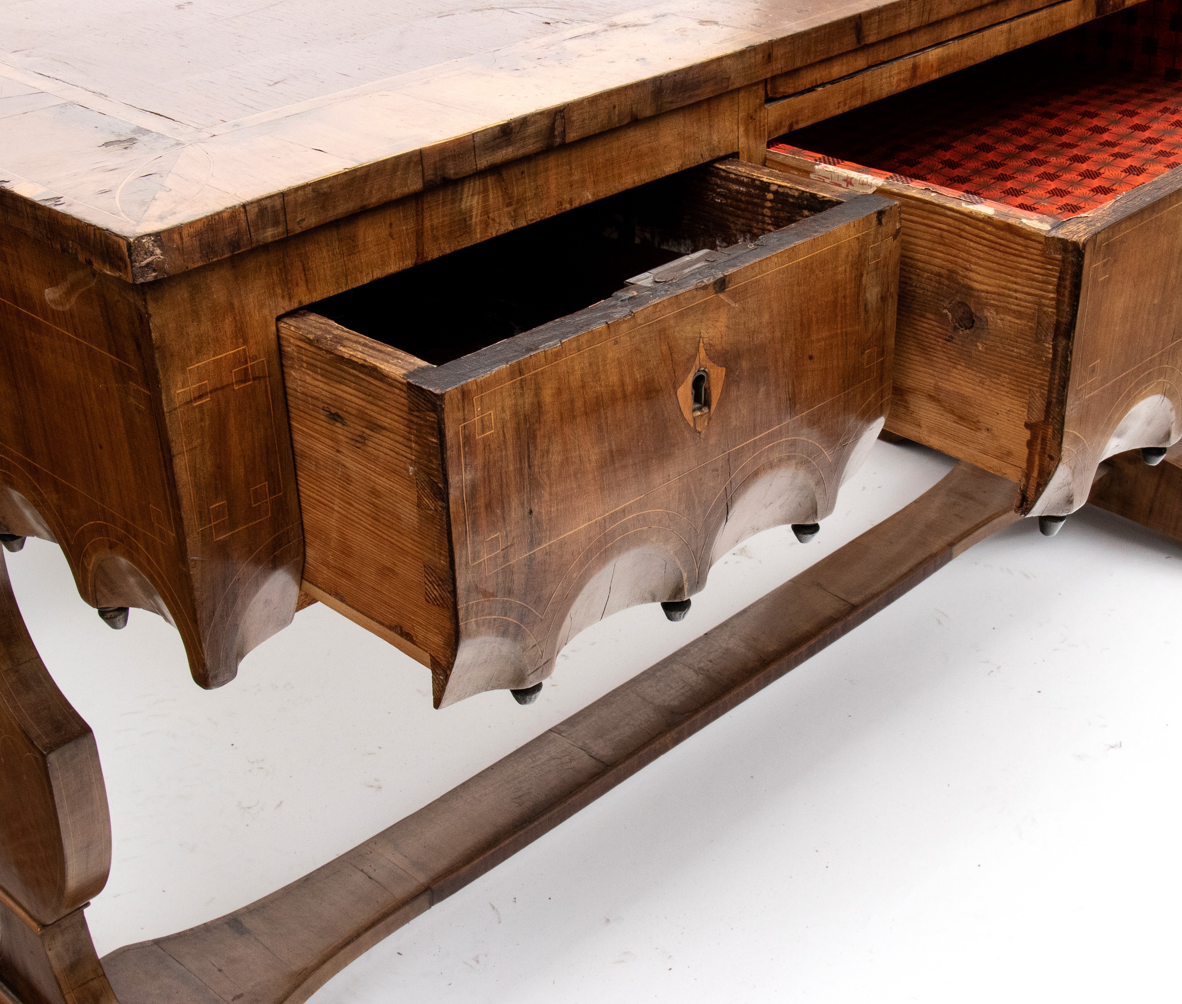 impreziosita da filettature in legno chiaro a motivi geometrici. Tre cassetti sul fronte con decoro a archi intrecciati, piano estraibile sopra il cassetto centrale, gambe sagomate e collegate da traversa piatta a forma di "H". Piano intarsiato.