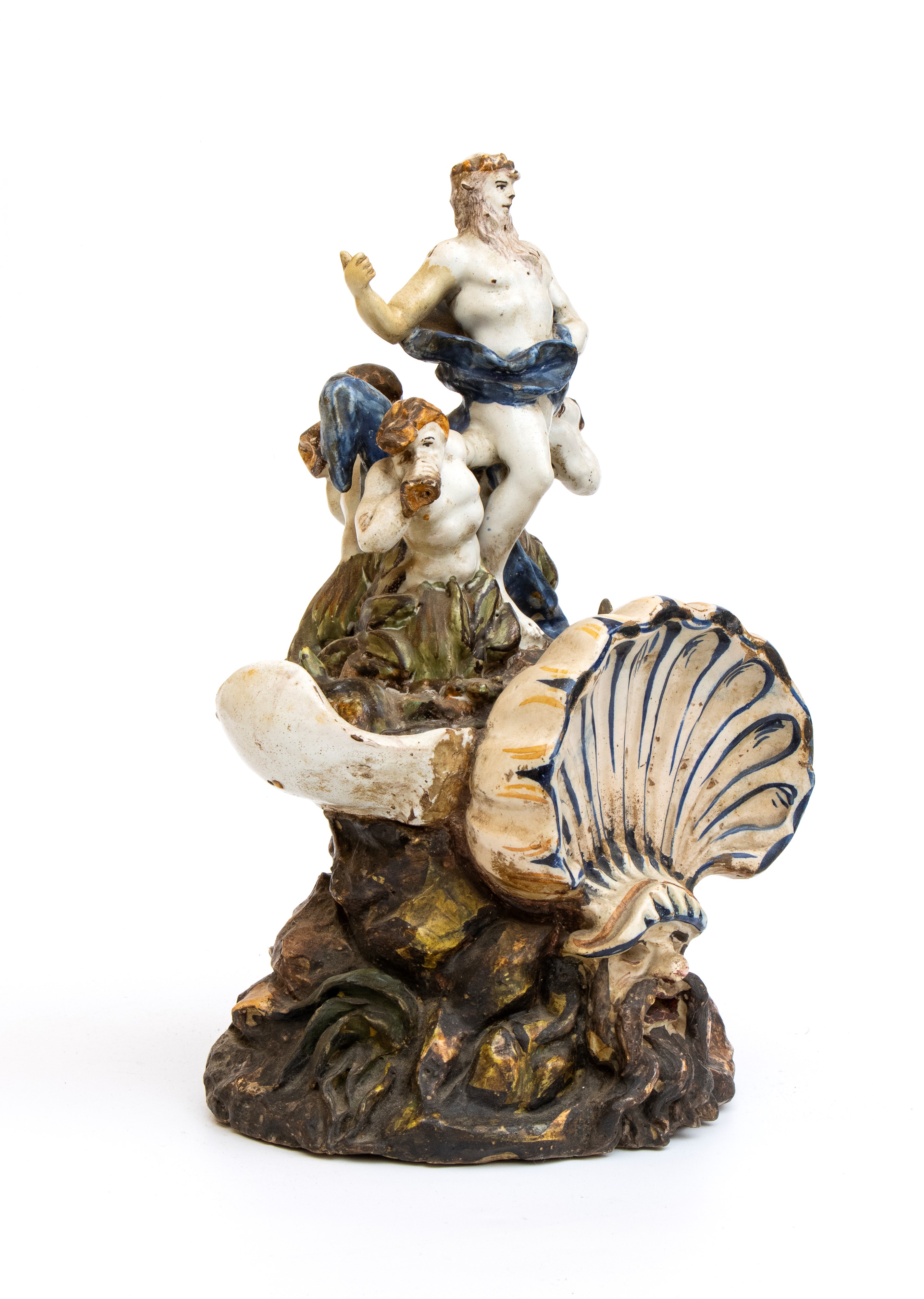 scultura policroma raffigurante Nettuno, dio del mare, in piedi su una grande conchiglia sostenuta da due tritoni che soffiano nelle conchiglie. La base è decorata con una maschera virile barbuta in rilievo. Scultura di gusto barocco.