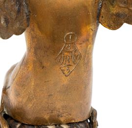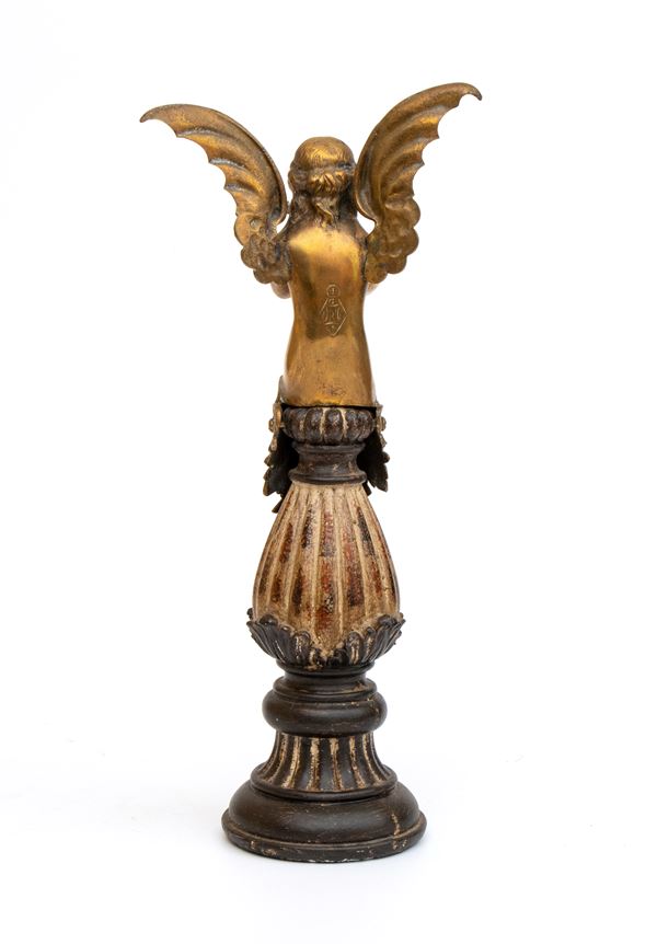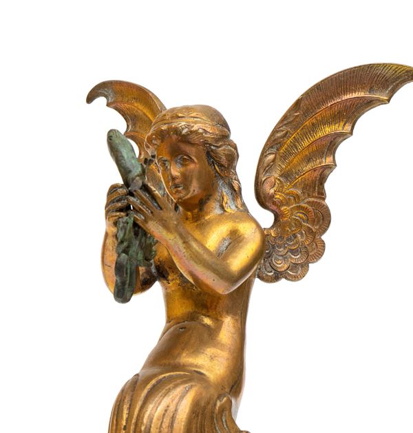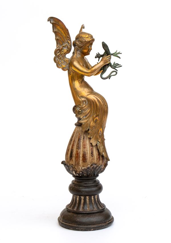 in bronzo dorato, raffigurante una figura fantastica femminile alata, con sembianze di fata o ninfa, seduta su base decorativa che tiene una lucertola tra le mani. Sulla schiena è inciso il "Diamond mark", marchio di registro inglese dal quale risulta che il modello è stato registratoto nel 1863.