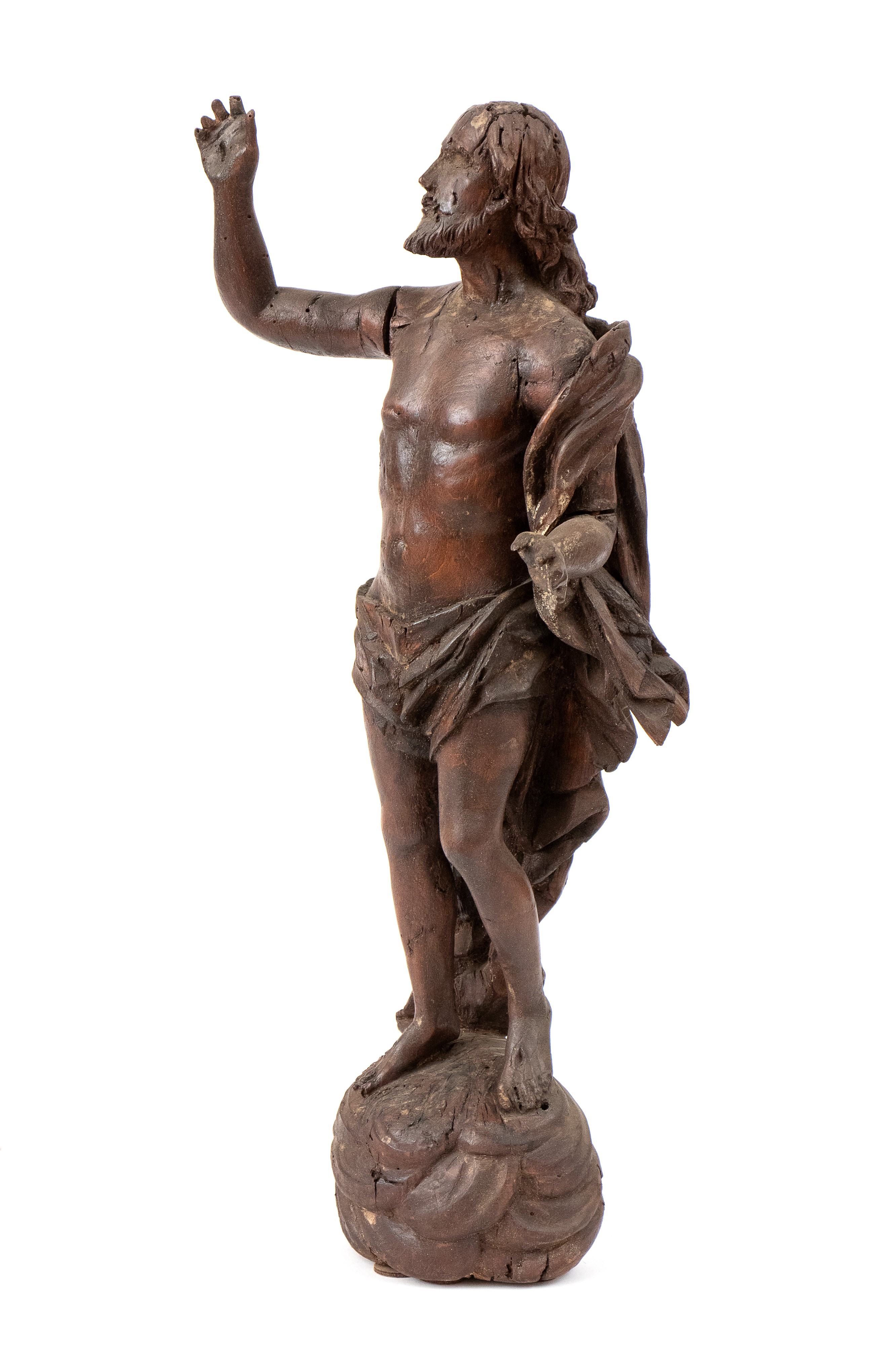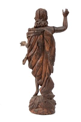 Il volto della figura ha una barba e capelli ondulati, rafforzando la tipica iconografia di Cristo. Il basamento, scolpito in modo irregolare, potrebbe rappresentare una roccia o una nuvola, alludendo alla resurrezione e all'ascensione.