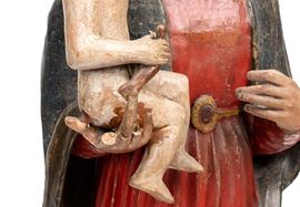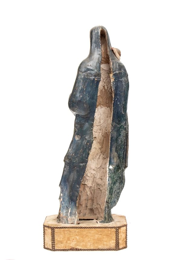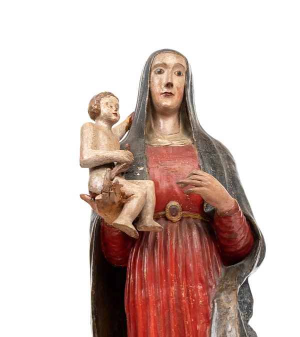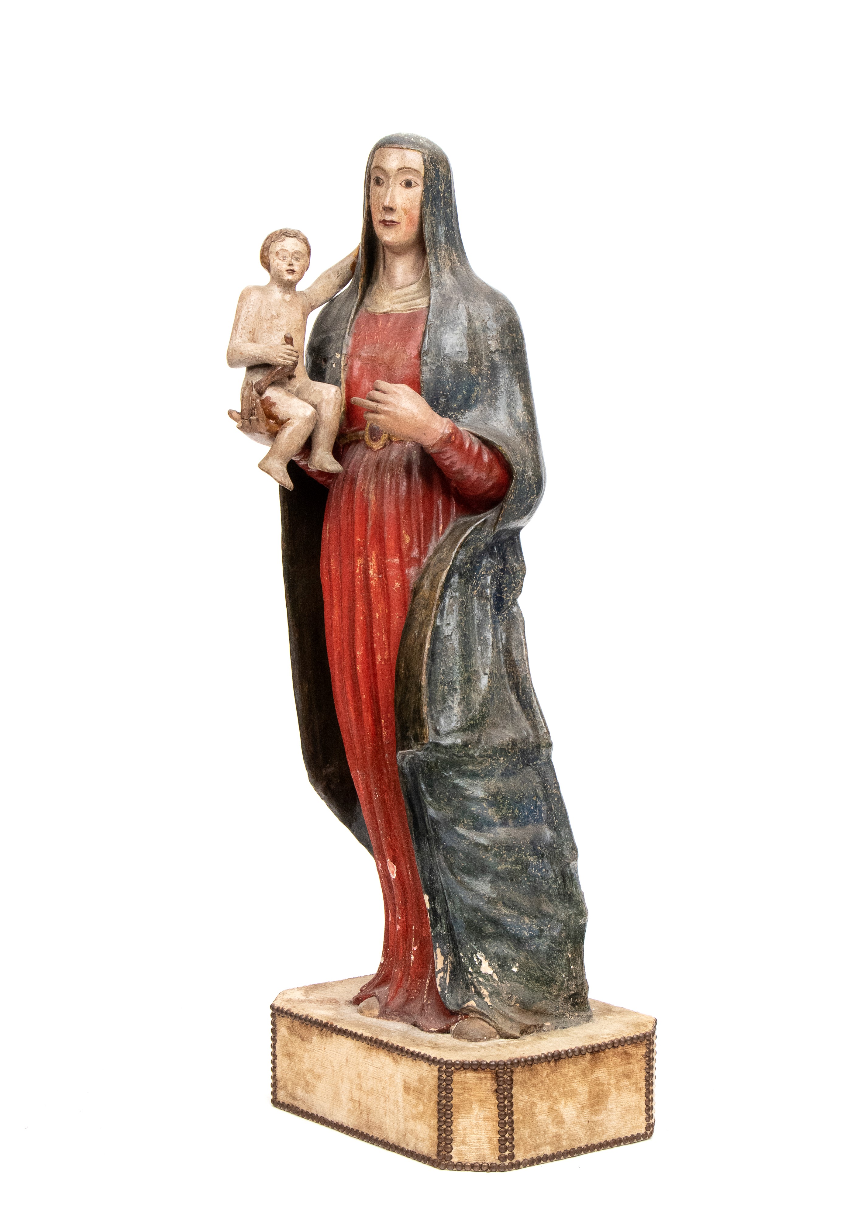 raffigurante la Vergine Maria in una posa stante, che sorregge il Bambino Gesù sul fianco destro. La scultura poggia su un plinto ottagonale decorato. La Madonna è avvolta in un ricco drappeggio, indossa una tunica interna di un rosso intenso, sulle spalle è presente un manto ampio di colore blu scuro che copre il capo. Il volto della Vergine è idealizzato, con uno sguardo fisso e un'espressione composta. Il Bambino Gesù è raffigurato nudo, con un modellato semplice che evoca la sua tenera età. La sua figura è saldamente sorretta dal braccio destro di Maria.