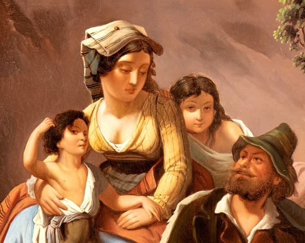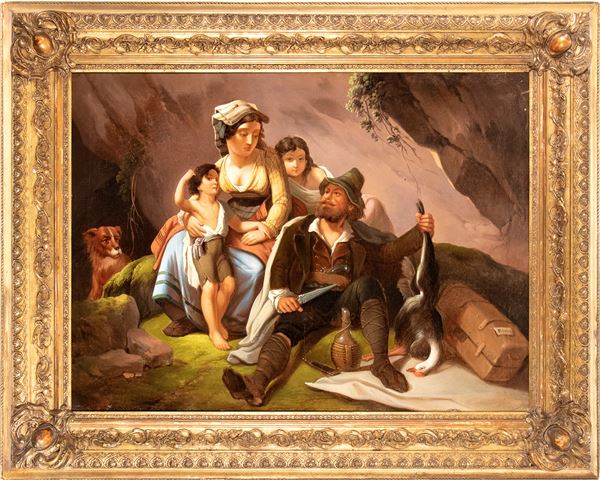 Quest’opera di raffinata esecuzione, attribuibile alla cerchia o alla maniera di Georg Waldmüller, raffigura una scena familiare ambientata in un paesaggio roccioso, con un cacciatore che mostra orgogliosamente una preda — una grossa oca selvatica — alla moglie e ai figli. La composizione è caratterizzata da una resa luministica calda e naturalistica, tipica del Biedermeier viennese, e da una cura quasi fotografica nel descrivere i dettagli del vestiario, delle espressioni e degli oggetti quotidiani.