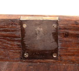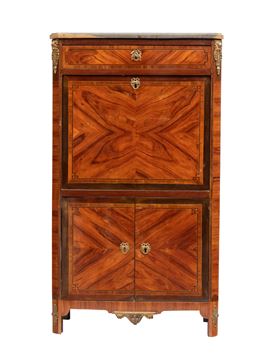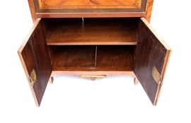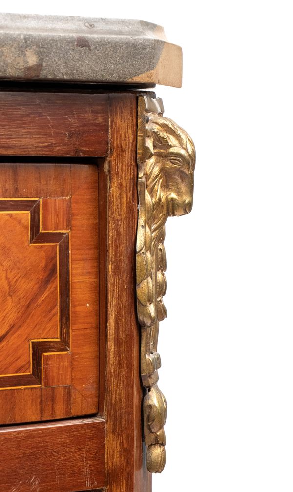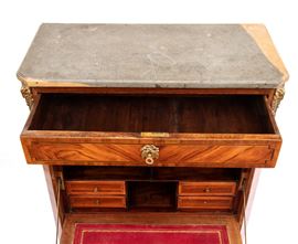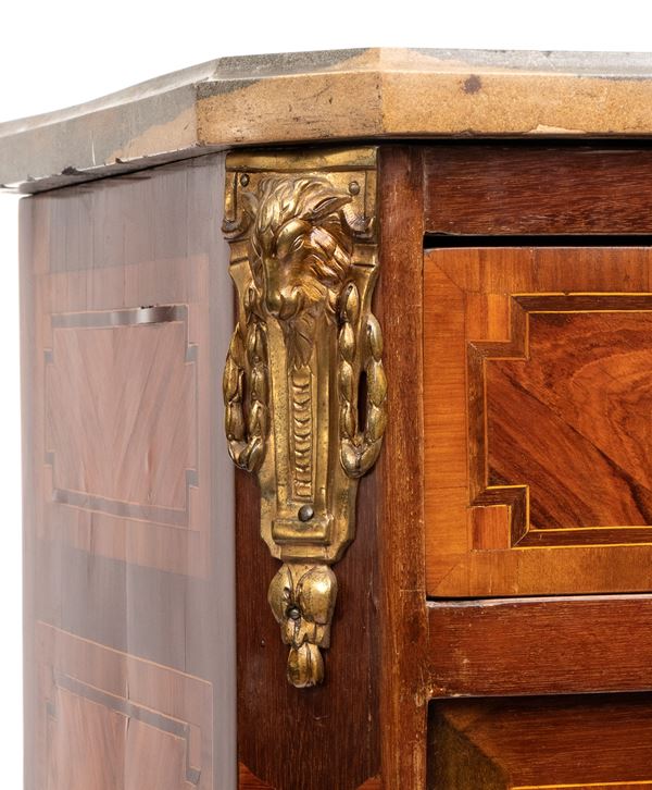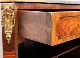 in ebano viola (Dalbergia cearensis, Ducke, 1925) intarsiato in legni di frutto a motivi geometrici, piano in marmo.
