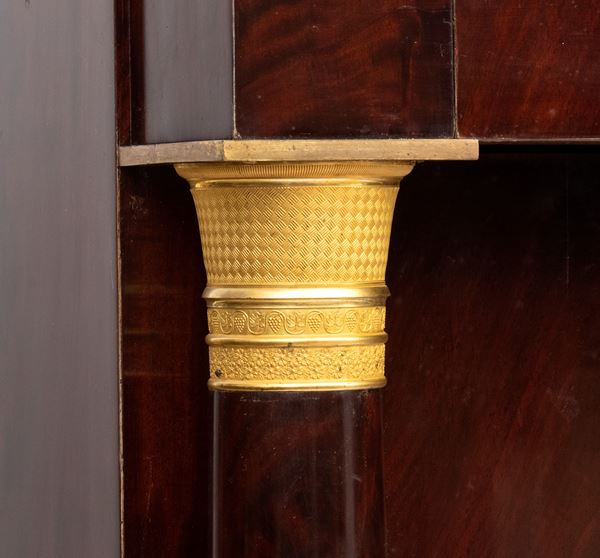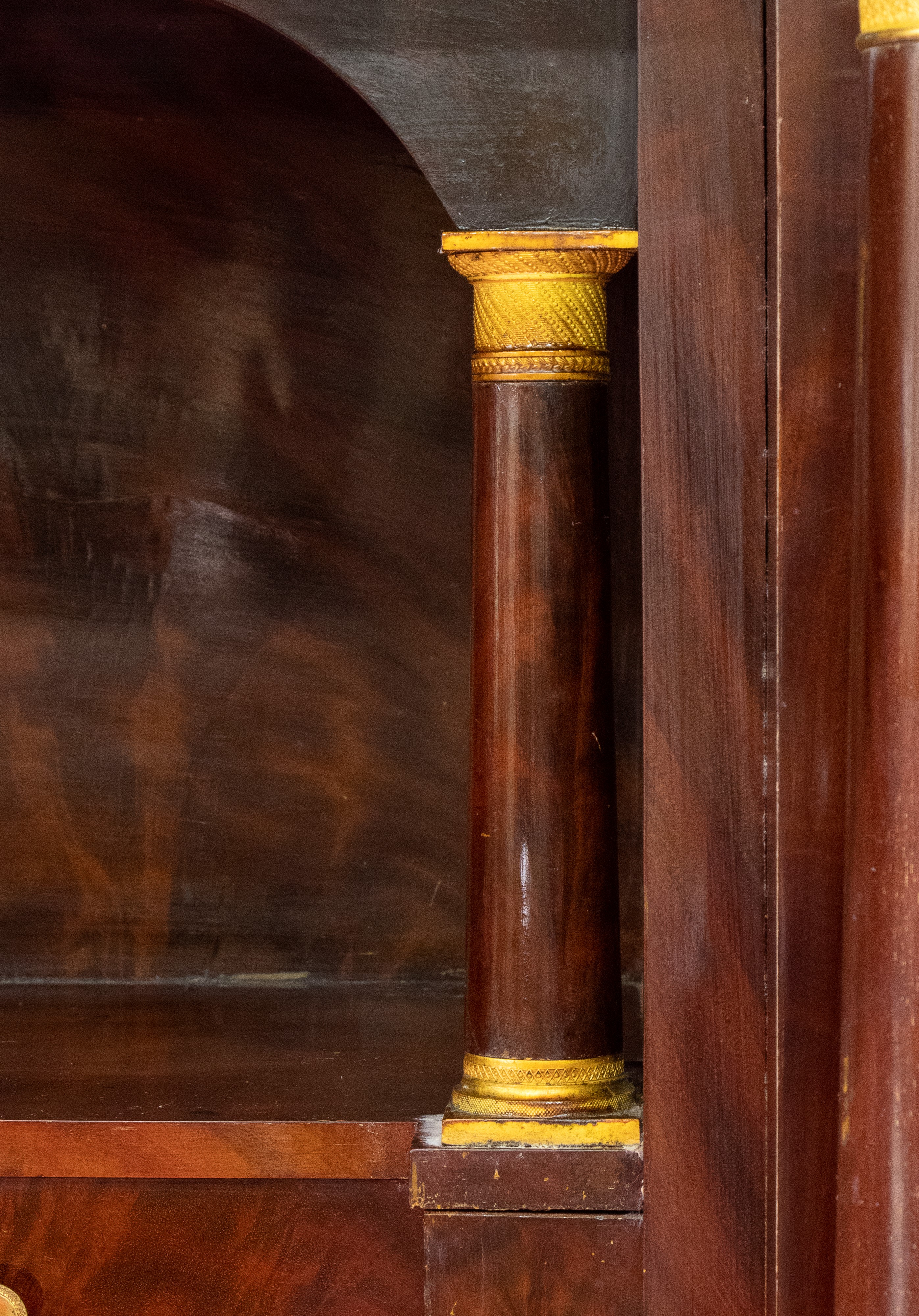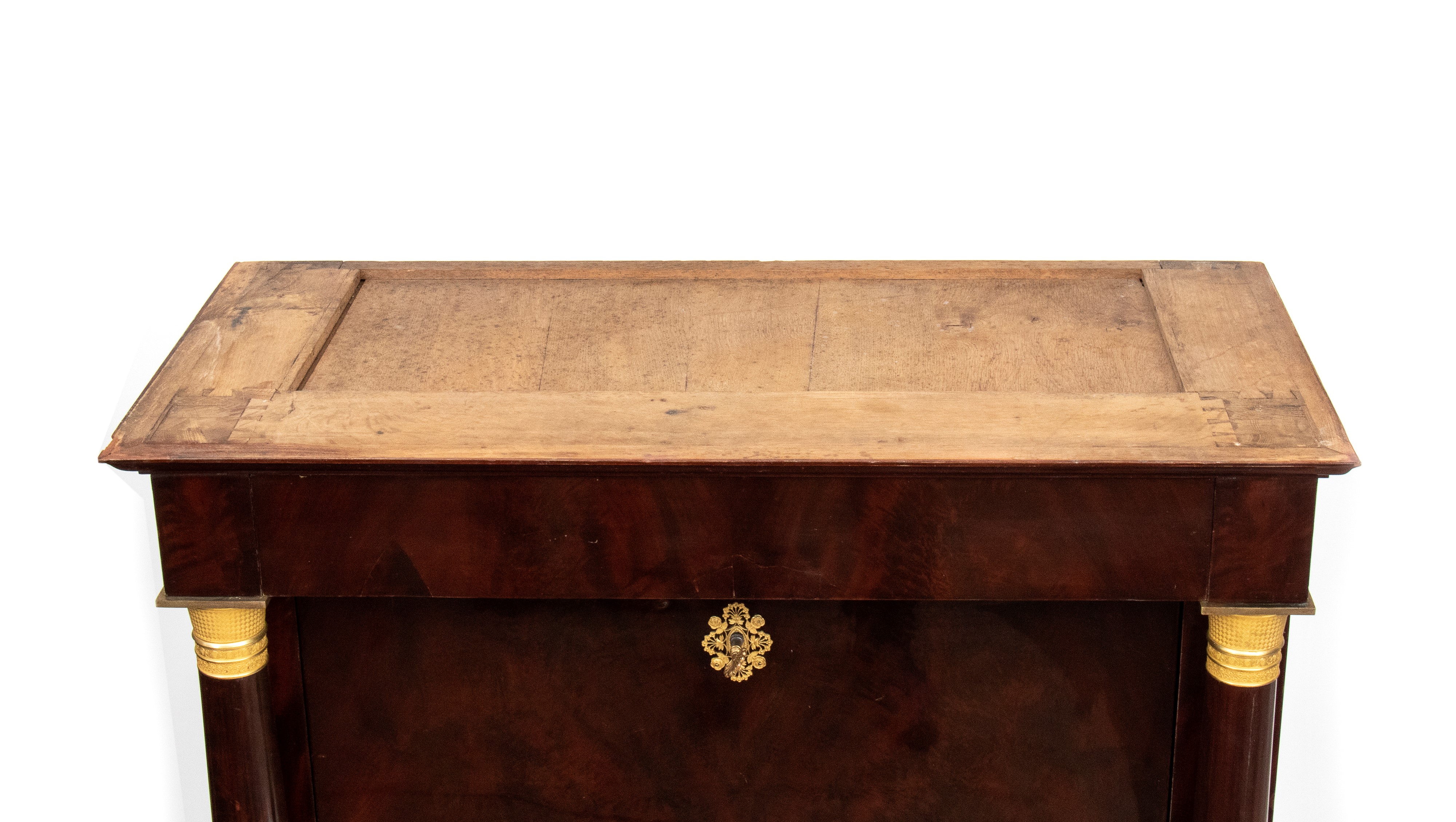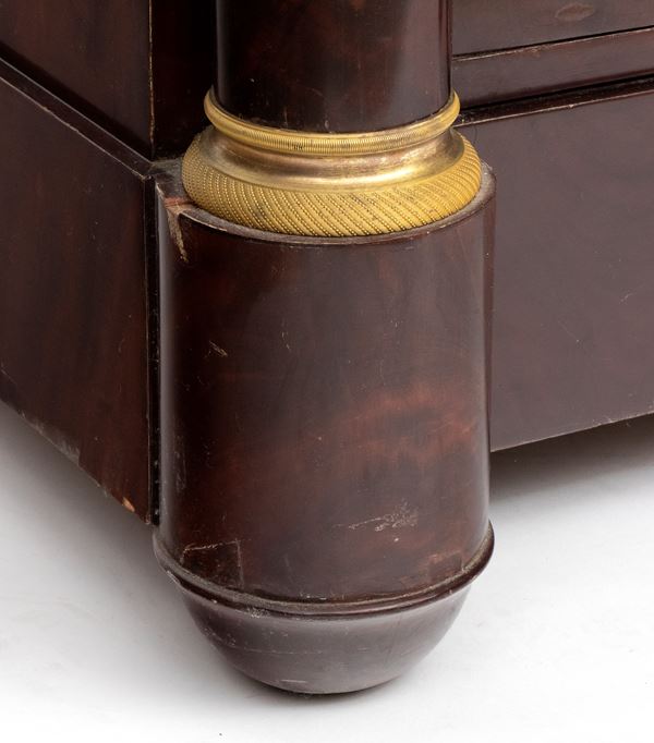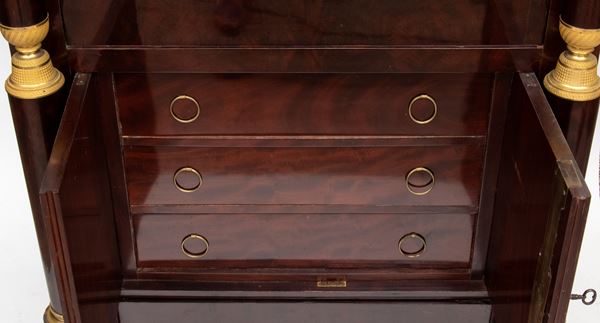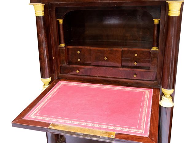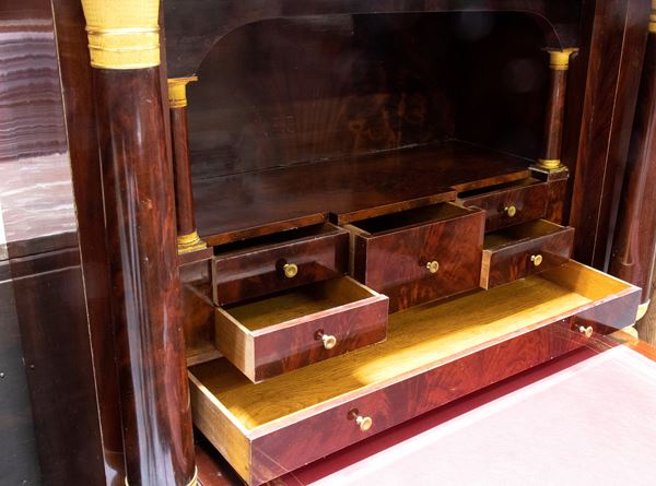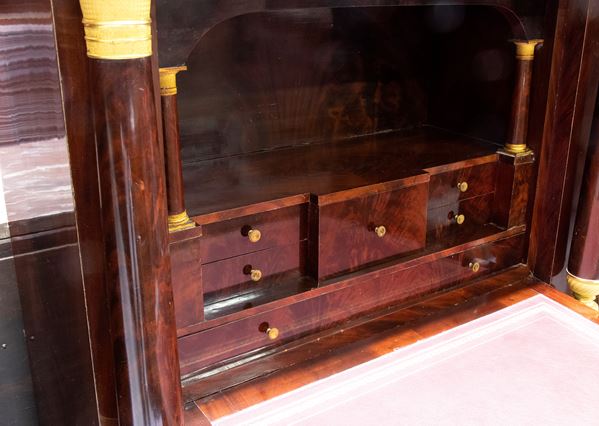 in mogano fiammato con colonne laterali a tutto tondo strozzate nella parte centralee arricchite da capitelli in bronzo dorato. Presenta ribalta frontale con interno a scrittoio, sportelli inferiori che celano tre cassetti e la fascia inferiore cela un cassetto segreto. Piano in marmo nero d'Africa.