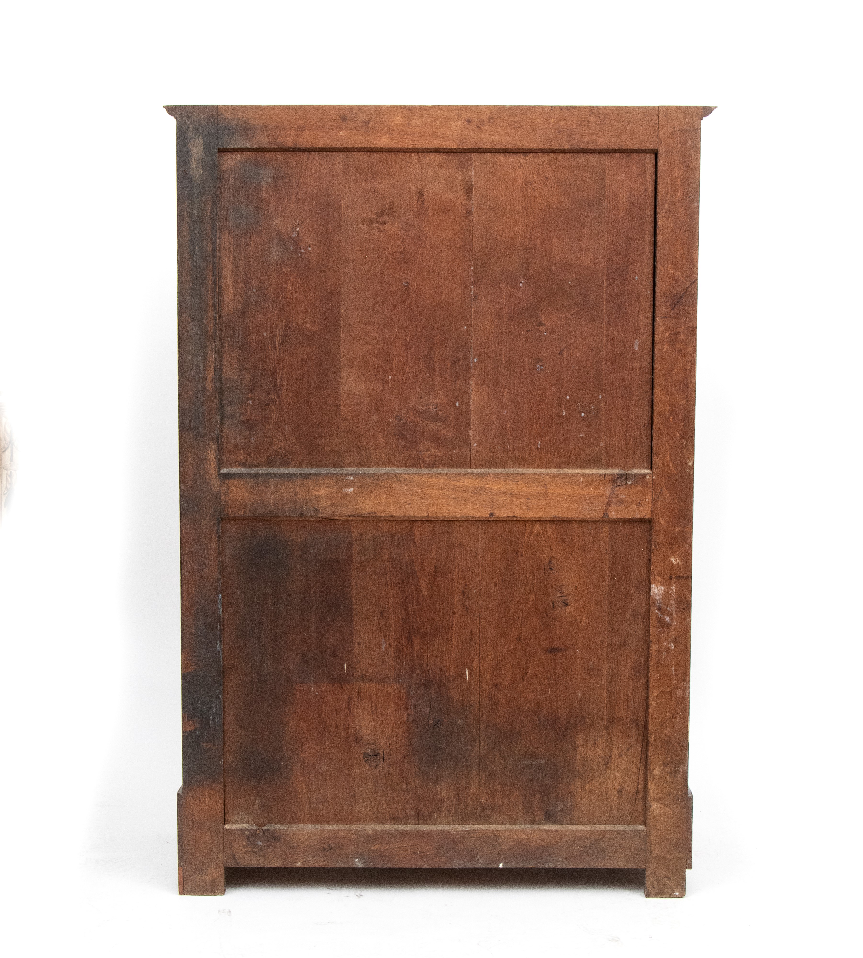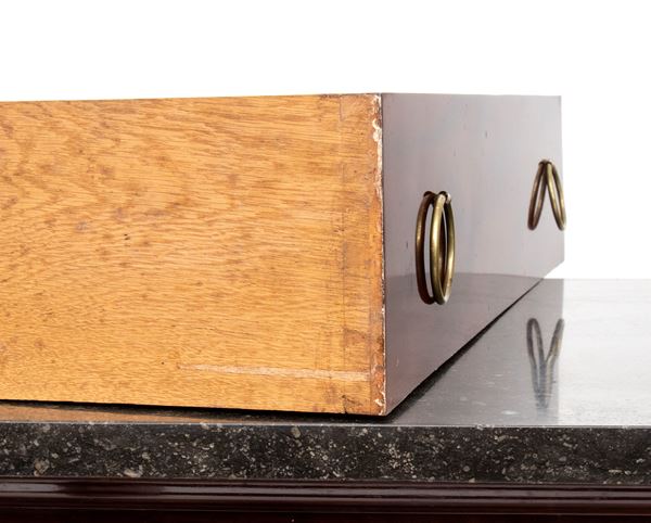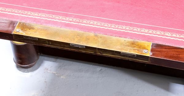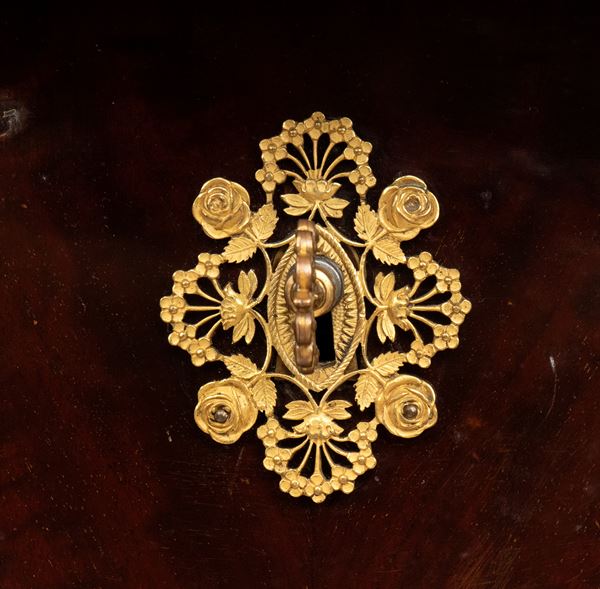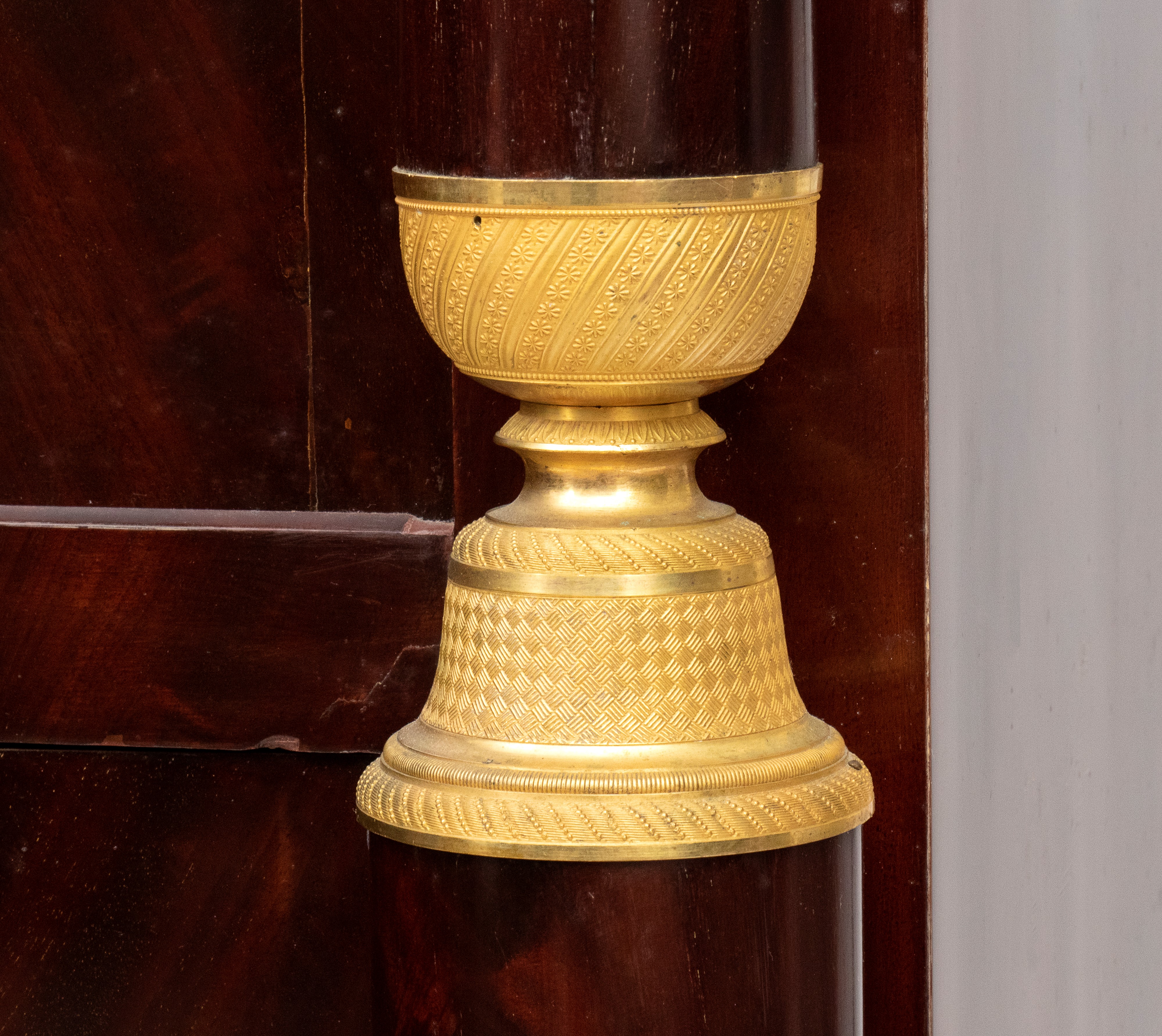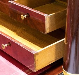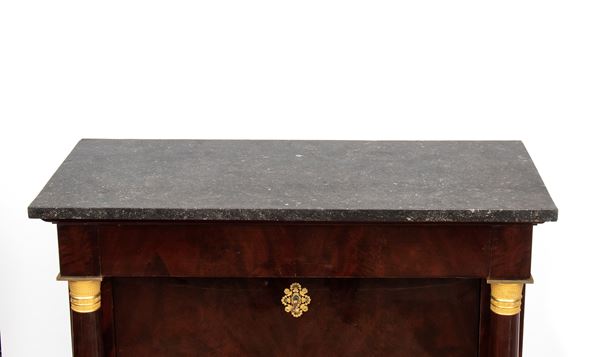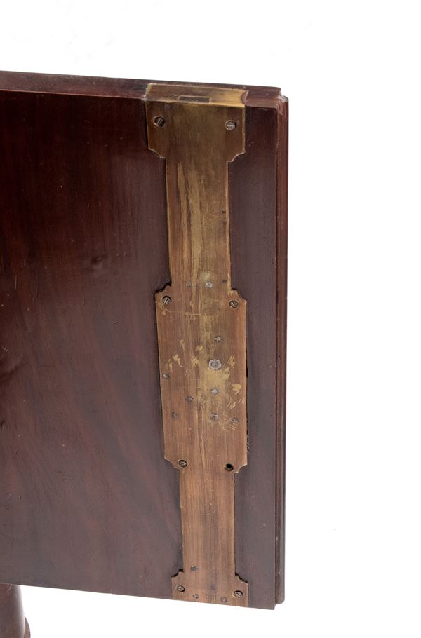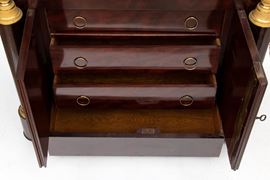 in mogano fiammato con colonne laterali a tutto tondo strozzate nella parte centralee arricchite da capitelli in bronzo dorato. Presenta ribalta frontale con interno a scrittoio, sportelli inferiori che celano tre cassetti e la fascia inferiore cela un cassetto segreto. Piano in marmo nero d'Africa.