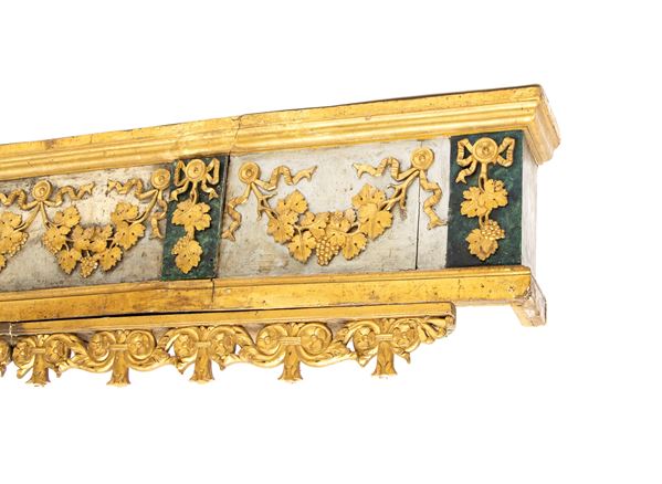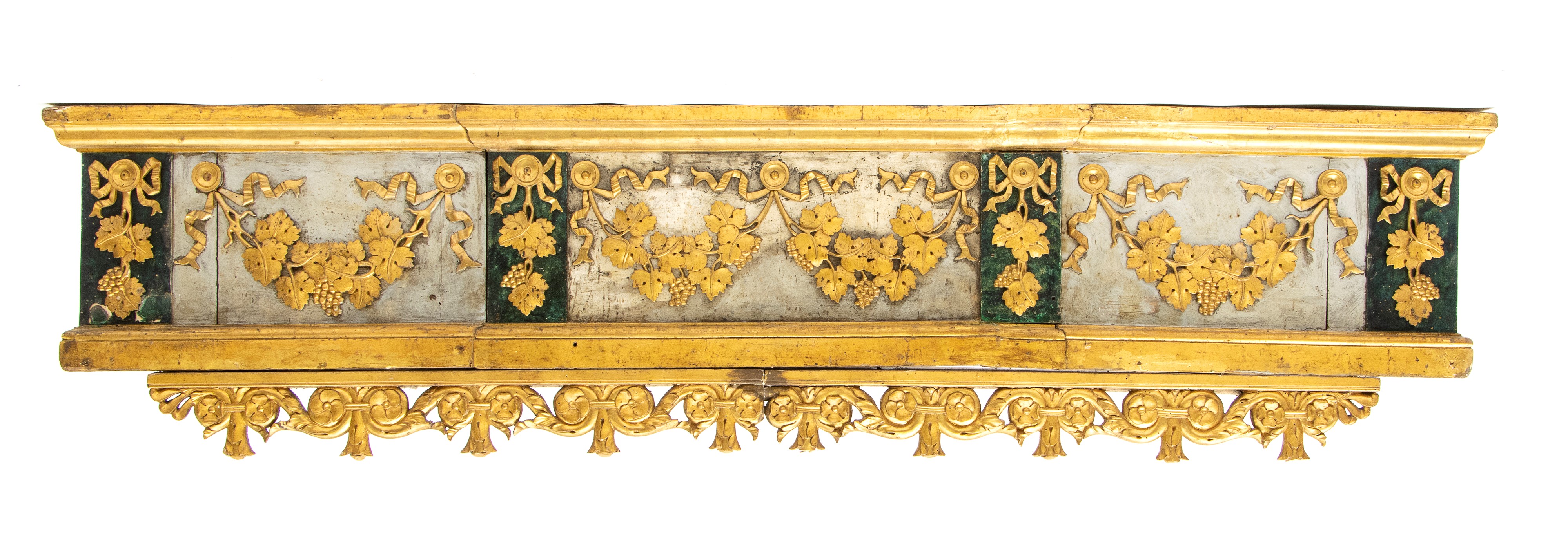 fregio decorato con motivi a festoni pendenti di foglie e grappoli d'uva legati da nastri, alternati a pannelli verticali verde scuro con applicazioni floreali dorate. Fascia inferiore con elaborato motivo a girali, rosetta e fiocchi a rilievo.