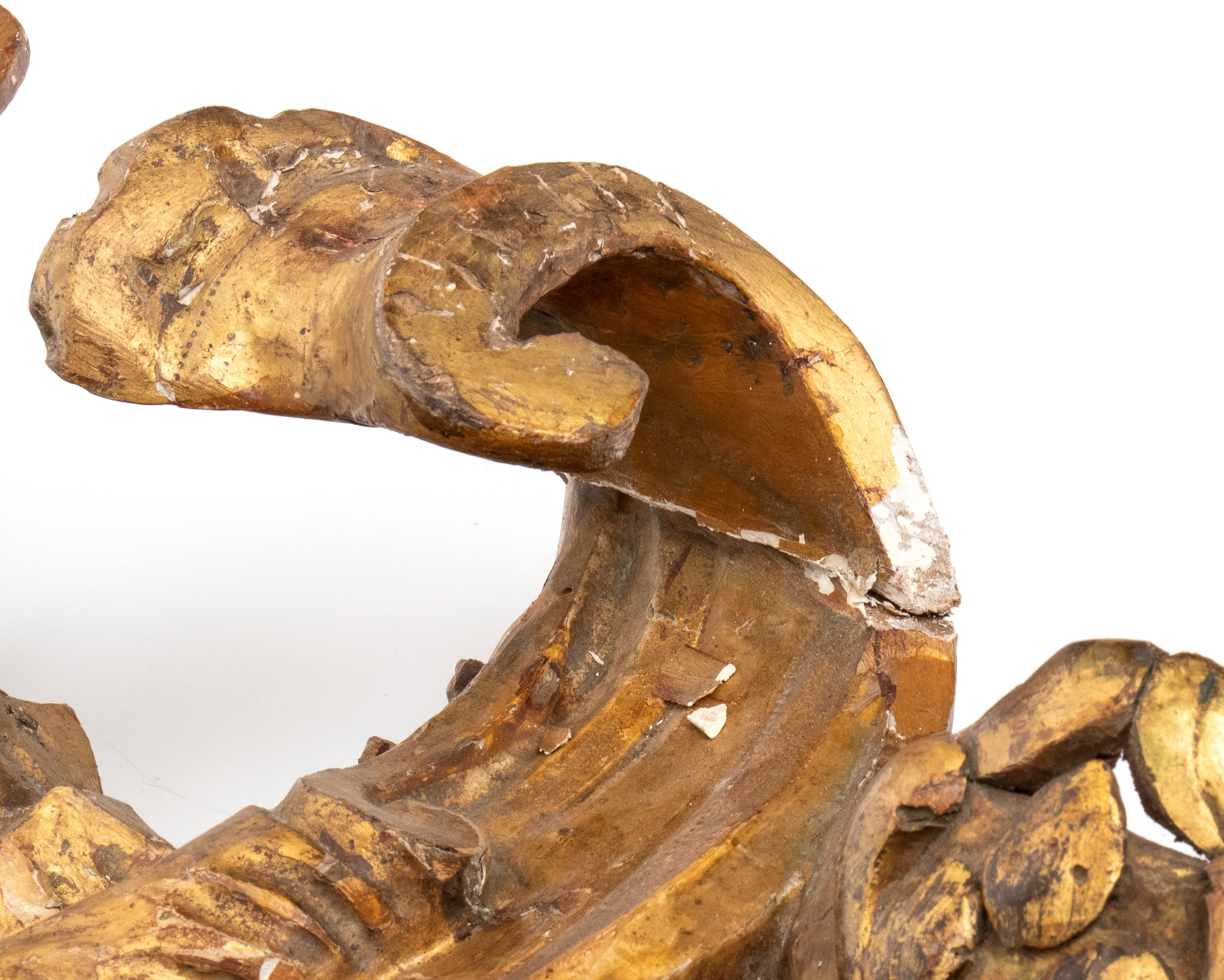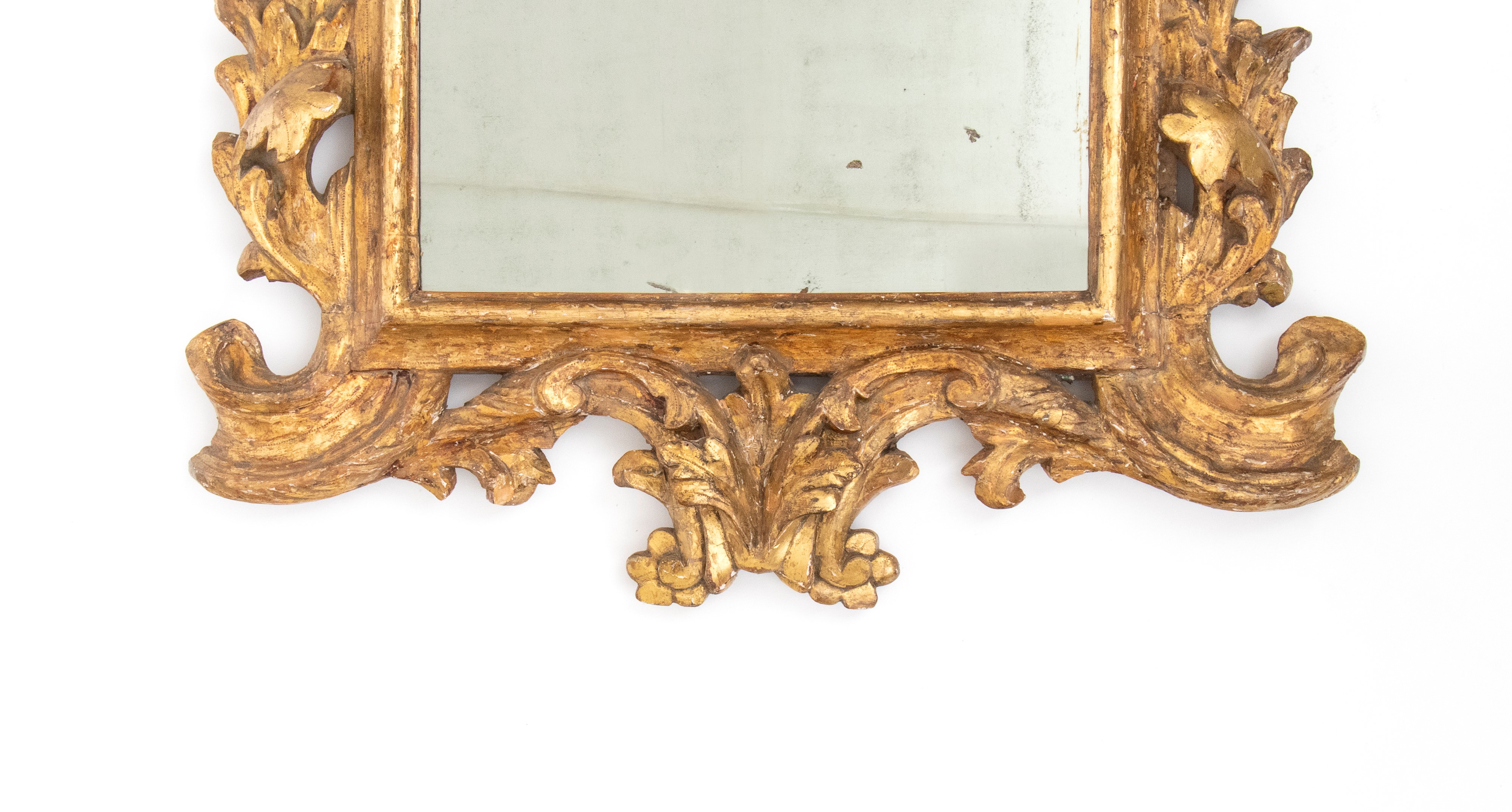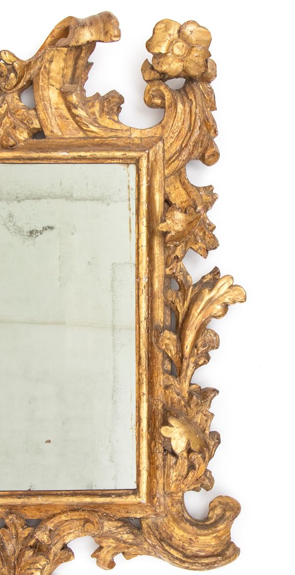 cornice riccamente scolpita a motivi fogliacei, volute e fiori, con cimasa e grembialatura mossa in stile rocaille. Doratura a foglia, specchio antico.