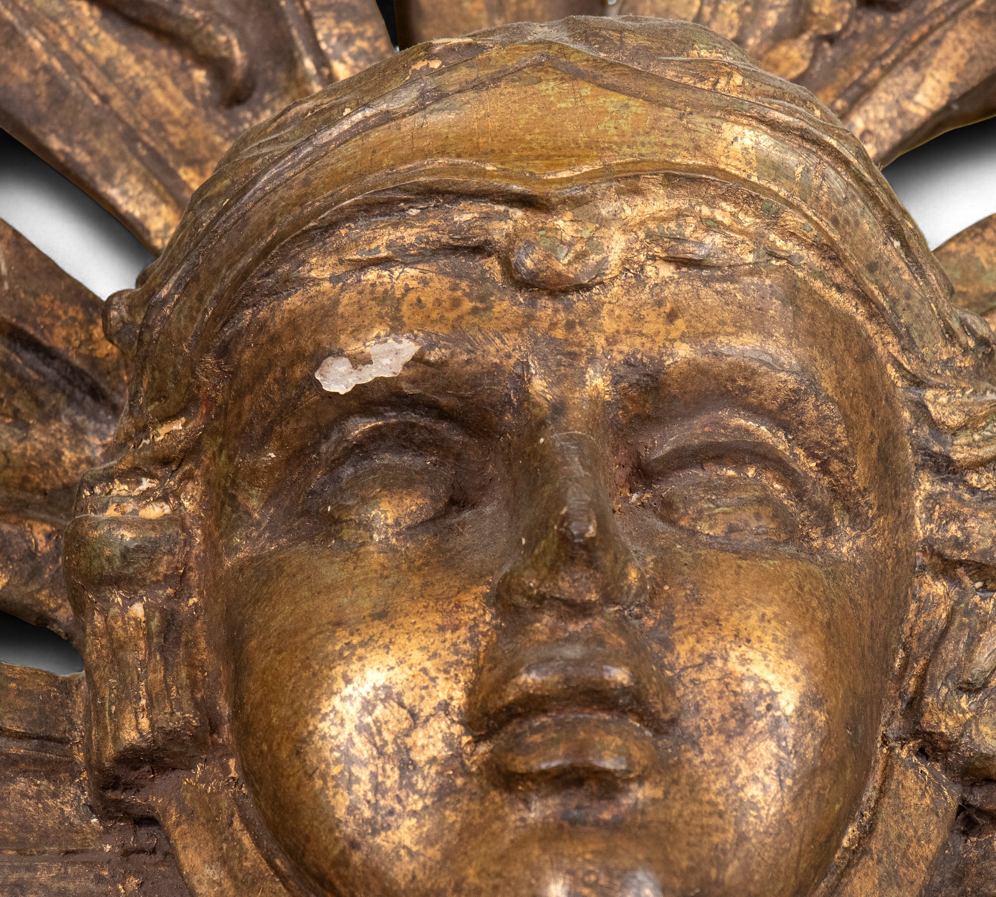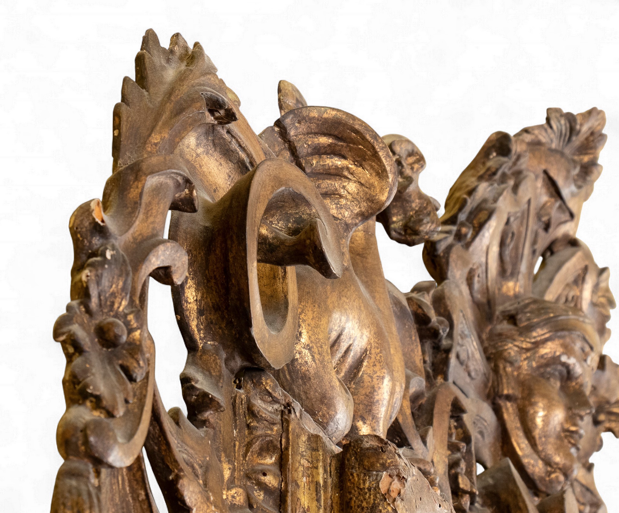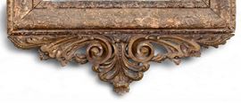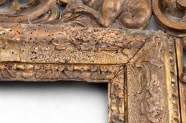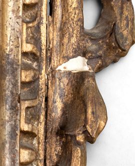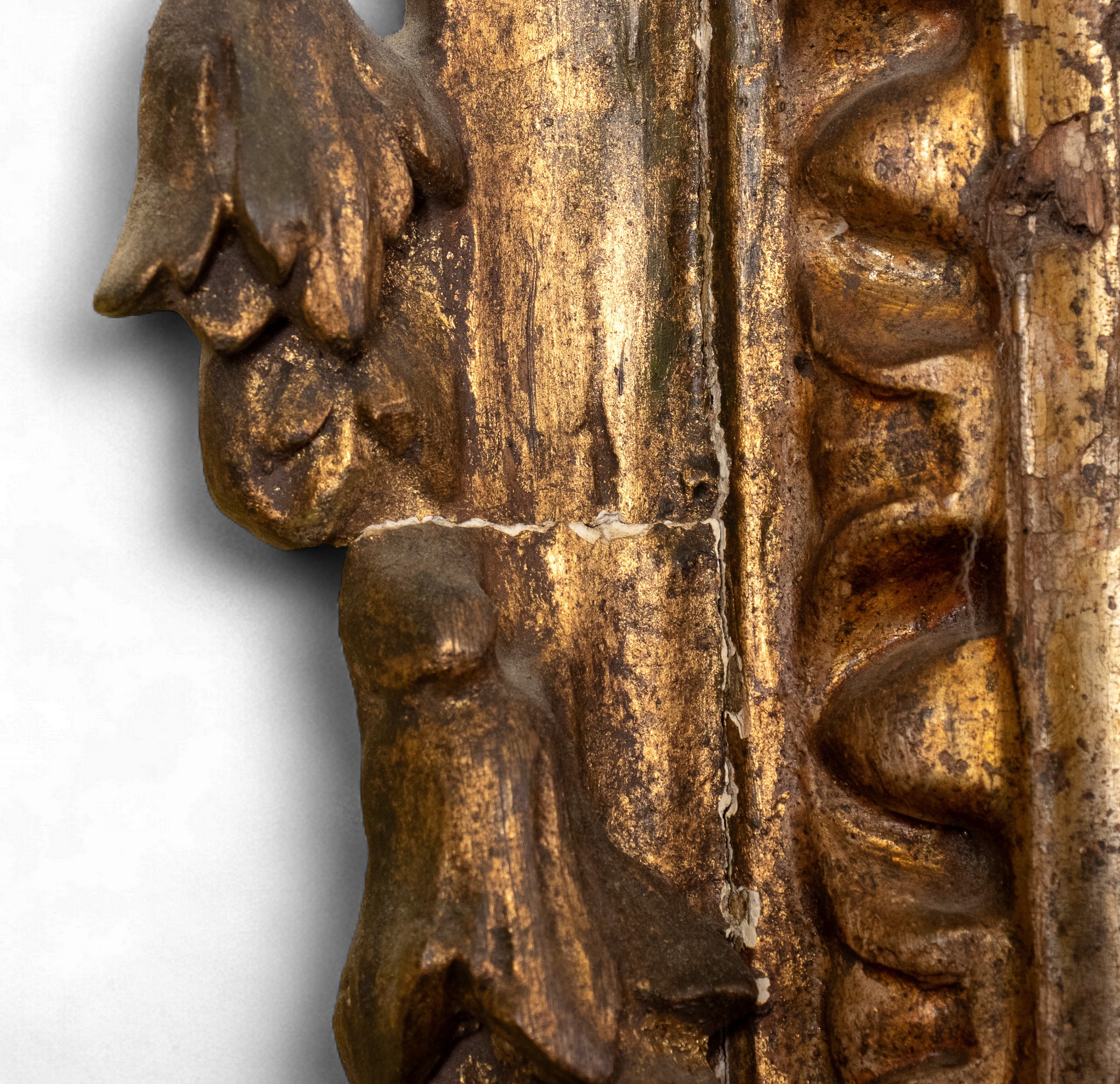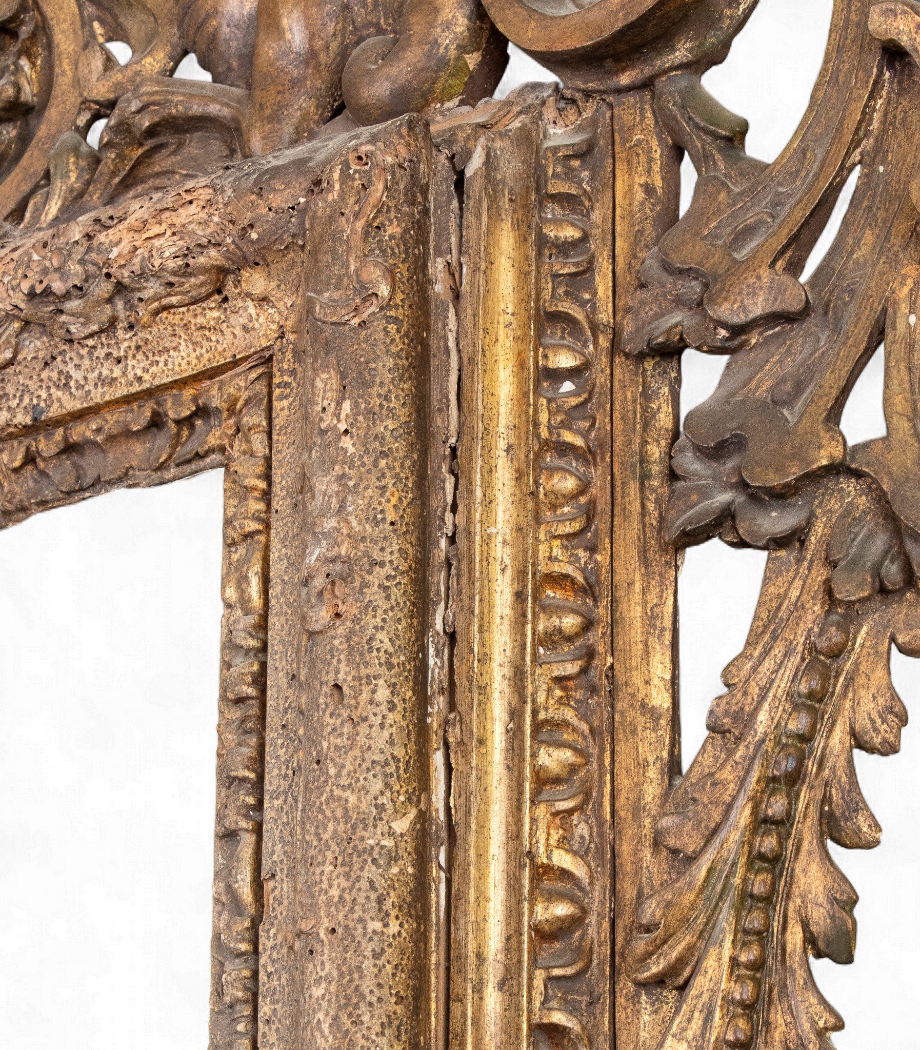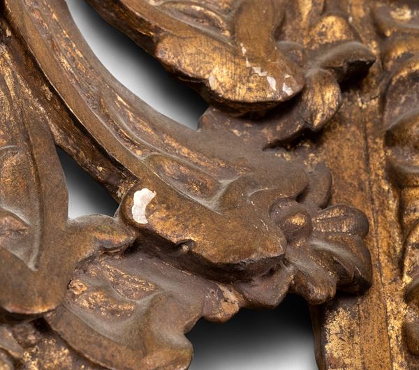 di forma rettangolare con cornice in legno finemente intagliata e dorata caratterizzata da un ricco decoro barocco con motivi floreali e volute. La cimasa è ornata da un volto stilizzato e due creature mitologiche simili a draghi.