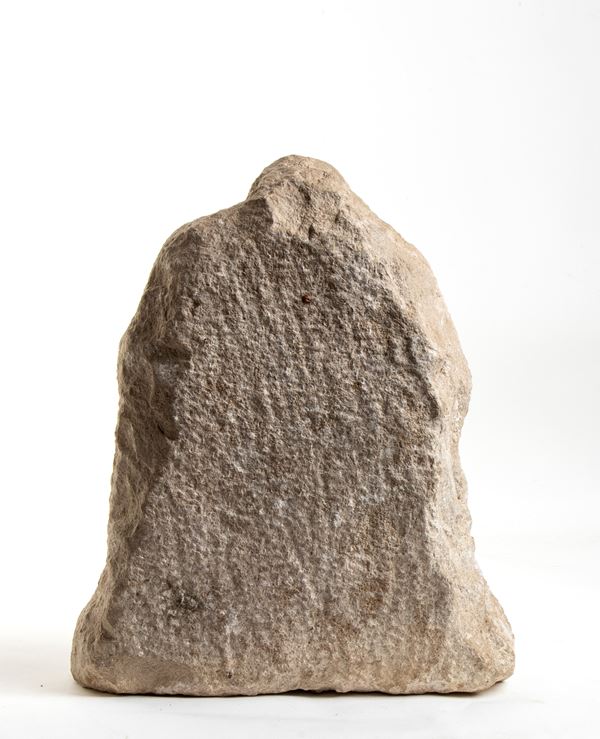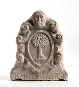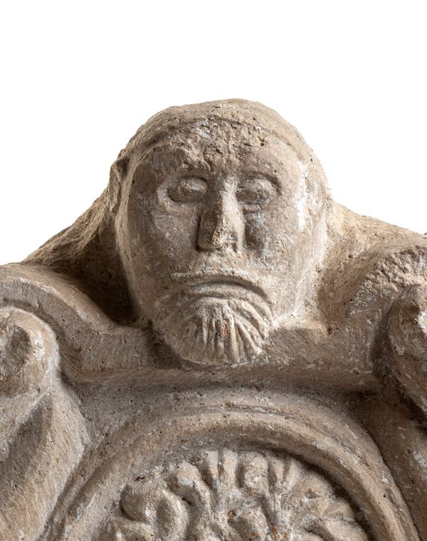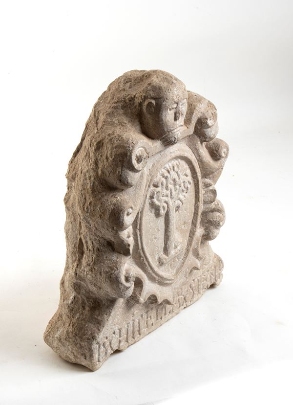 scultura in pietra raffigurante lo stemma di Ischitella. Nella parte alta c'è il volto di uomo barbuto, al centro uno scudo ovale con all'interno un leccio (aesculus), il tutto raccordato da un bordo a forma di nuvole.