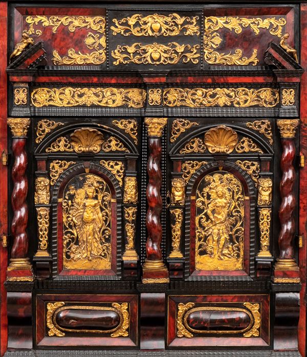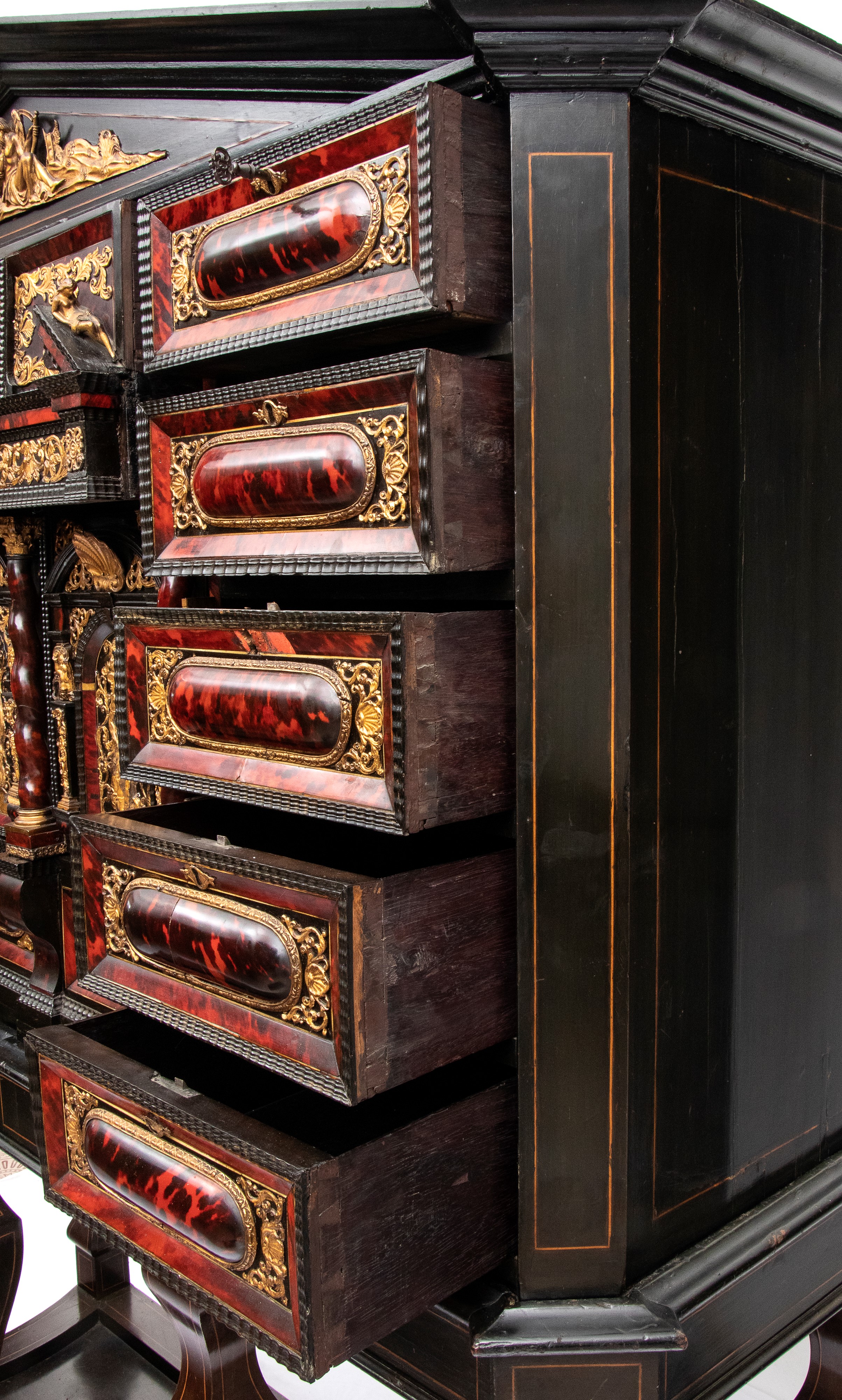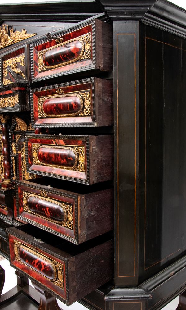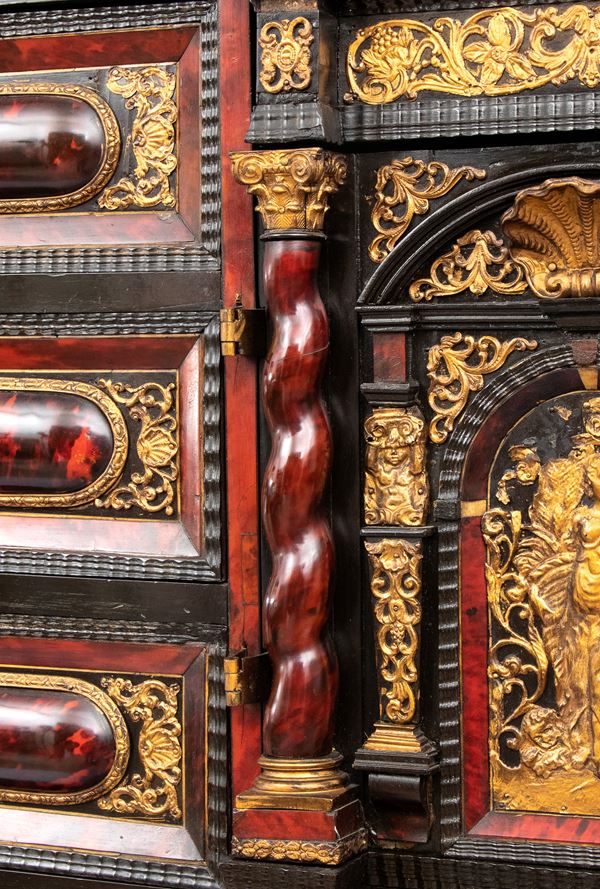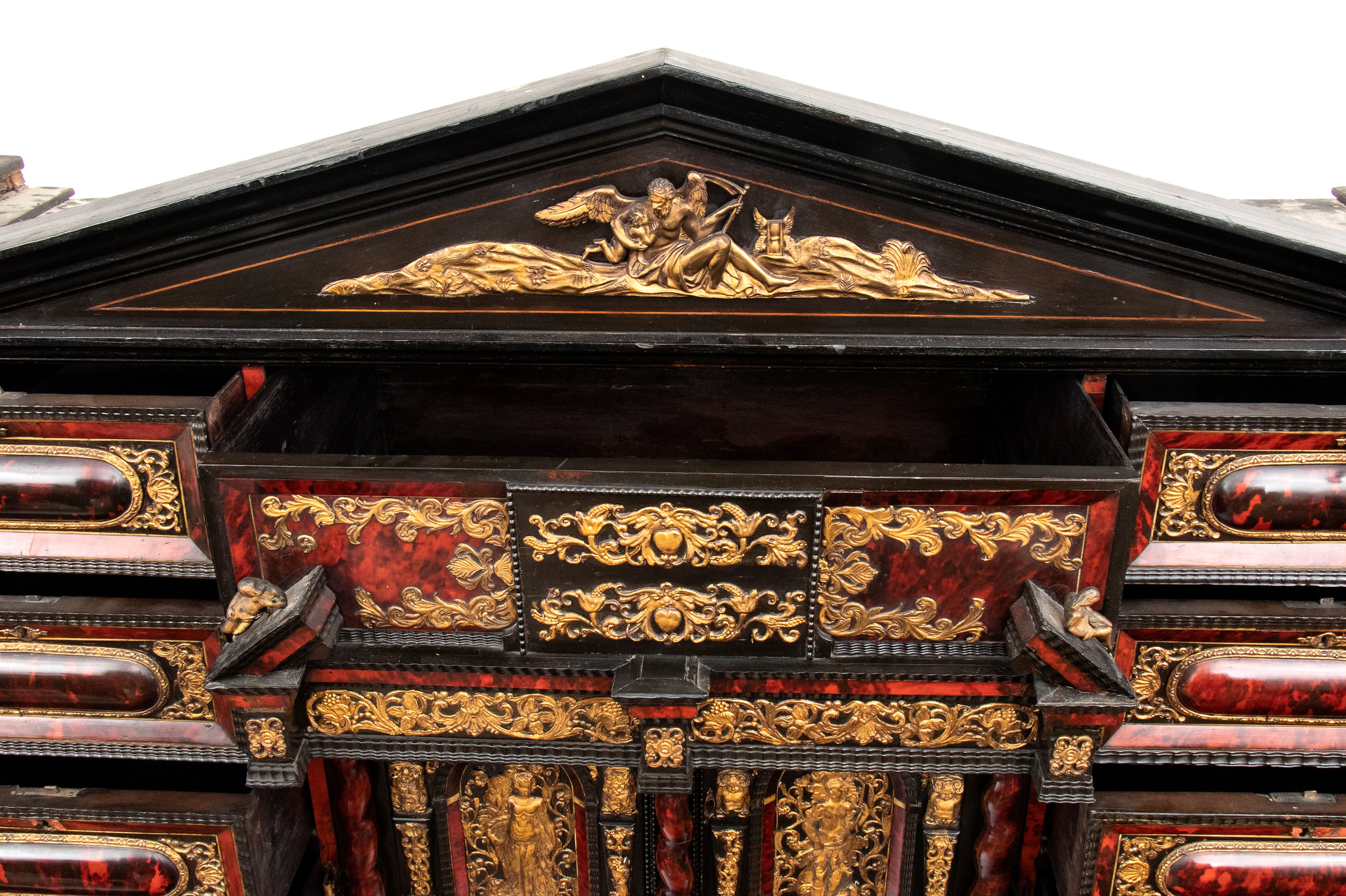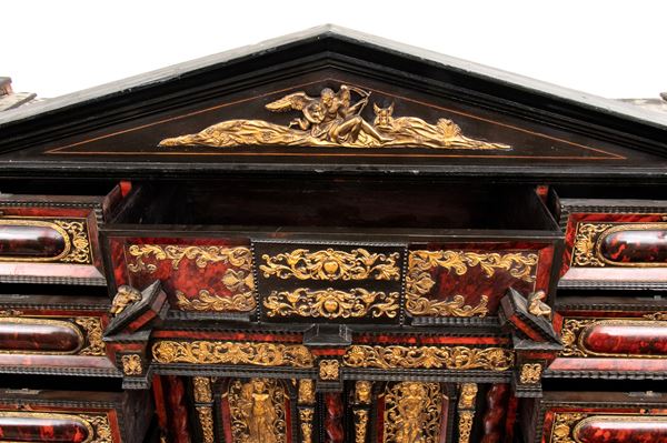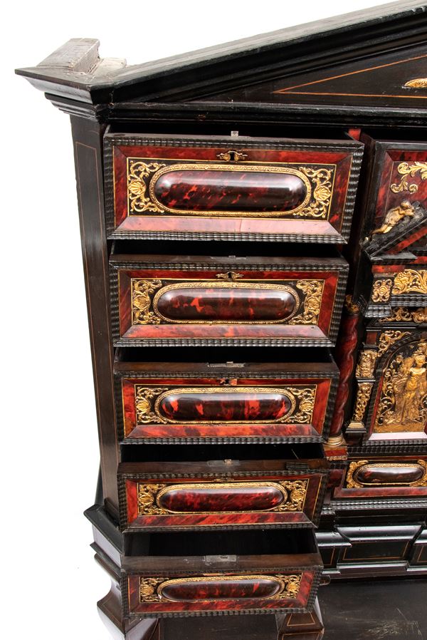 Il registro superiore è coronato da un timpano triangolare in ebano, al cui centro una placca scolpita e dorata raffigura una scena allegorica, probabilmente personificazioni mitologiche o virtù. Ai lati del mobile si dispongono colonne di cassetti verticali, cinque per lato, ciascuno decorato con un inserto rettangolare bombato in tartaruga, incorniciato da filettature in ebano e profili in osso.