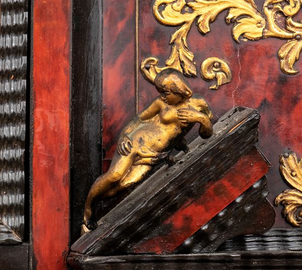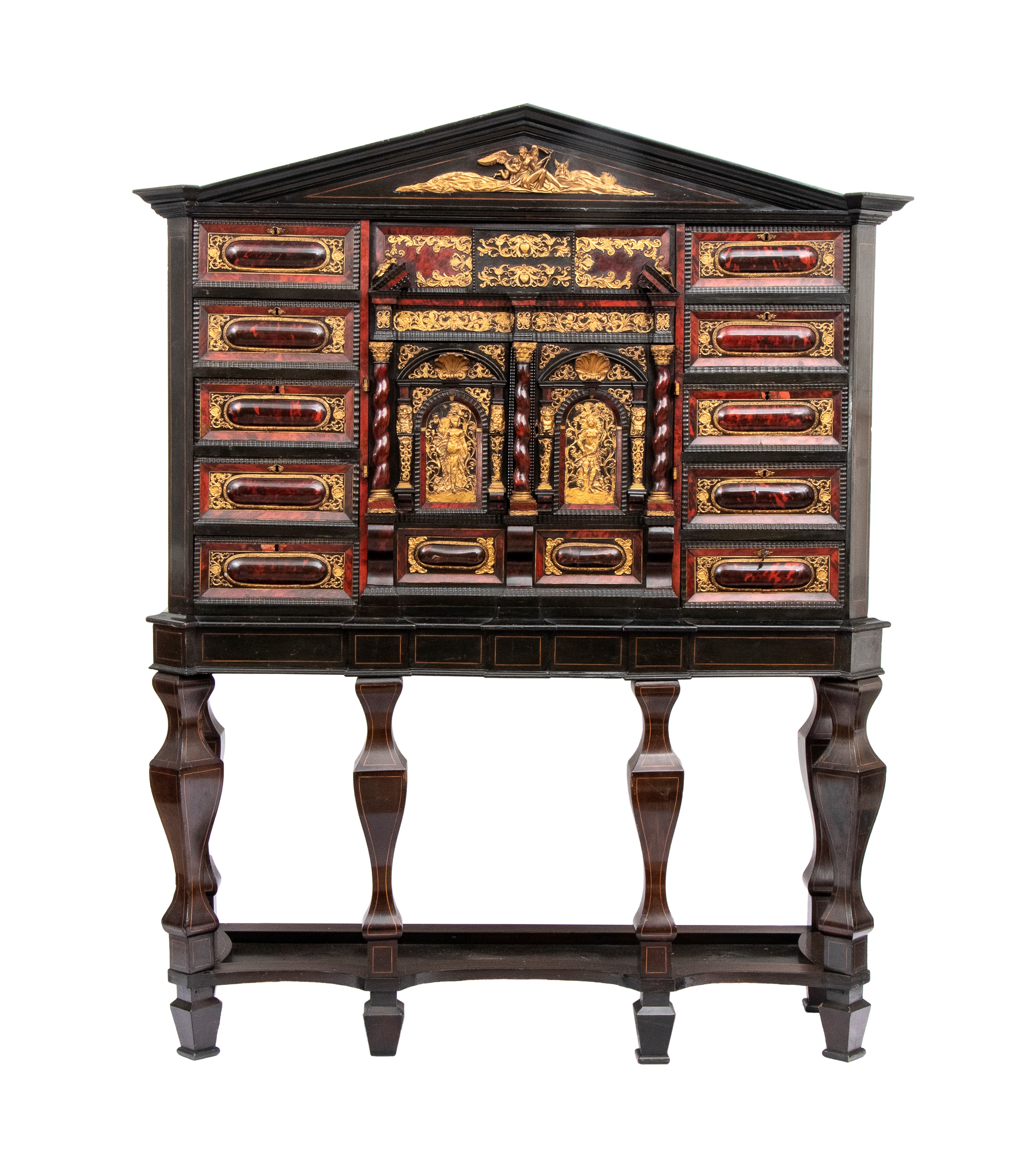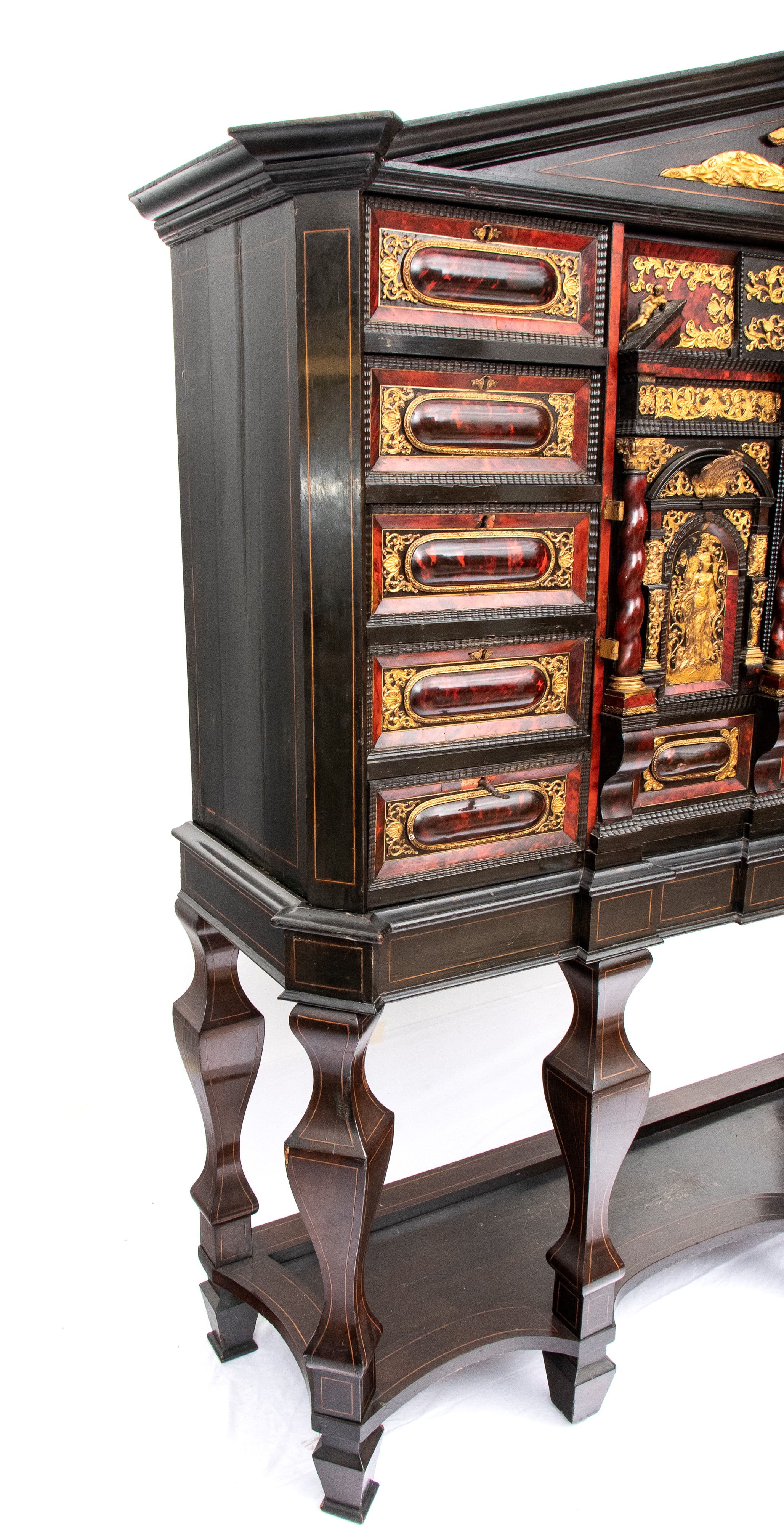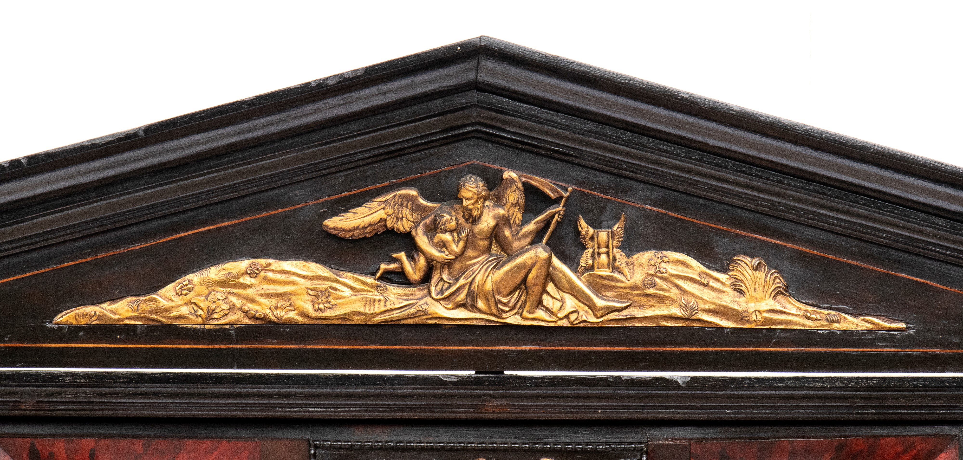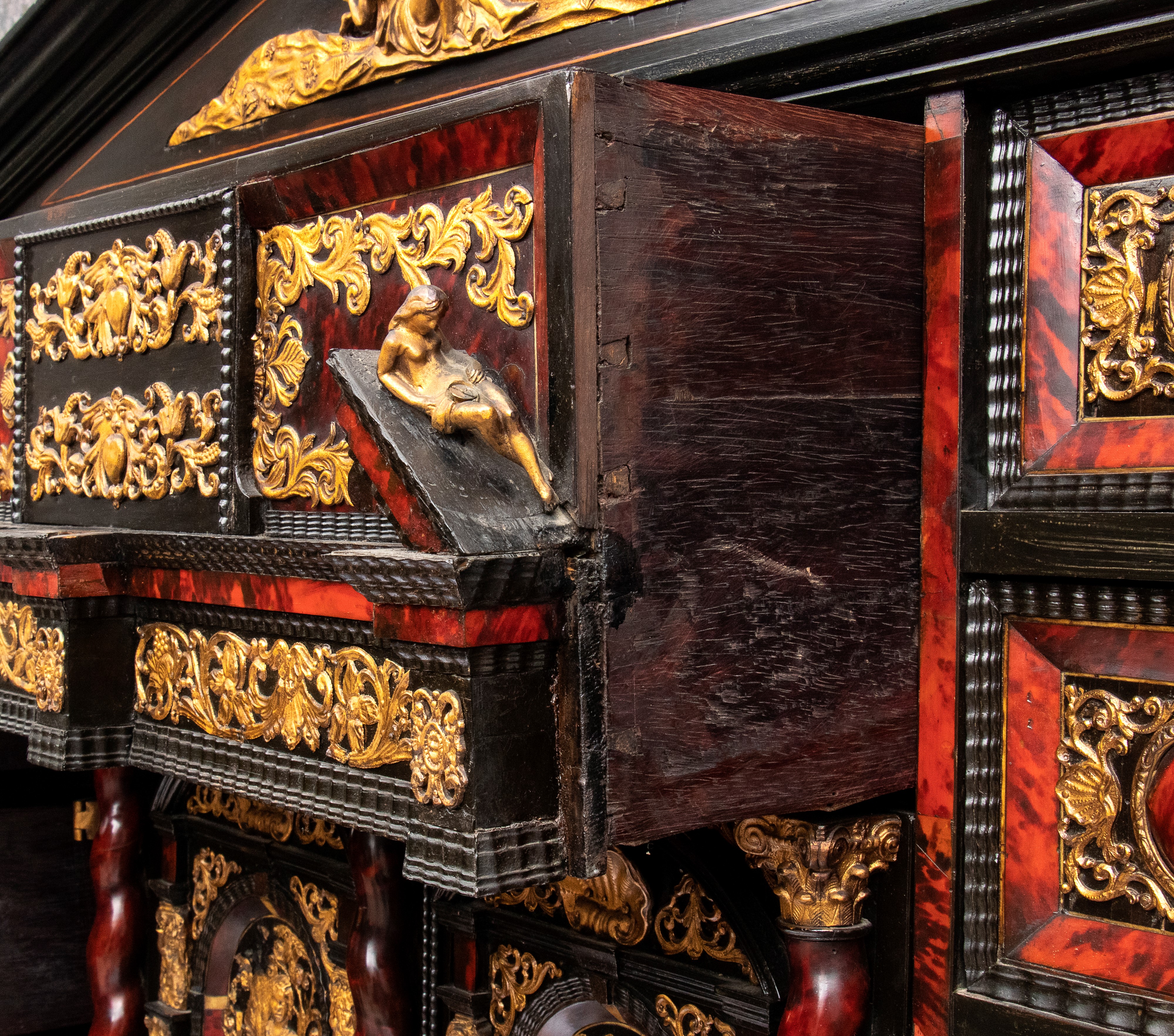 Il registro superiore è coronato da un timpano triangolare in ebano, al cui centro una placca scolpita e dorata raffigura una scena allegorica, probabilmente personificazioni mitologiche o virtù. Ai lati del mobile si dispongono colonne di cassetti verticali, cinque per lato, ciascuno decorato con un inserto rettangolare bombato in tartaruga, incorniciato da filettature in ebano e profili in osso.