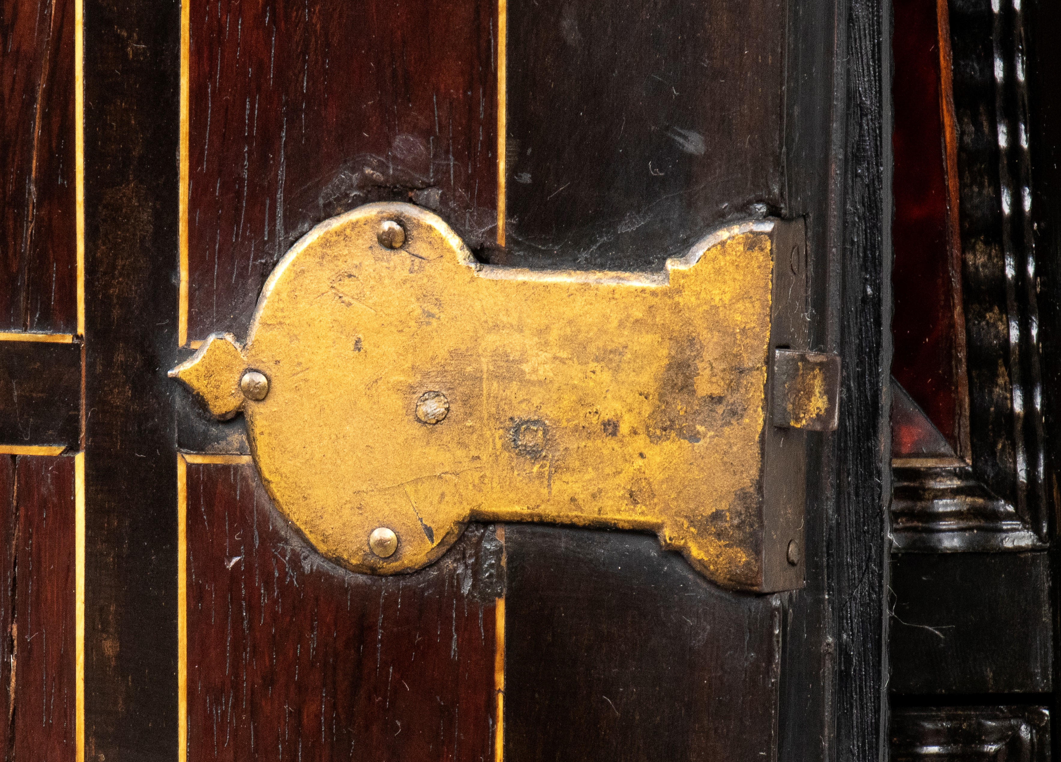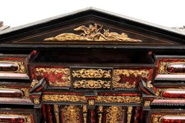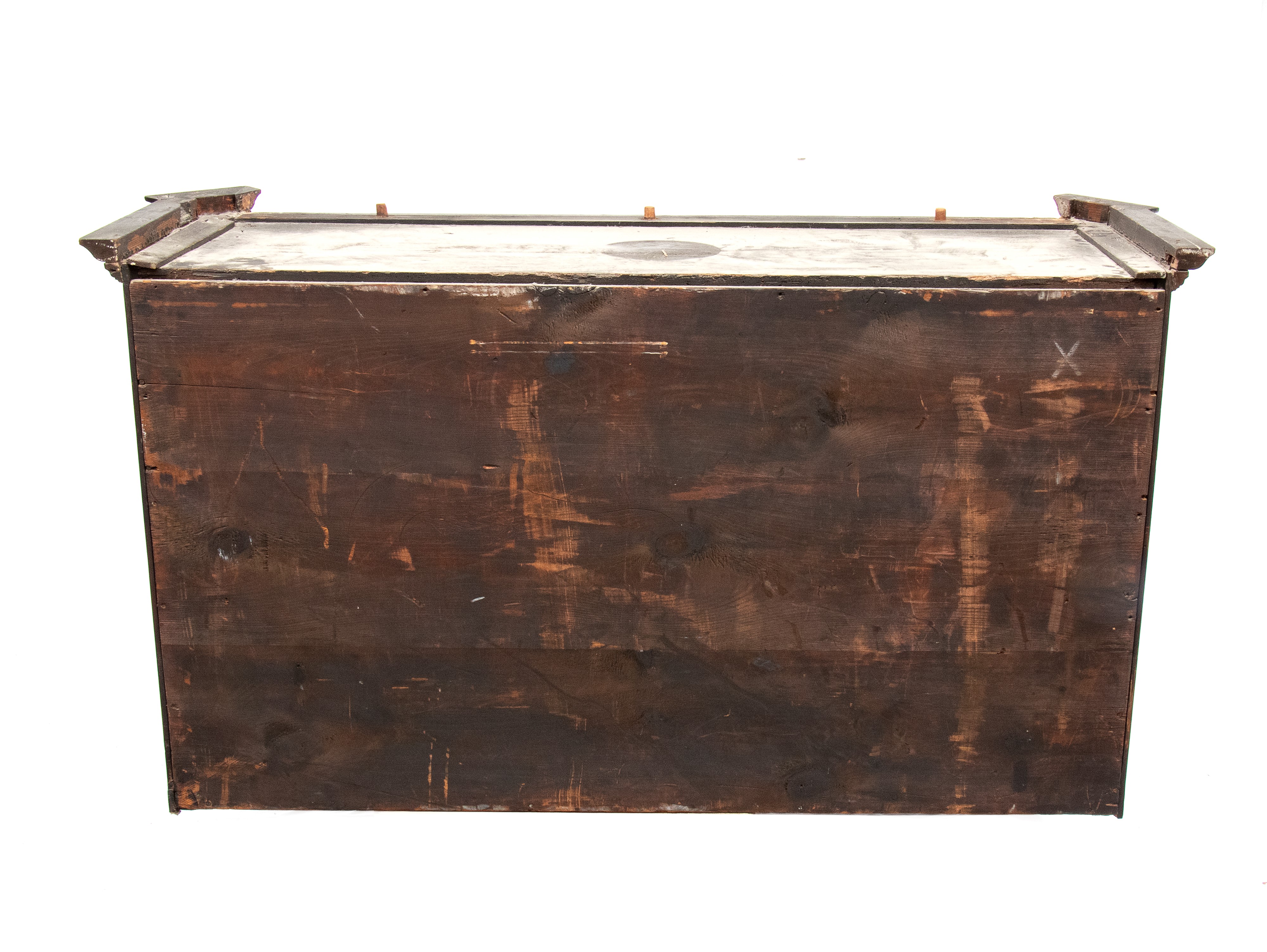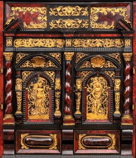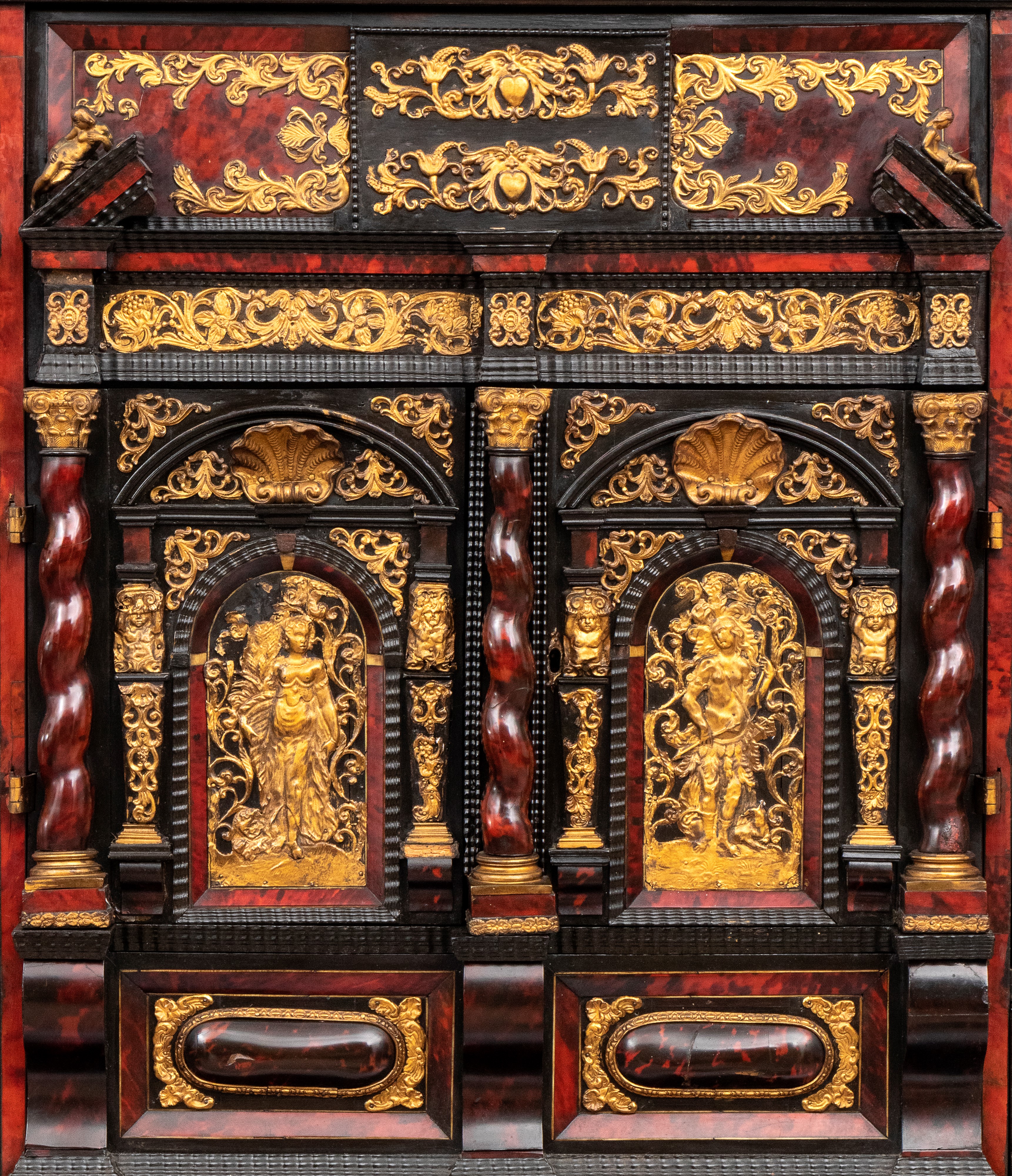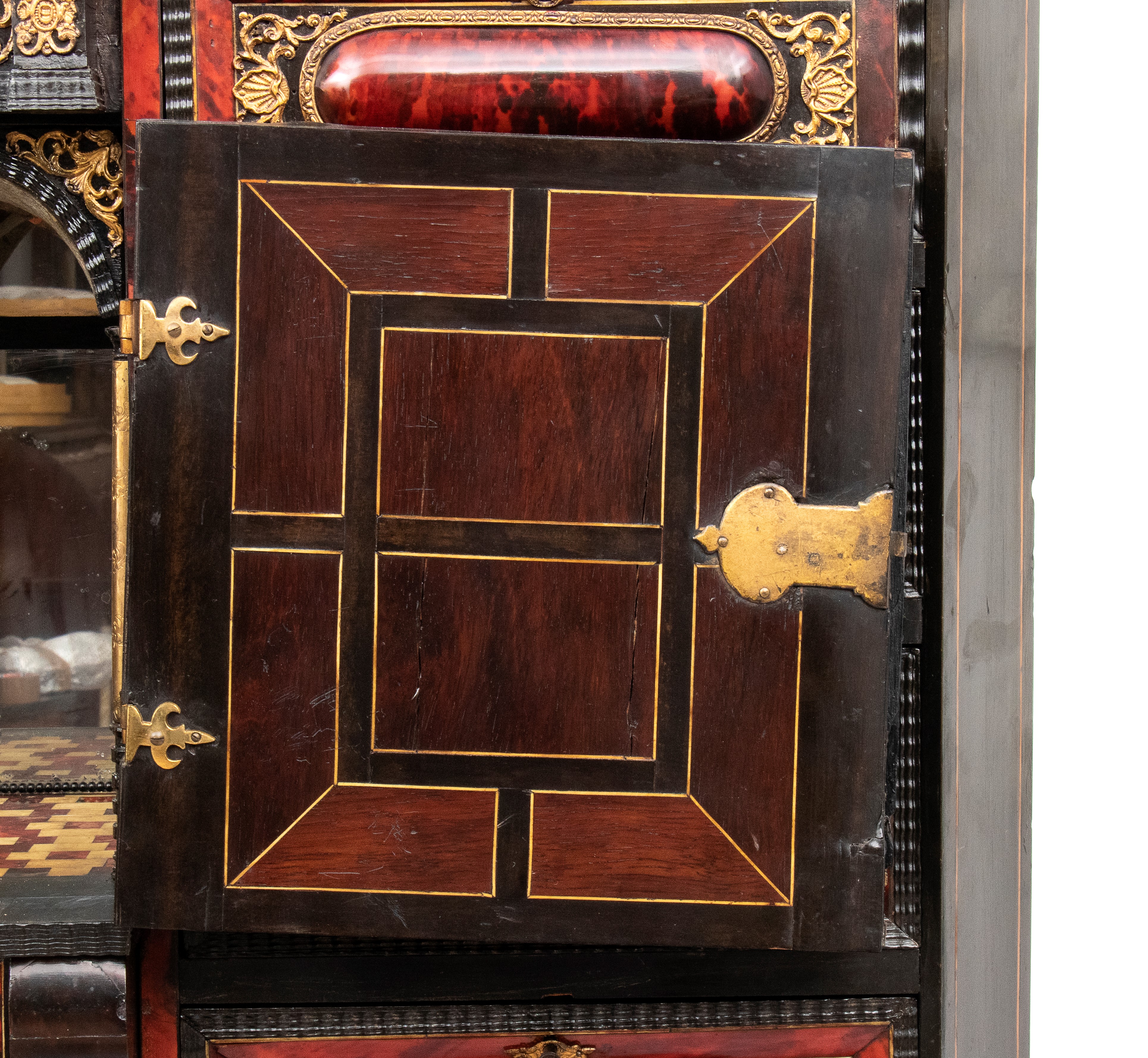 Il registro superiore è coronato da un timpano triangolare in ebano, al cui centro una placca scolpita e dorata raffigura una scena allegorica, probabilmente personificazioni mitologiche o virtù. Ai lati del mobile si dispongono colonne di cassetti verticali, cinque per lato, ciascuno decorato con un inserto rettangolare bombato in tartaruga, incorniciato da filettature in ebano e profili in osso.