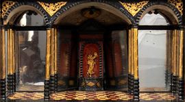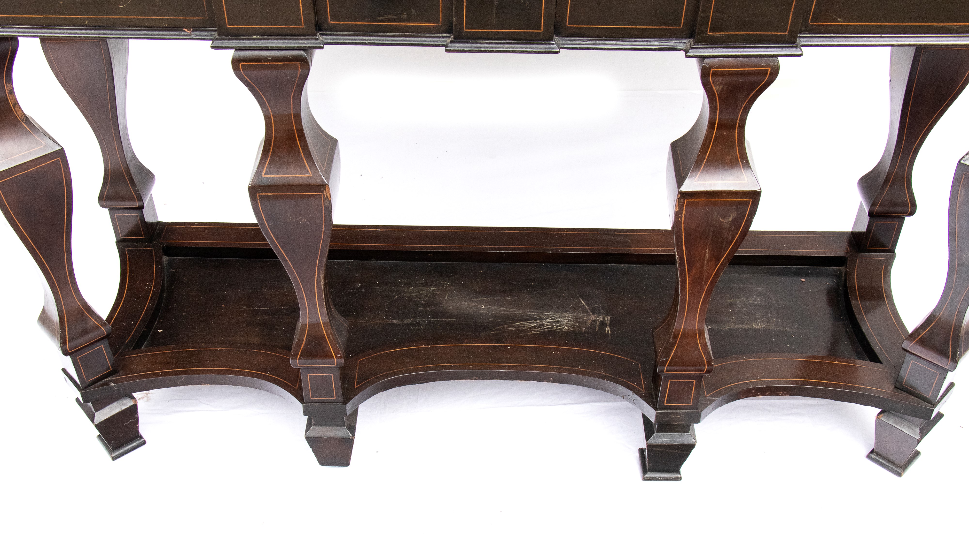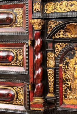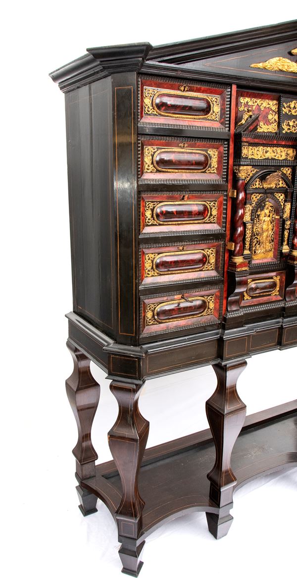 Il basamento integra un tavolo di sostegno in ebano con gambe tornite e sfaccettate, tipiche del Seicento, collegate da traverse inferiori per garantire stabilità.