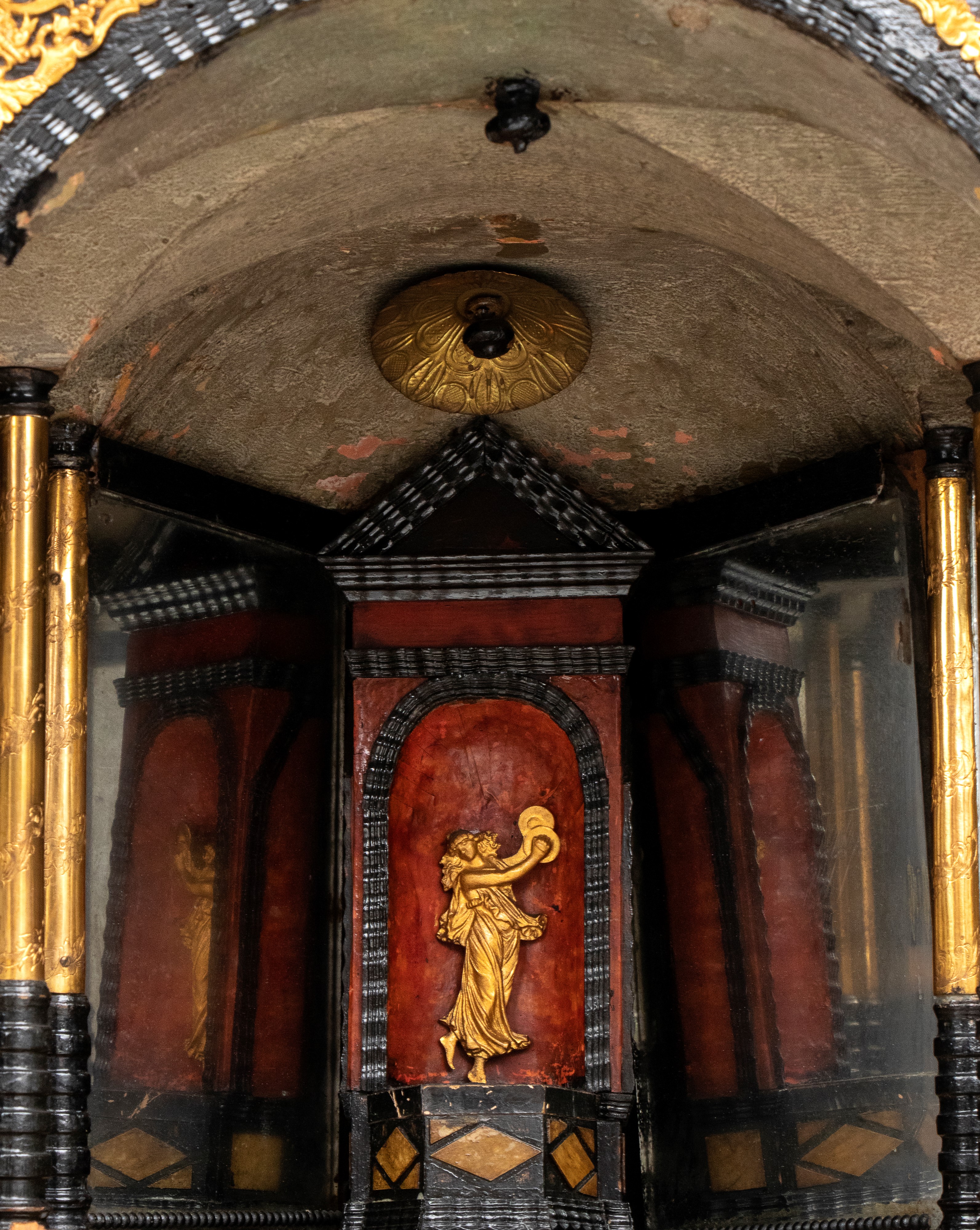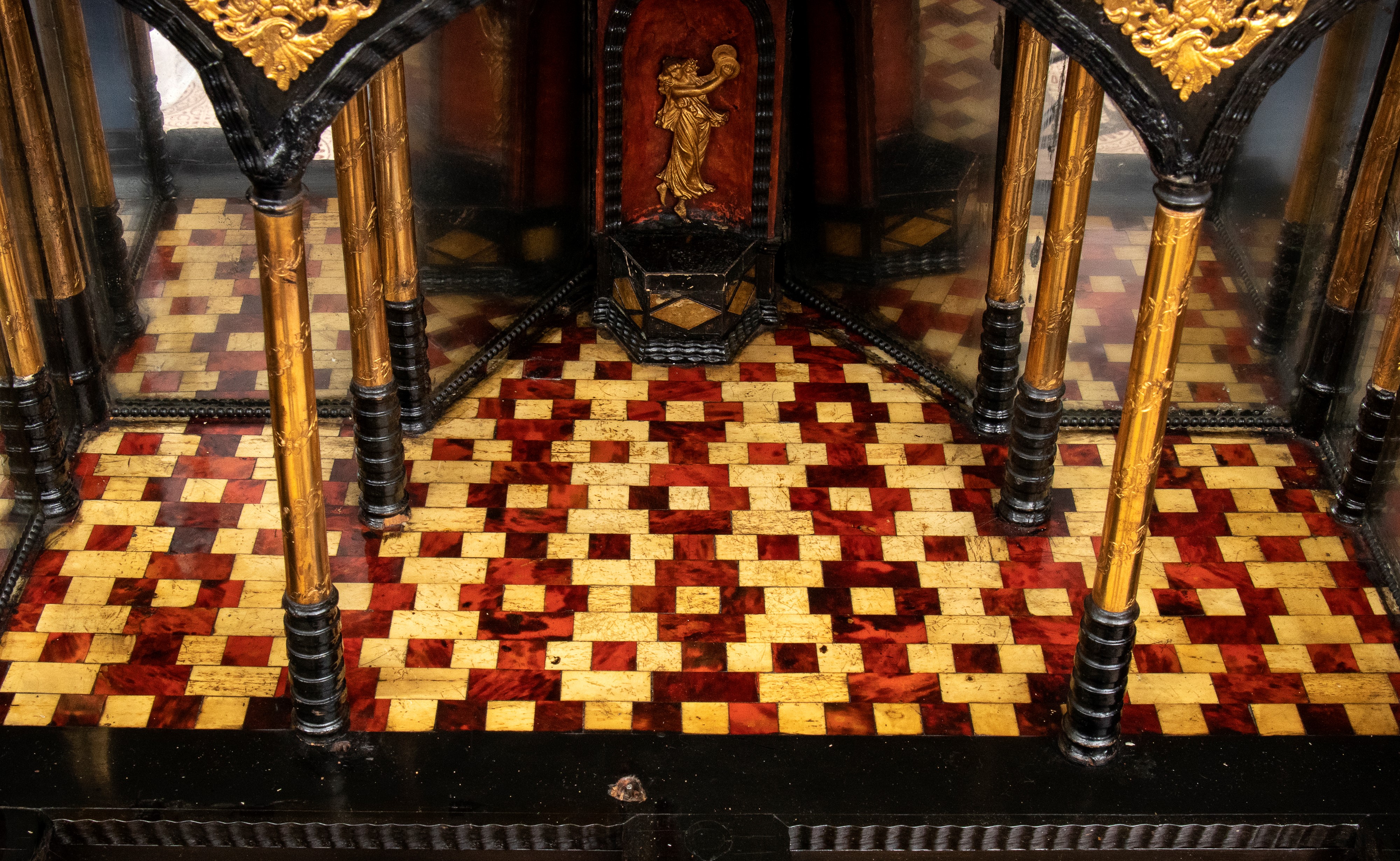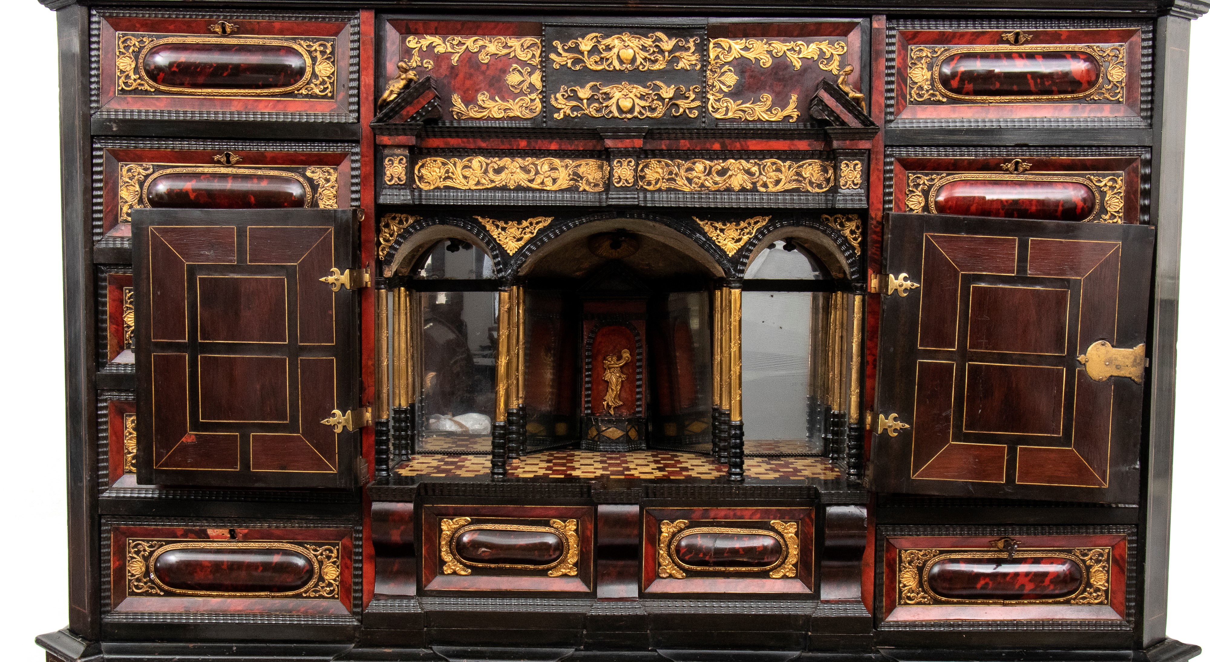 La parte centrale dello stipo costituisce il fulcro della composizione, sviluppata come una facciata architettonica. Due arcate verticali incorniciate da colonnine tortili in contengono pannelli figurati dorati, scolpiti con scene allegoriche o mitologiche. La sezione centrale si apre, rivelando un interno organizzato con ulteriori piccole colonne e una figura allegorica aggiuntiva, mentre un “pavimento”, conferendo profondità e un effetto scenografico tridimensionale. Al di sotto delle arcate si trovano piccoli cassetti orizzontali, arricchiti anch’essi da inserti in tartaruga e plachette dorate, pensati per custodire oggetti preziosi, sigilli o medaglie.