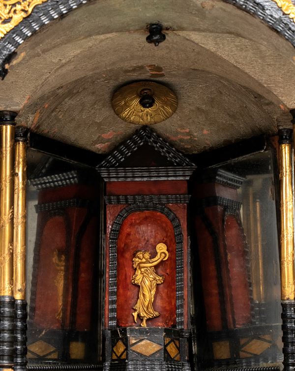 Il mobile si presenta come un piccolo apparato architettonico in miniatura, con una scansione rigorosa che richiama la monumentalità di un tempietto.