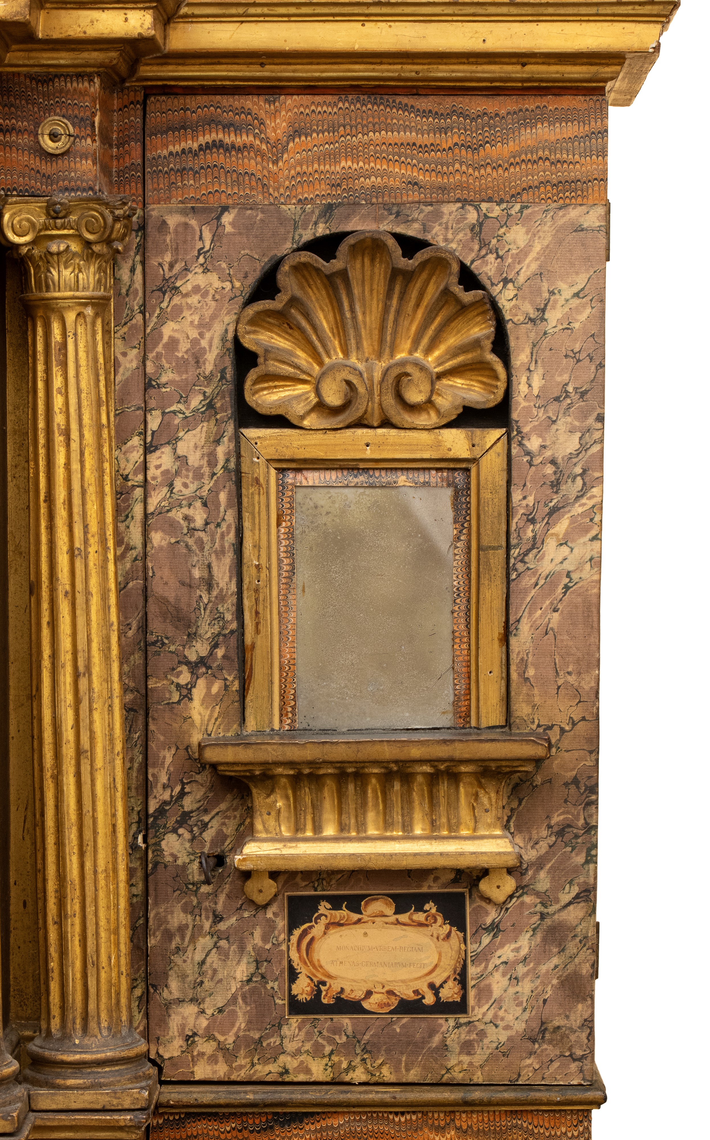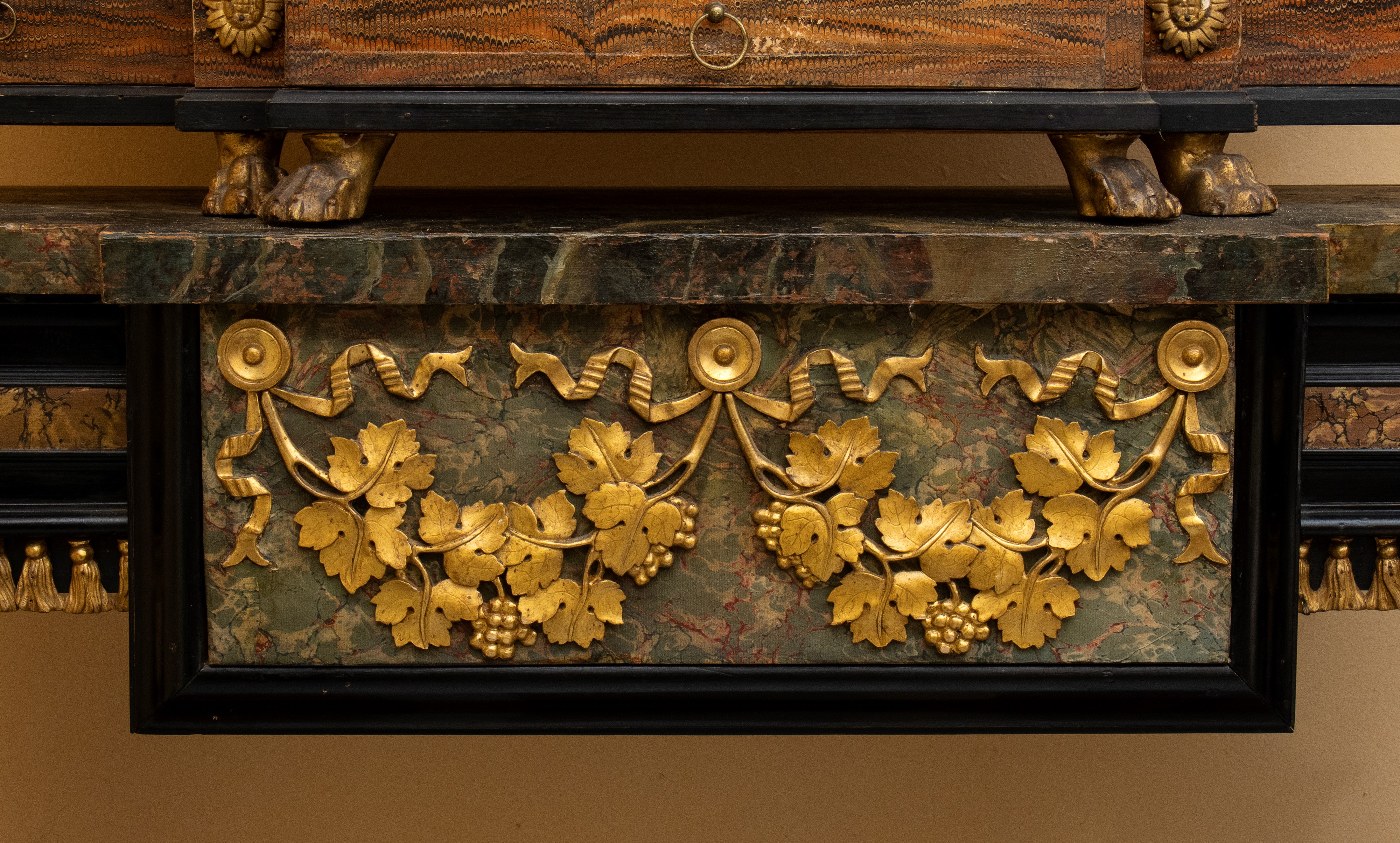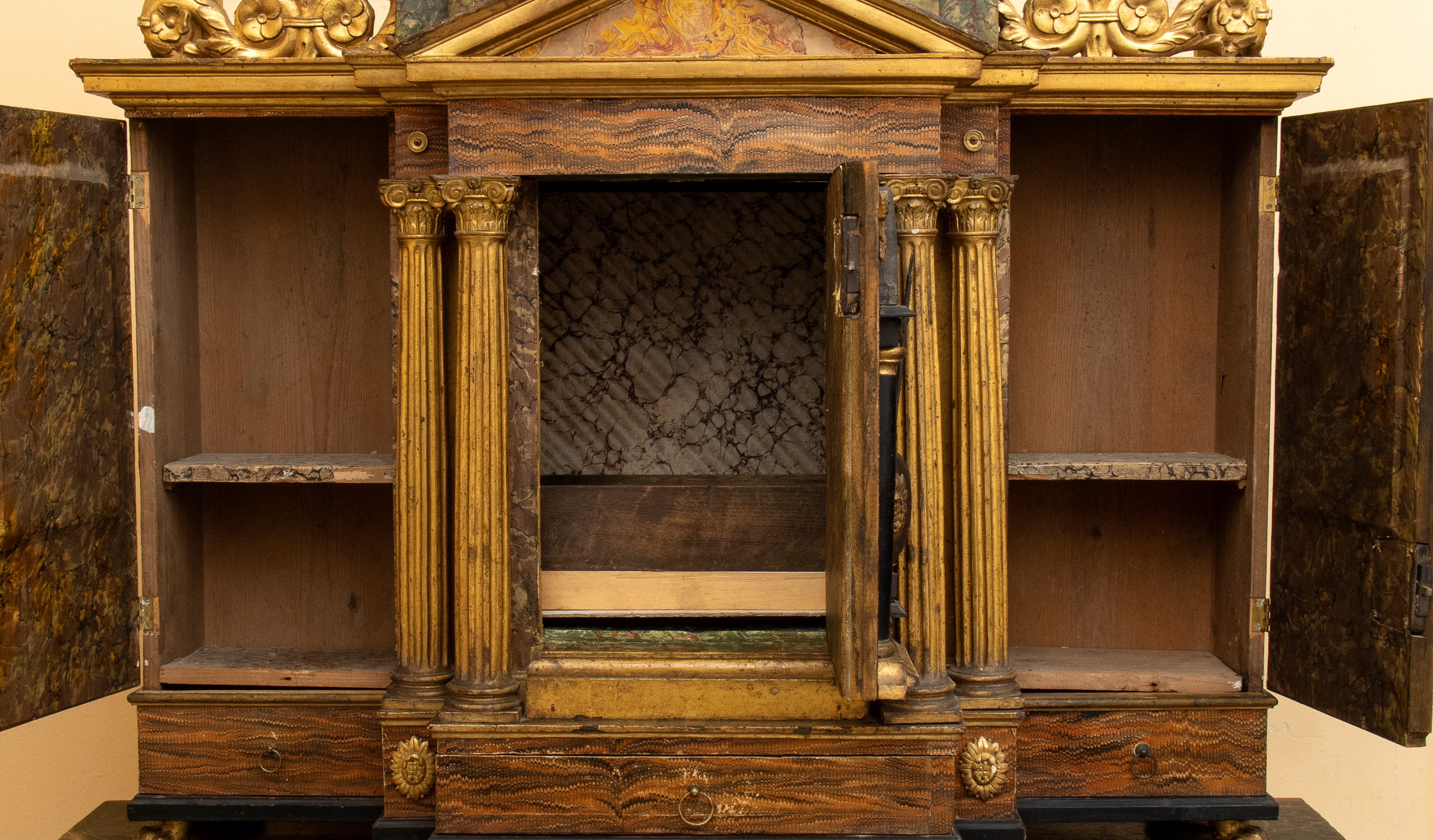 Il fronte, concepito come una facciata architettonica di gusto monumentale, è dominato al centro da un’edicola con colonne scanalate dorate e capitelli corinzi, che incorniciano una nicchia ospitante una figura scultorea, probabilmente allegorica o mitologica. questo comparto è dotato di apertura: lo sportello centrale si apre rivelando un vano corredato da scomparti interni. L’insieme è sormontato da un timpano triangolare con decorazione dipinta e bordi dorati e sopra di quest'ultimo è presente un ulteriore sportellino. Ai lati dell’edicola centrale, pannelli laccati a finto marmo sono arricchiti da conchiglie dorate e specchiature rettangolari. Anch'esse celano sportelli laterali con all'interno due ripiani. La parte inferiore del corpo è articolata in tre cassetti: uno sotto ciascuno sportello laterale e uno centrale di dimensioni maggiori. Il monetiere poggia su piedi leonini che a sua volta poggiano su un basamento del decorato con un ricco fregio dorato a racemi che richiama simbolicamente l’abbondanza e il gusto collezionistico dell’epoca. La struttura poggia su base ebanizzata con gambe tornite e traverse sagomate.