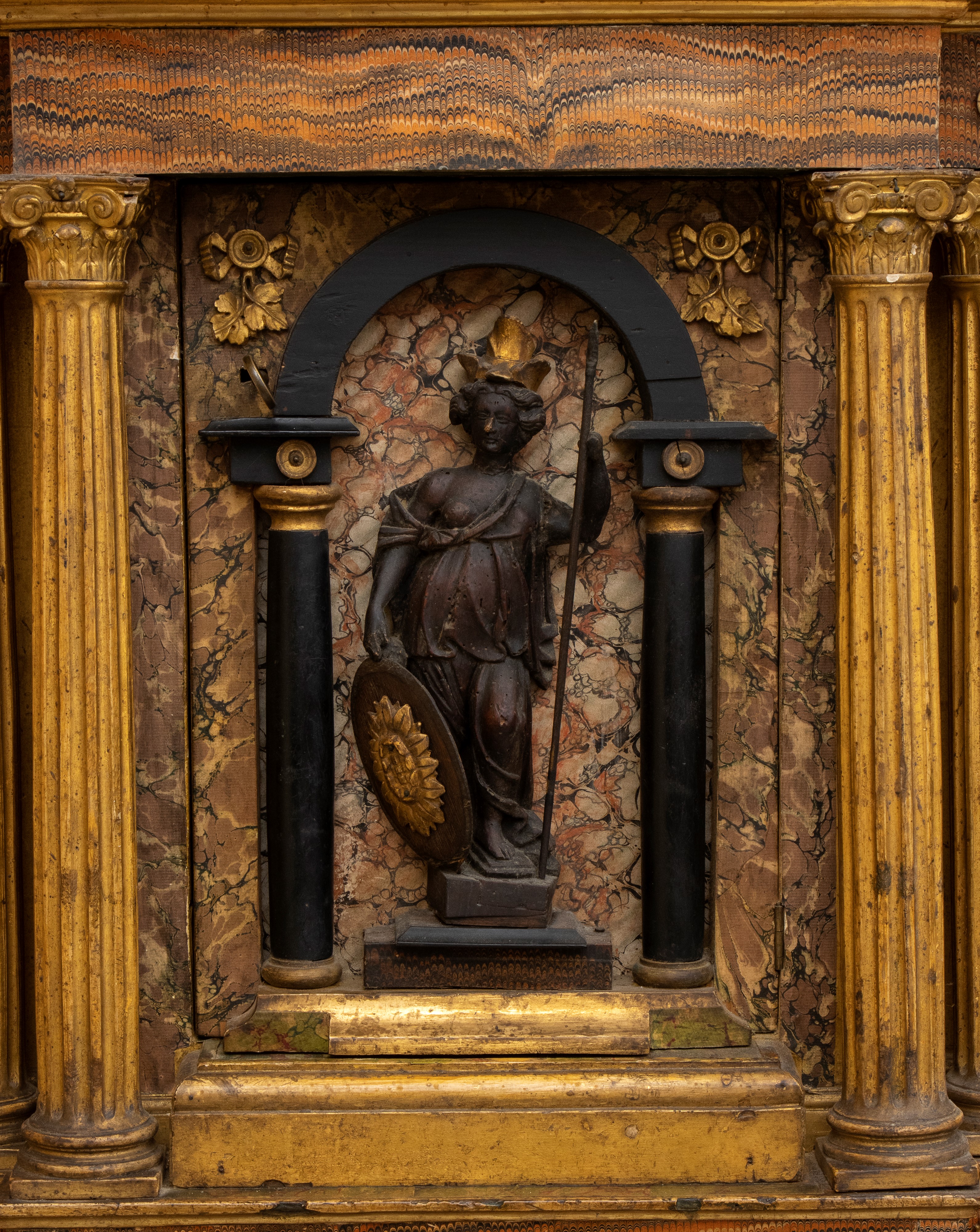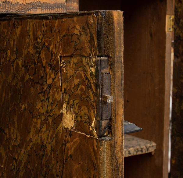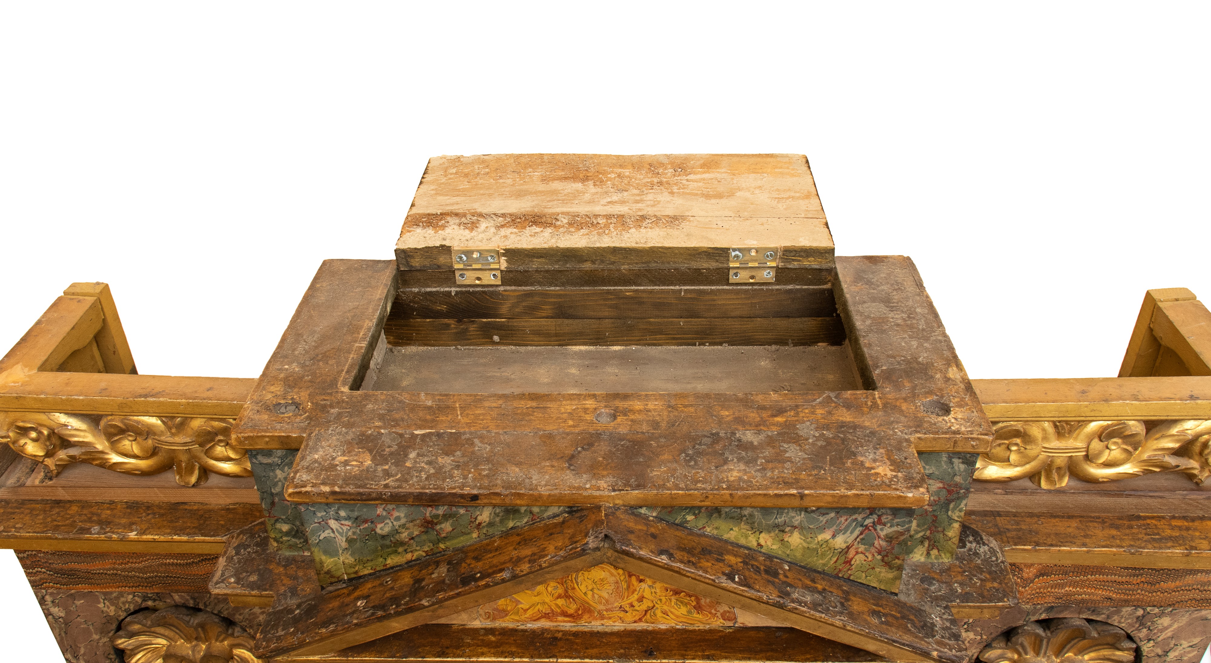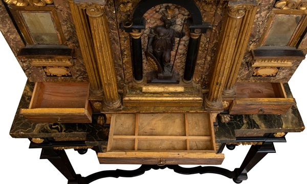 Il fronte, concepito come una facciata architettonica di gusto monumentale, è dominato al centro da un’edicola con colonne scanalate dorate e capitelli corinzi, che incorniciano una nicchia ospitante una figura scultorea, probabilmente allegorica o mitologica. questo comparto è dotato di apertura: lo sportello centrale si apre rivelando un vano corredato da scomparti interni. L’insieme è sormontato da un timpano triangolare con decorazione dipinta e bordi dorati e sopra di quest'ultimo è presente un ulteriore sportellino. Ai lati dell’edicola centrale, pannelli laccati a finto marmo sono arricchiti da conchiglie dorate e specchiature rettangolari. Anch'esse celano sportelli laterali con all'interno due ripiani. La parte inferiore del corpo è articolata in tre cassetti: uno sotto ciascuno sportello laterale e uno centrale di dimensioni maggiori. Il monetiere poggia su piedi leonini che a sua volta poggiano su un basamento del decorato con un ricco fregio dorato a racemi che richiama simbolicamente l’abbondanza e il gusto collezionistico dell’epoca. La struttura poggia su base ebanizzata con gambe tornite e traverse sagomate.
