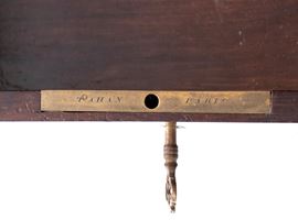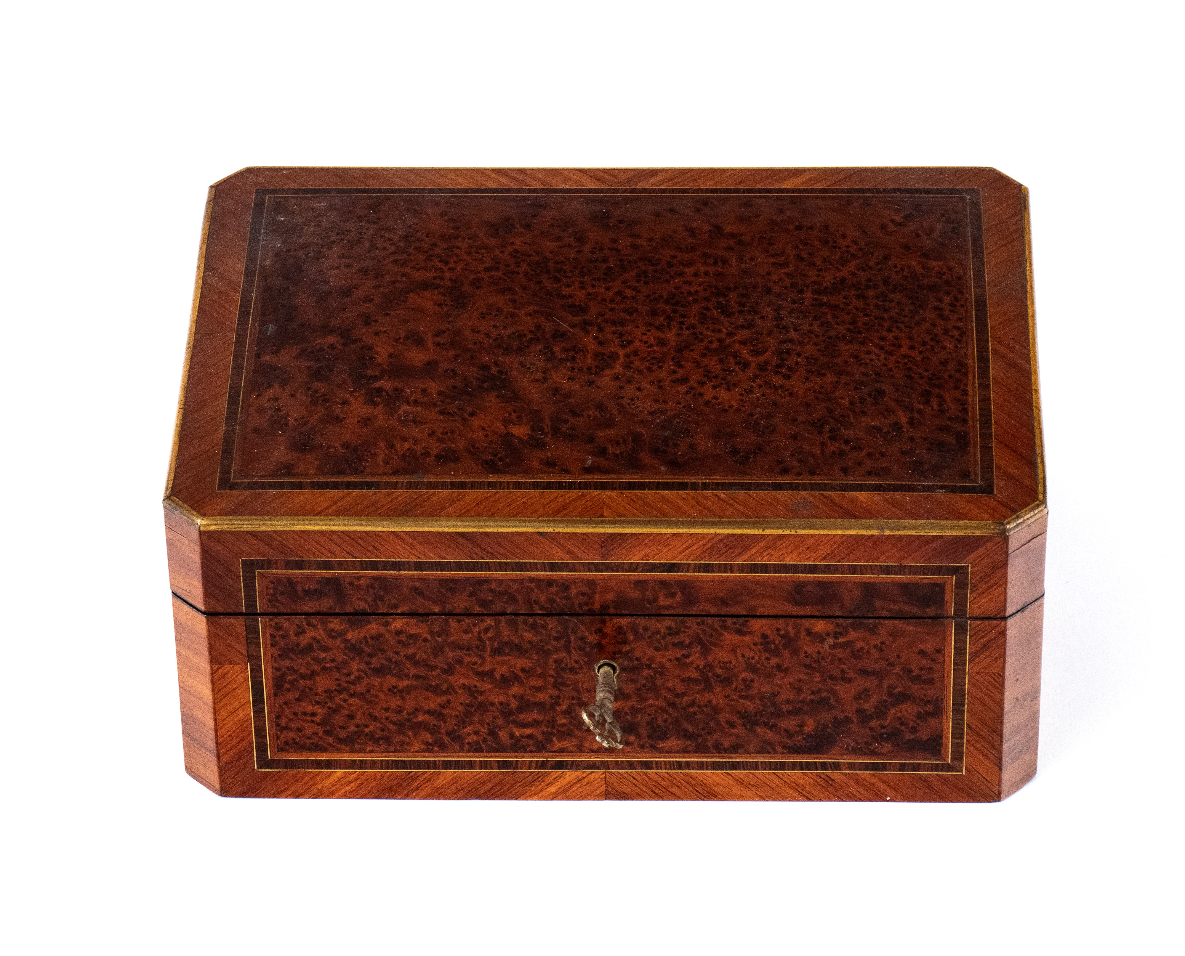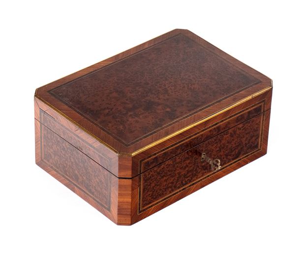 lastronata in radica di tuja e bordata in ebano viola (Dalbergia cearensis) e palissandro (Dalbergia spp) con filetti in ottone.