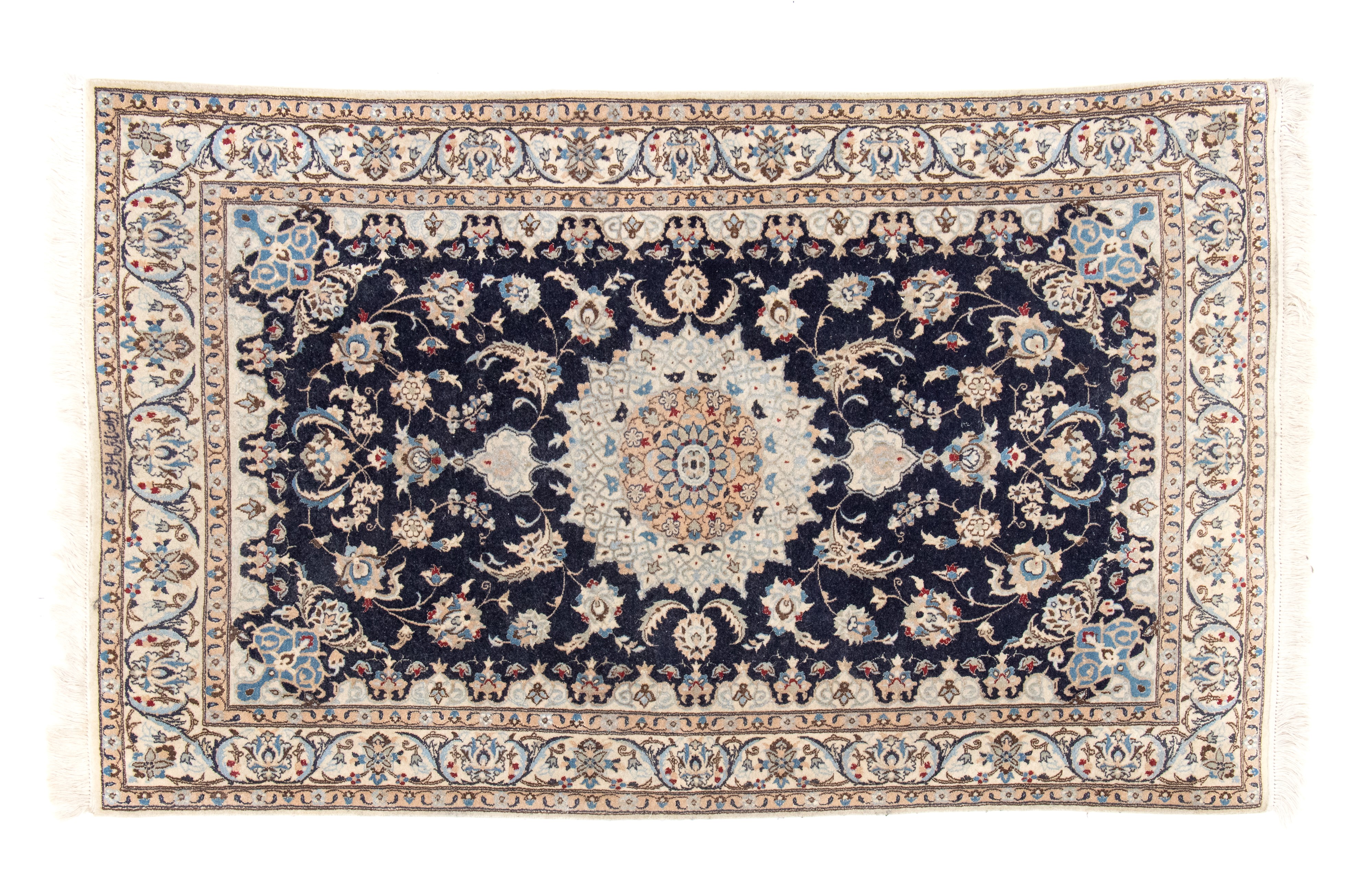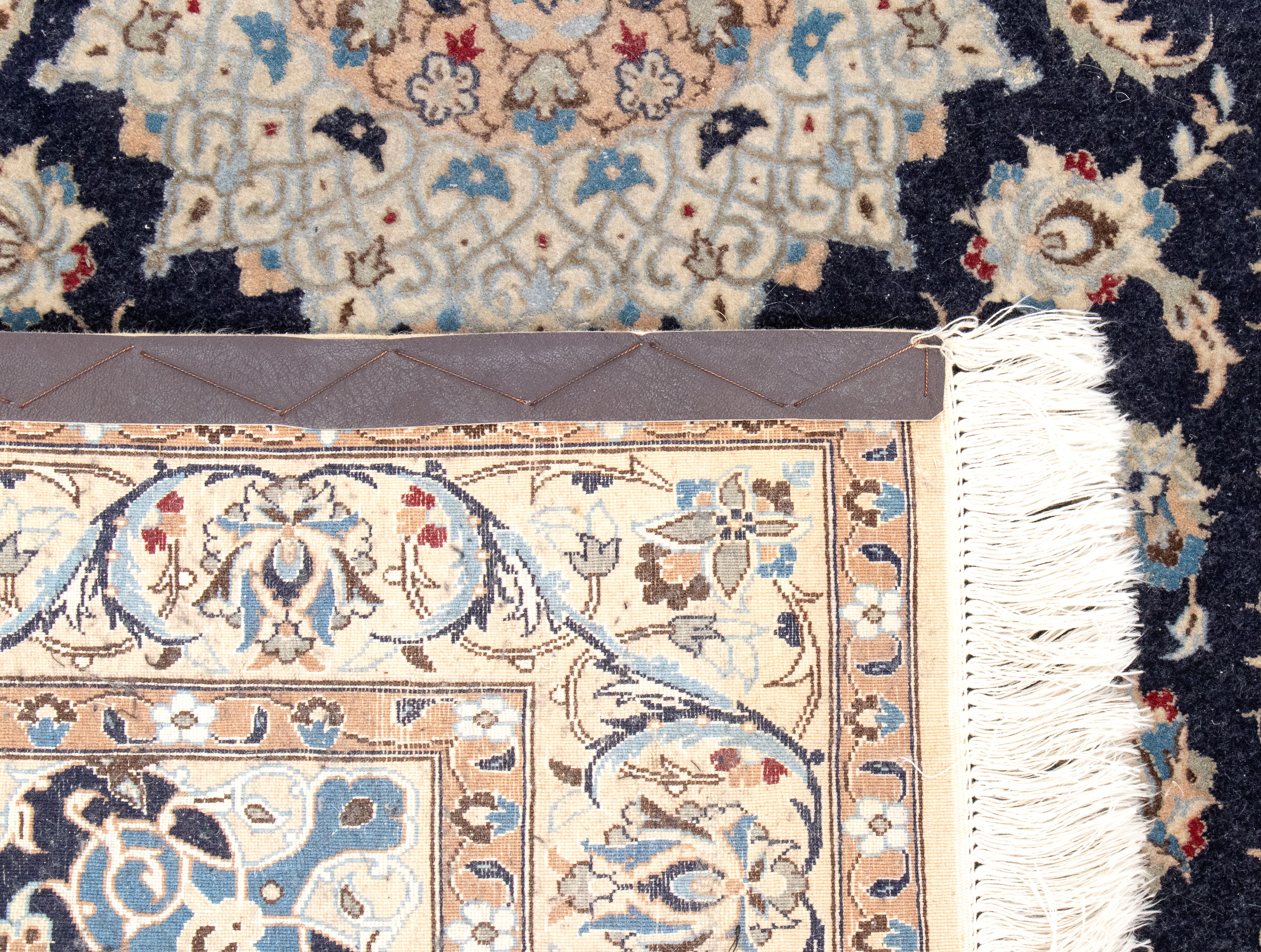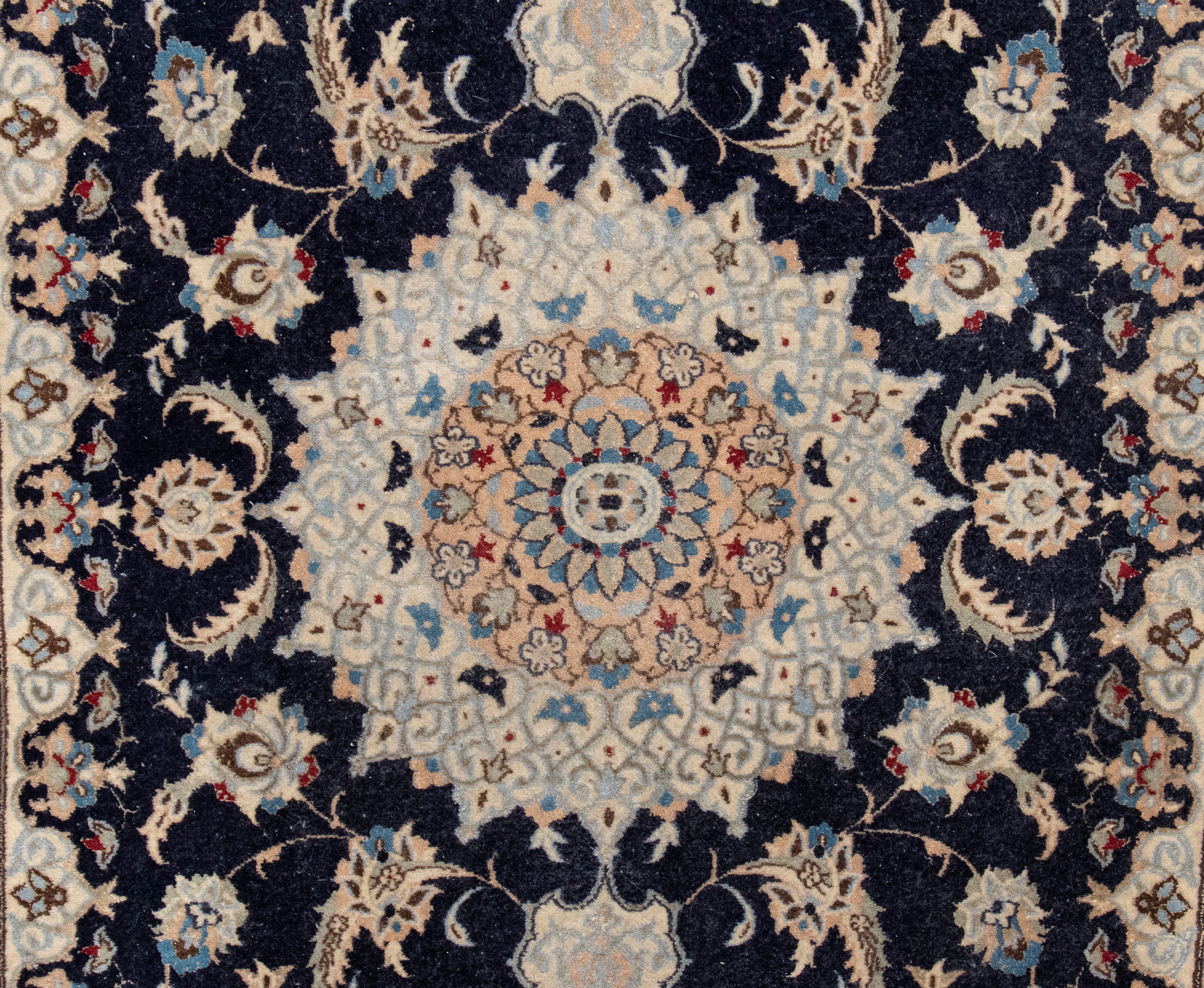 tappeto persiano con fondo blu scuro, medaglione centrale decorato a motivi floreali. Anni '70 circa.