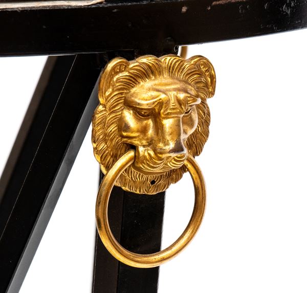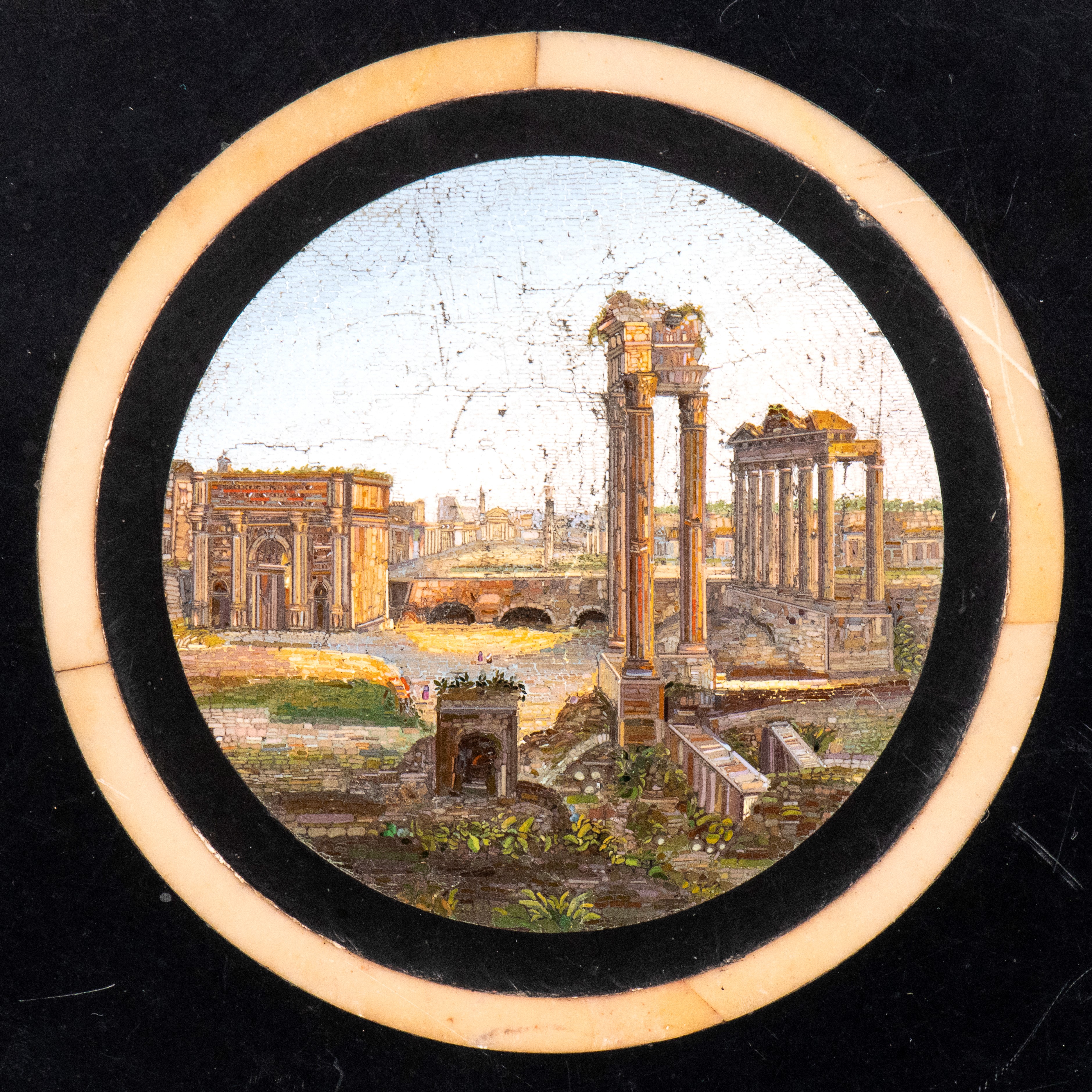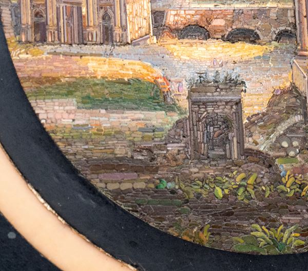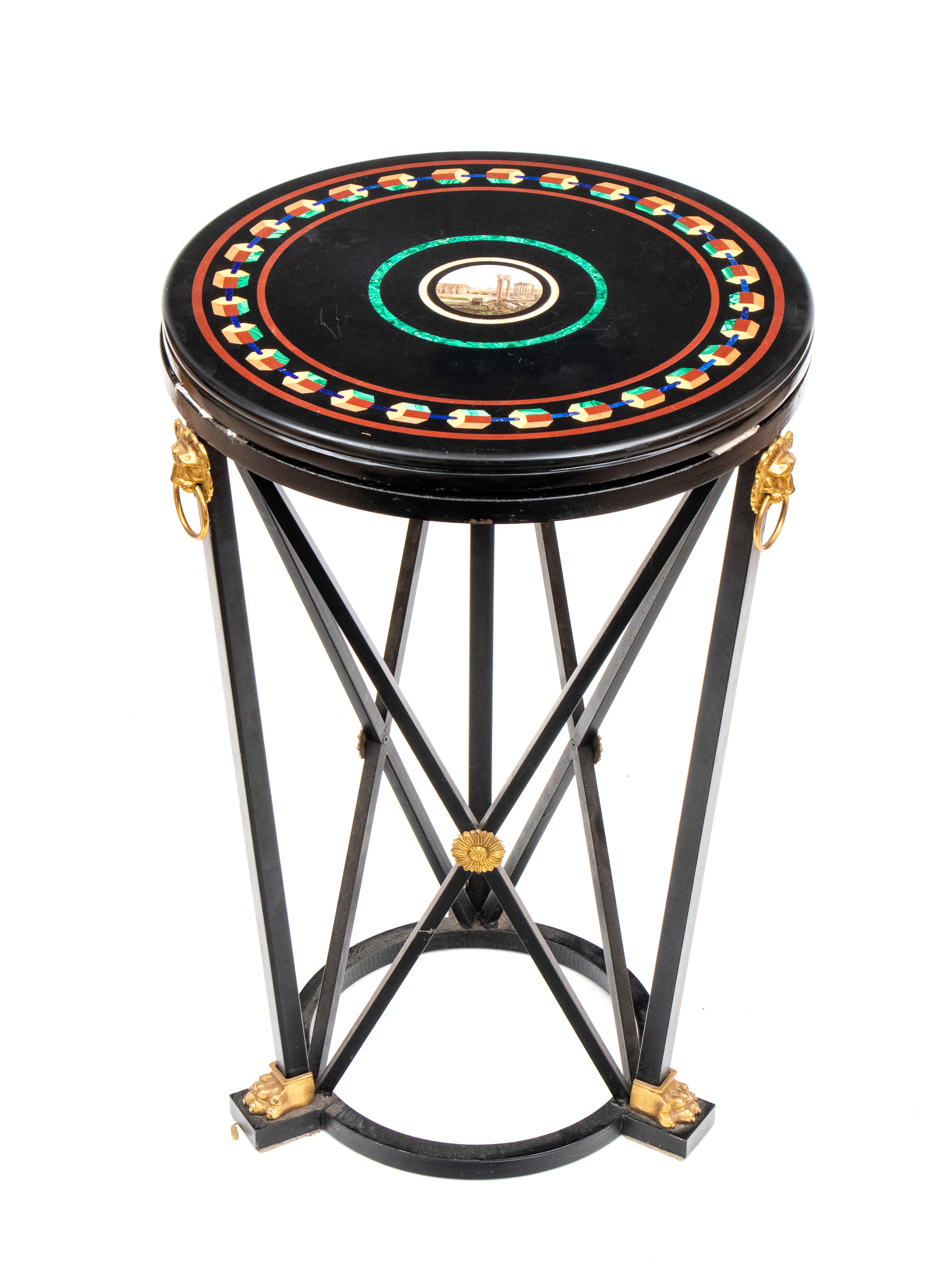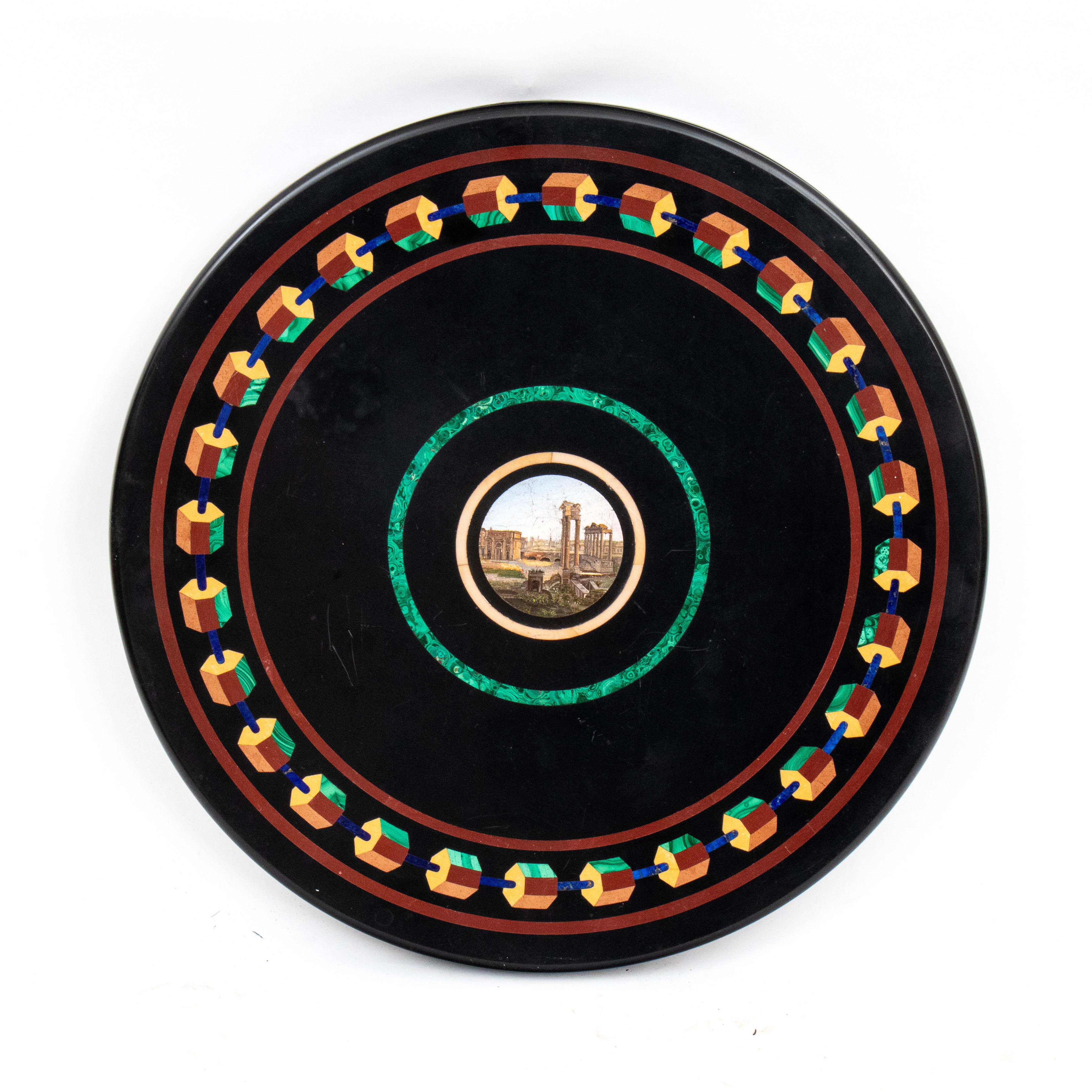 di forma circolare con piano in marmo nero decorato a commesso con pietre dure policrome, tra cui malachite, lapislazzuli e diaspro. Al centro , micro mosaico raffigurante veduta delle rovine del foro Romano. Fascia perimetrale decorata con motivi geometrici classici. Base in ferro battuto non coeva, con gambe incrociate a X, unite da traverse arcuate, ornata da apllicazionii n bronzo dorato.