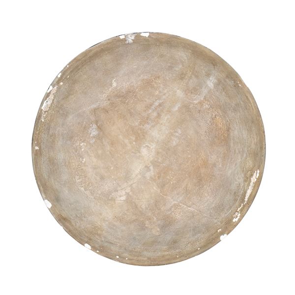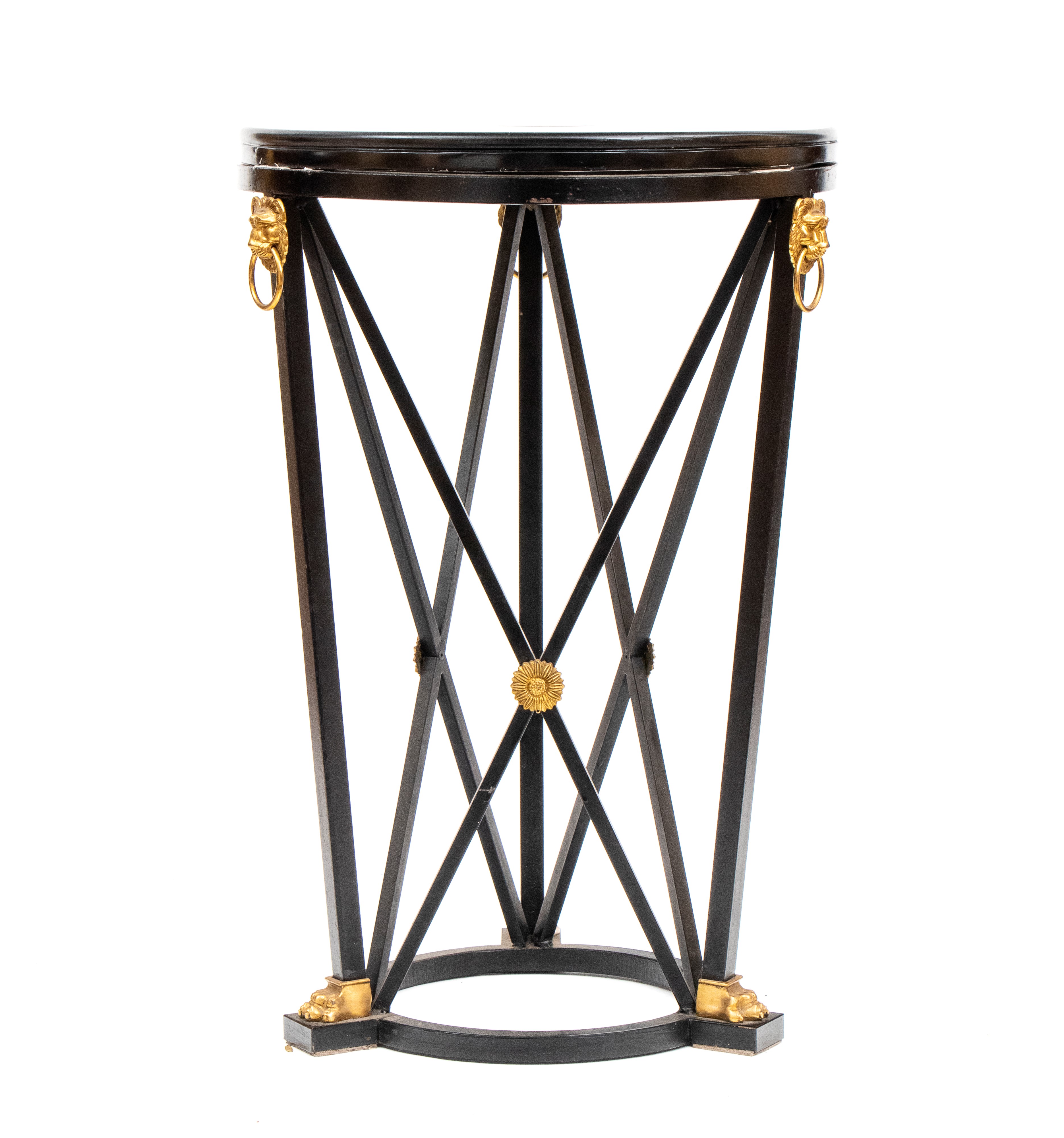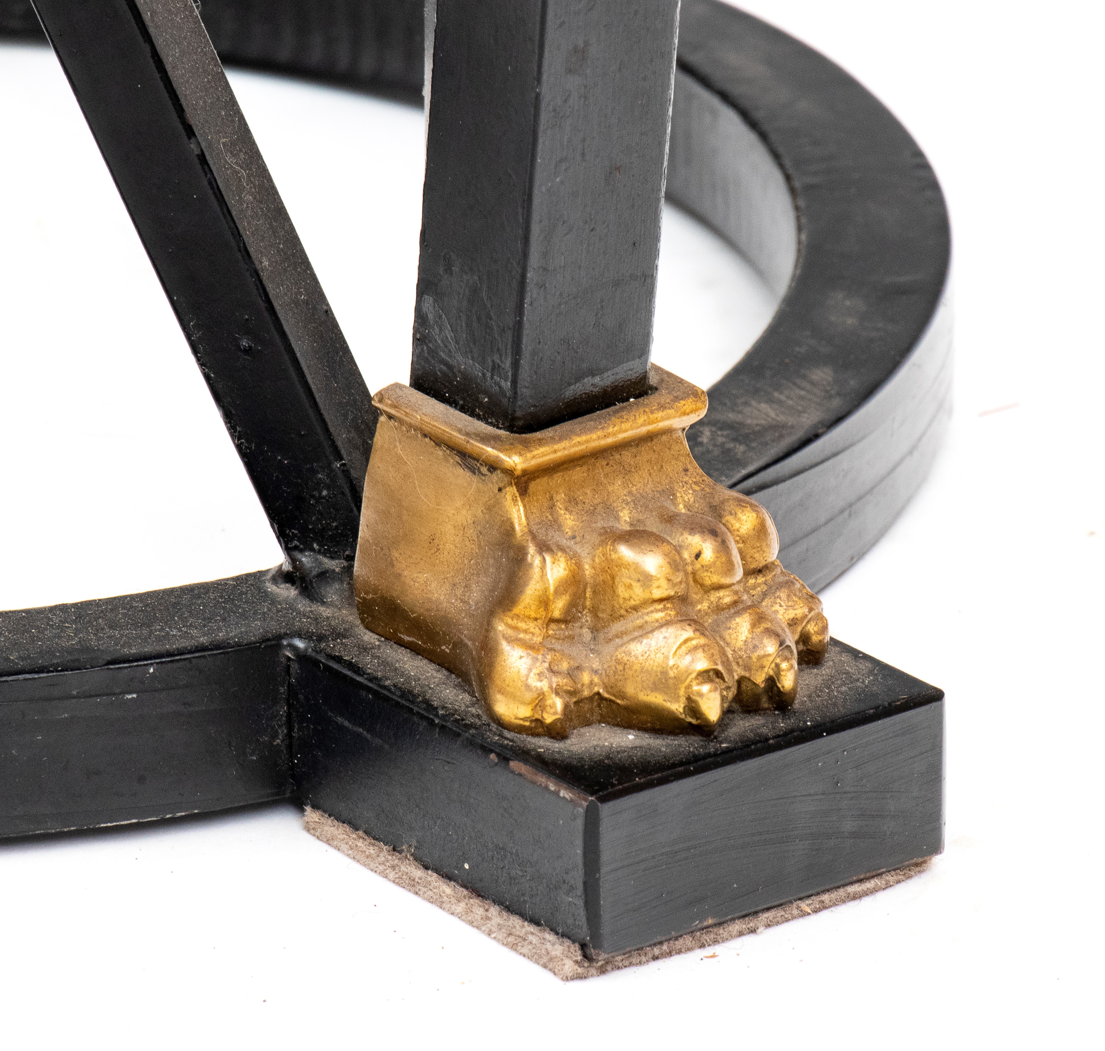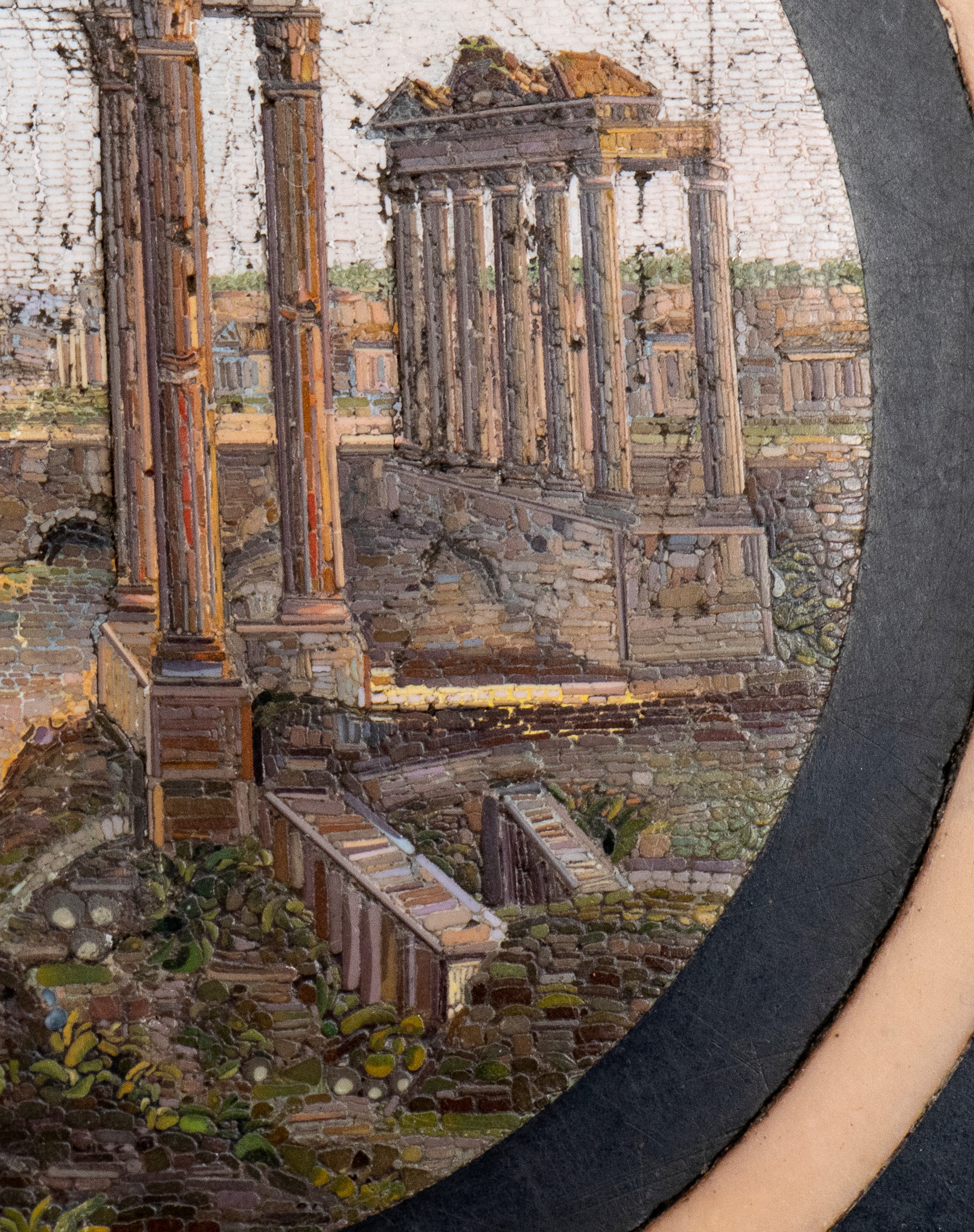 di forma circolare con piano in marmo nero decorato a commesso con pietre dure policrome, tra cui malachite, lapislazzuli e diaspro. Al centro , micro mosaico raffigurante veduta delle rovine del foro Romano. Fascia perimetrale decorata con motivi geometrici classici. Base in ferro battuto non coeva, con gambe incrociate a X, unite da traverse arcuate, ornata da apllicazionii n bronzo dorato.