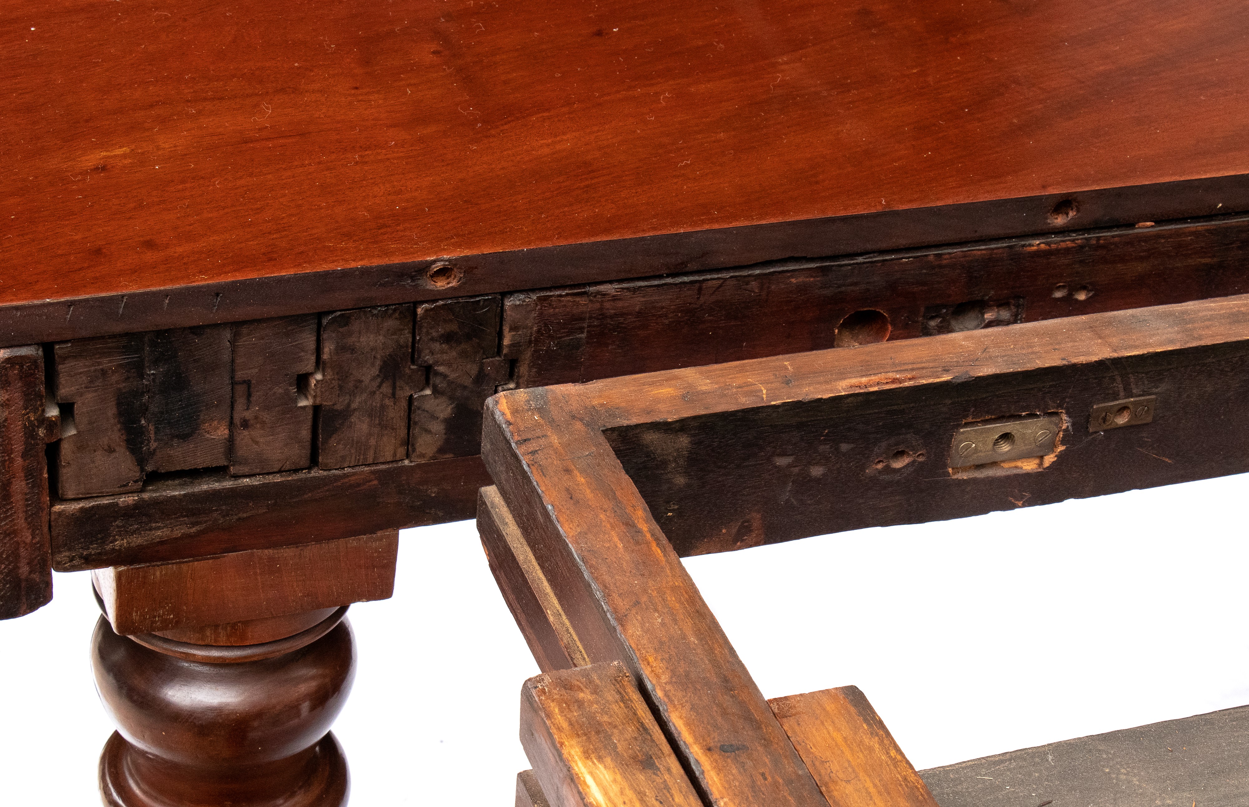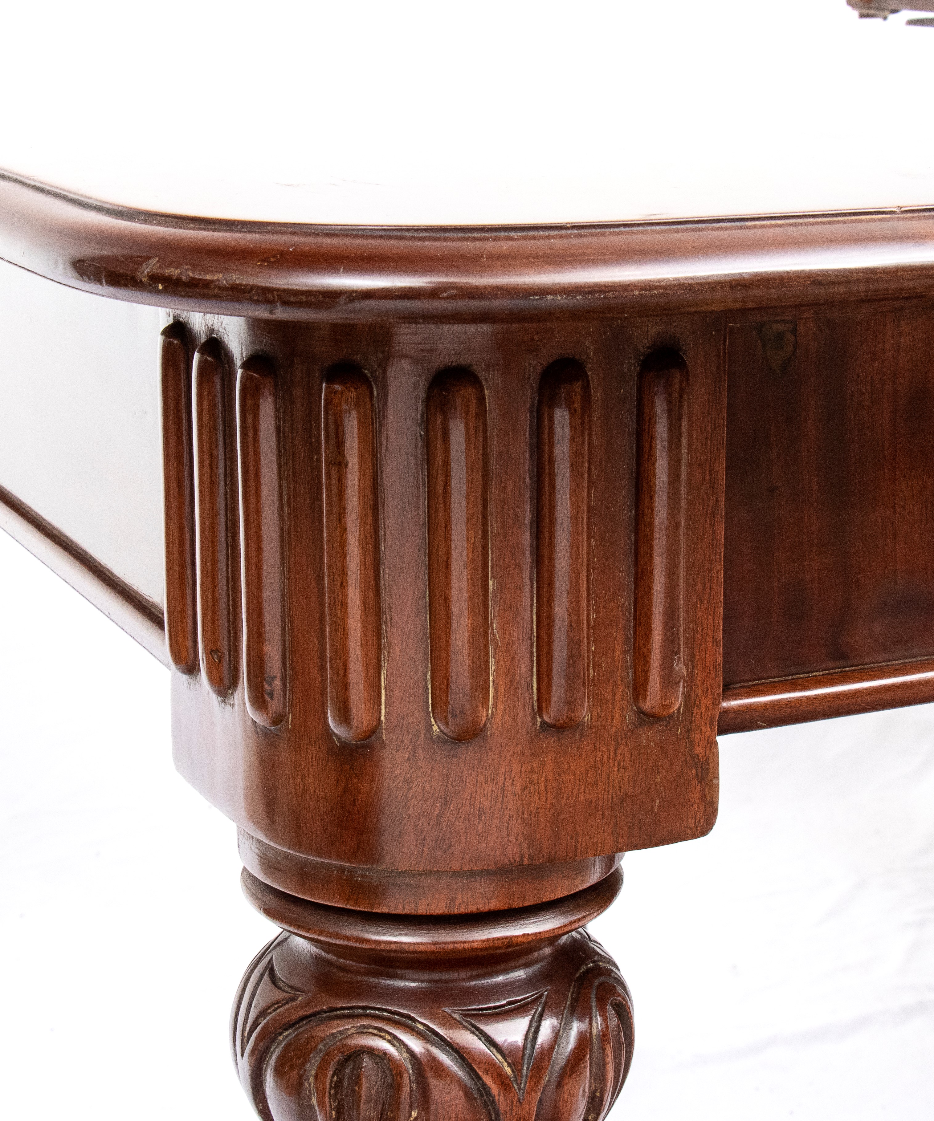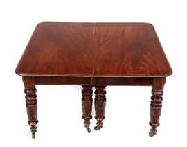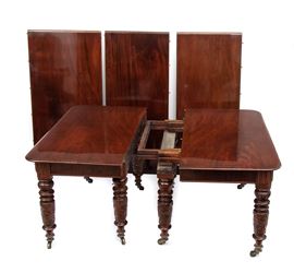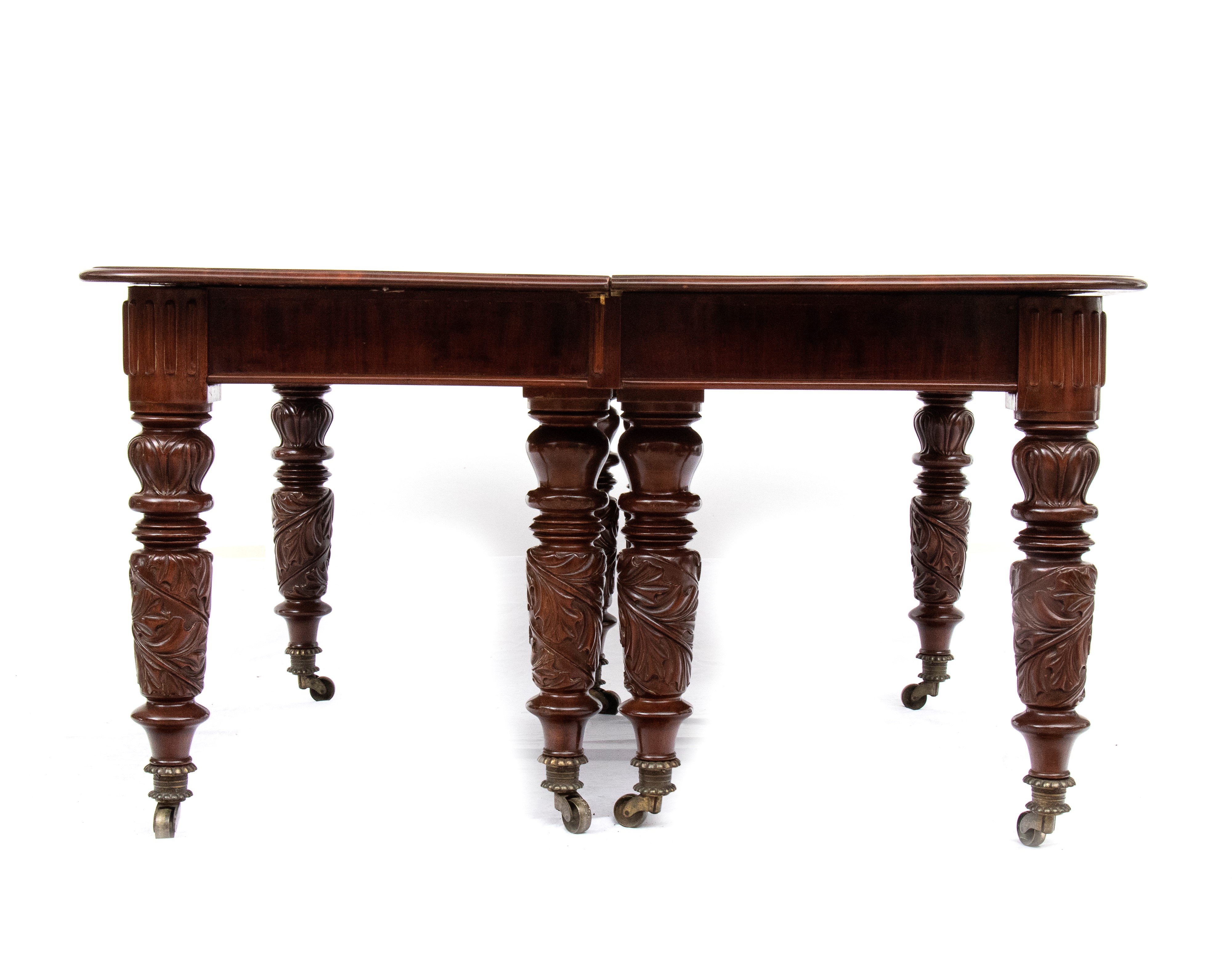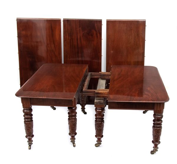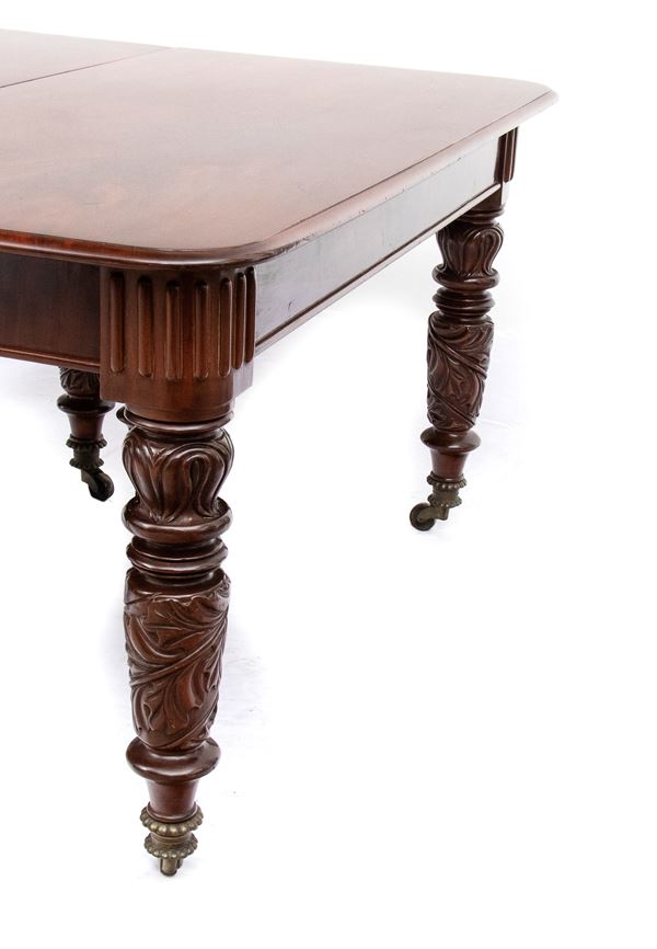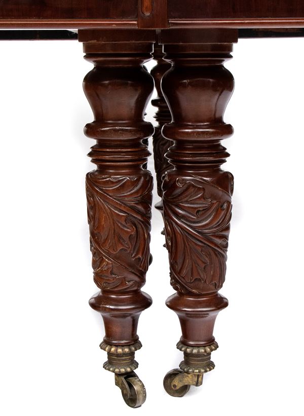 in mogano massello fiammato, unica tavola con taglio speculare, risalente al periodo georgiano, a cavallo tra la fine del XVIII secolo e inizi XIX secolo, con piano rettangolare allungabile. Otto gambe tornite, scolpite con motivi fogliacei, terminano con piedini a cipolla su rotelle in bronzo. Presenti tre allunghe originali in mogano massello: due da 60 cm. e uno da 70 cm., dovrebbe allungarsi per ulteriori tre prolunghe.