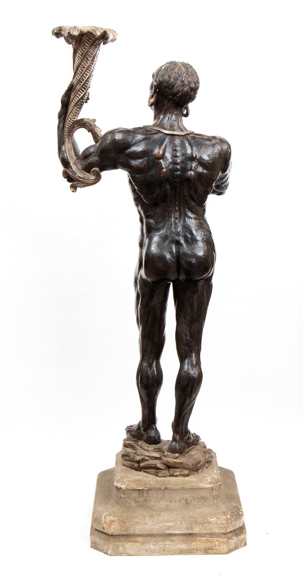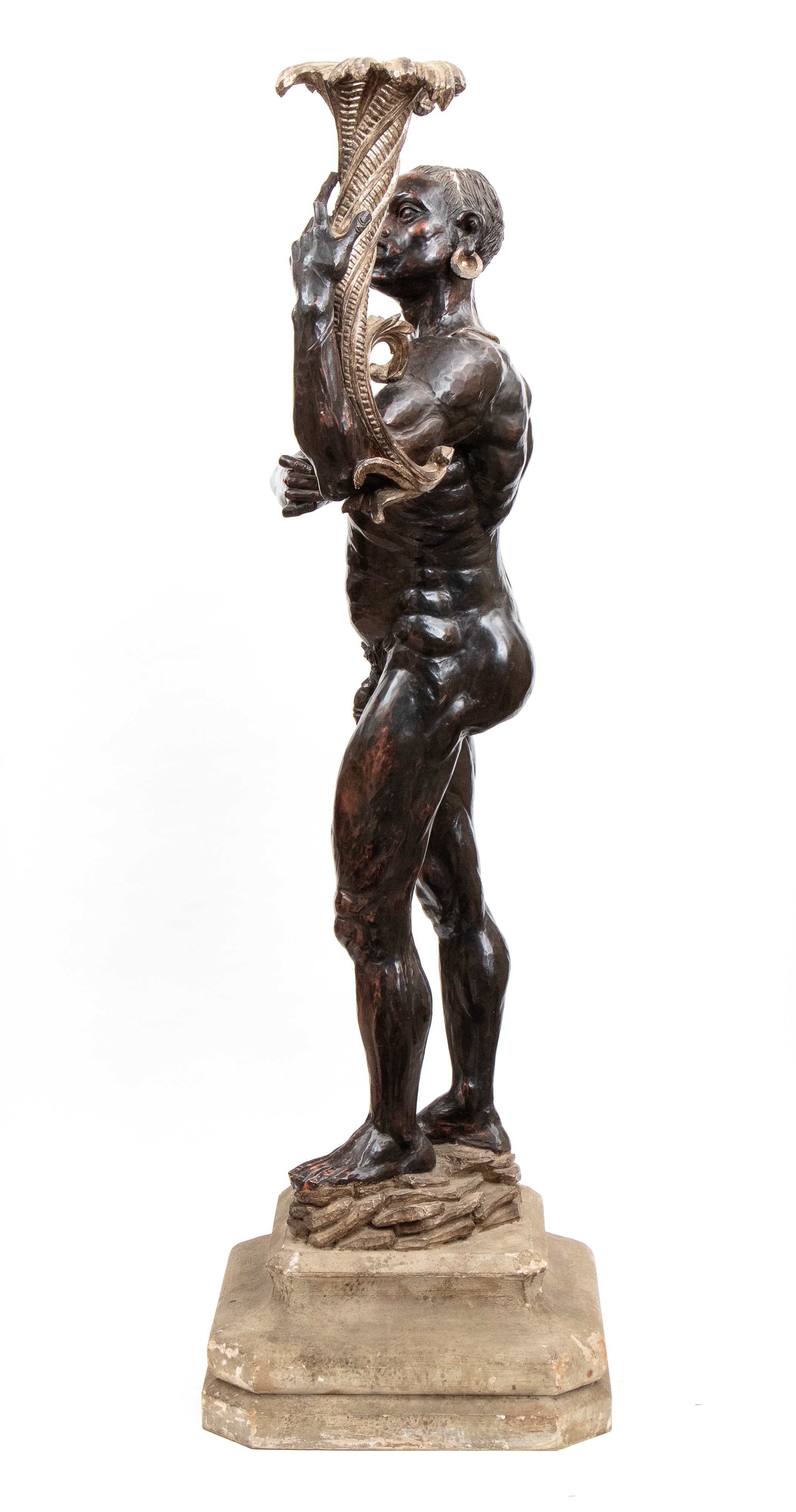 scultura a tutto tondo raffigurante figura maschile nuda, con braccio sollevato a reggere una torcia decorativa con elementi vegetali dorati a mecca. Base a plinto