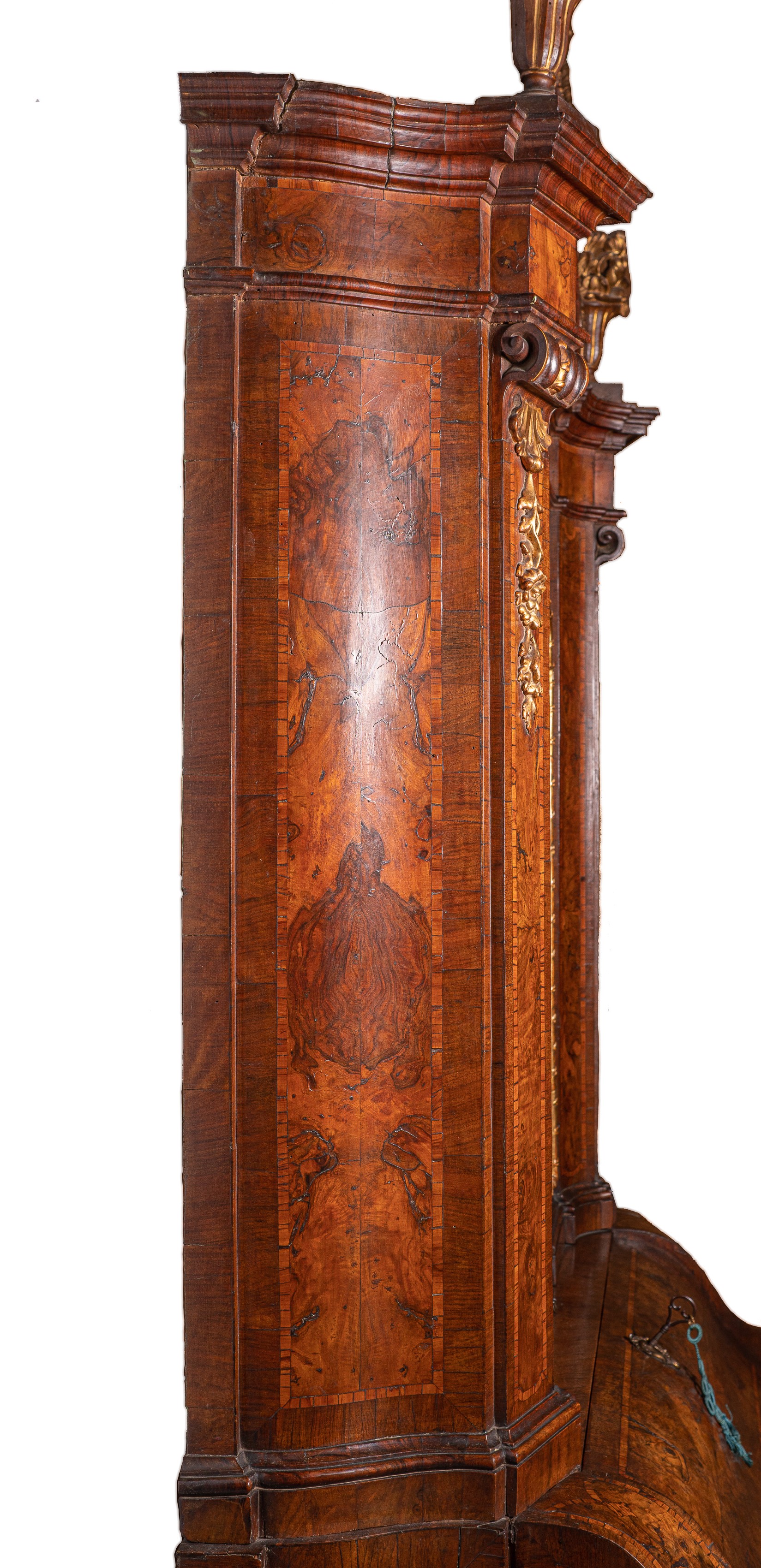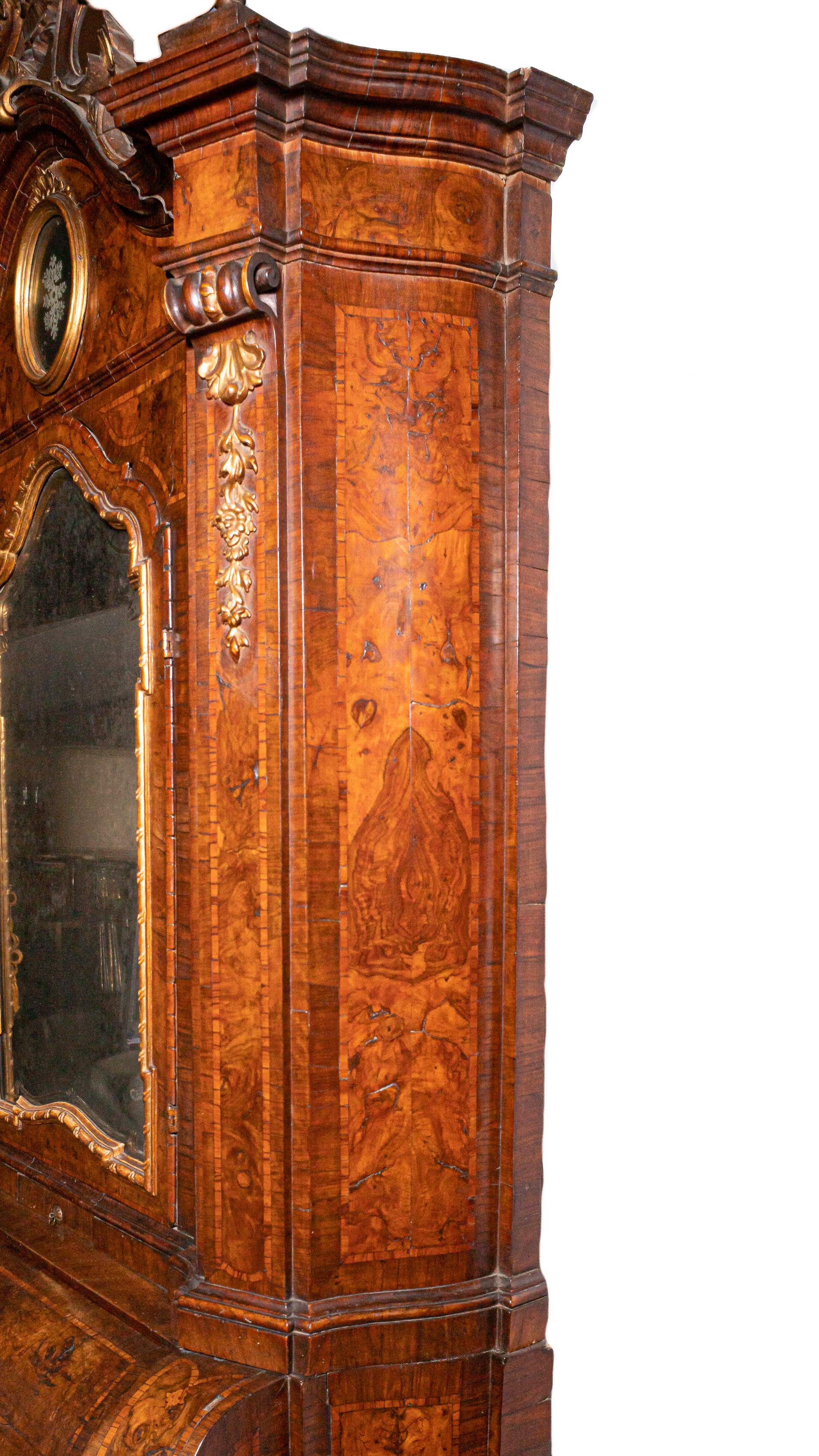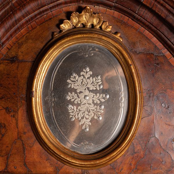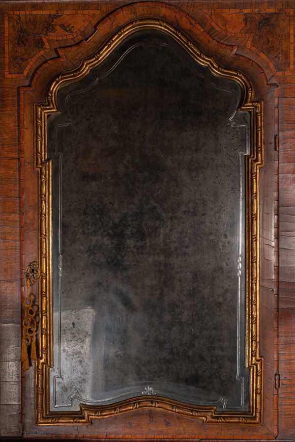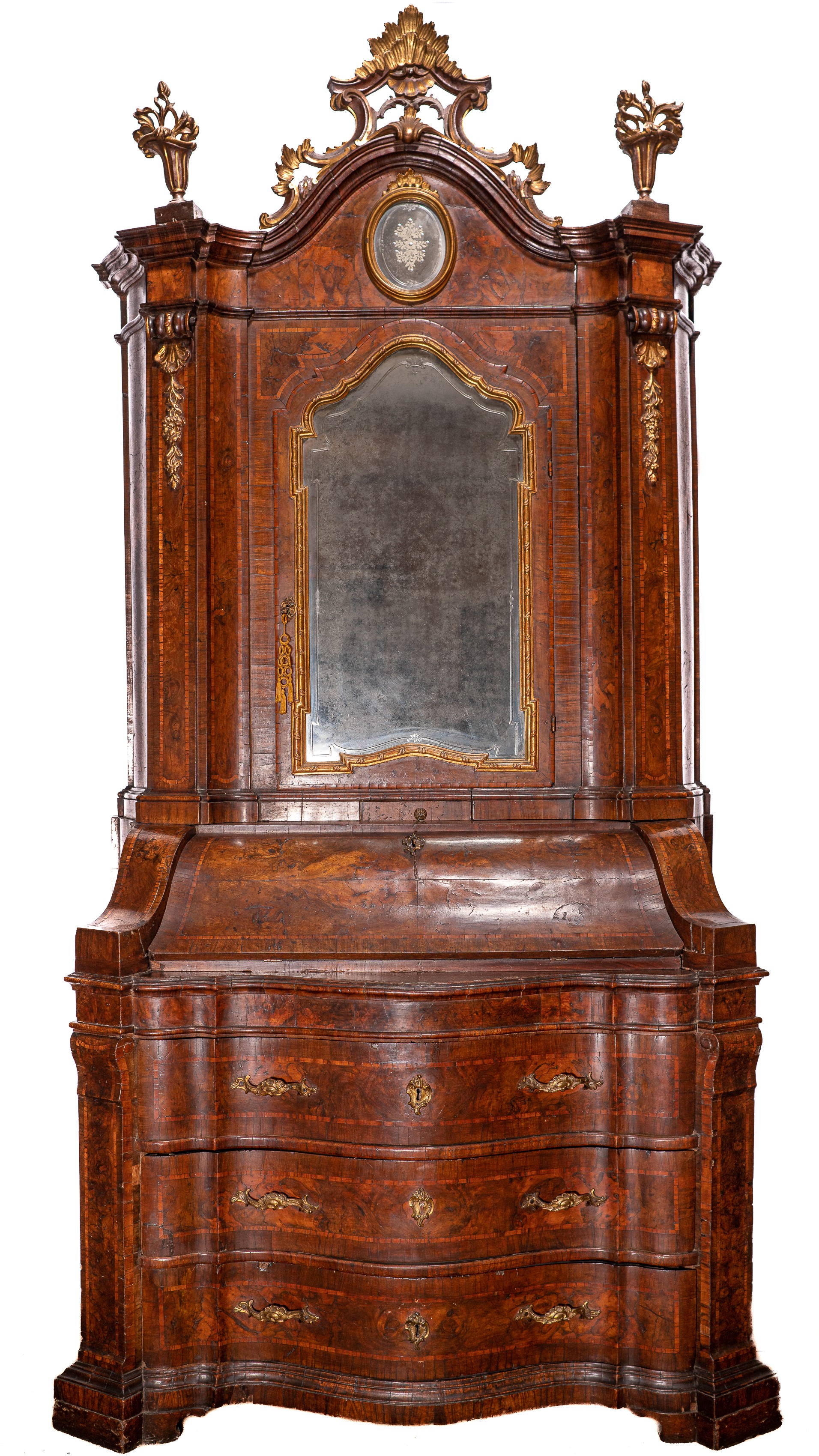 raro e imponente trumeau lastronato in radica di noce, metà del XVIII secolo, mosso sul fronte e con fianchi mossi a doppia mossa. Parte superiore con alzata a specchio incorniciata da modanature sagomate, sormontata da cimasa intagliata e dorata con riserva ovale dipinta. Corpo inferiore con ribalta celante cassettiera e vani interni, piede a zoocolo. Maniglie e bocchette in bronzo cesellato e dorato.