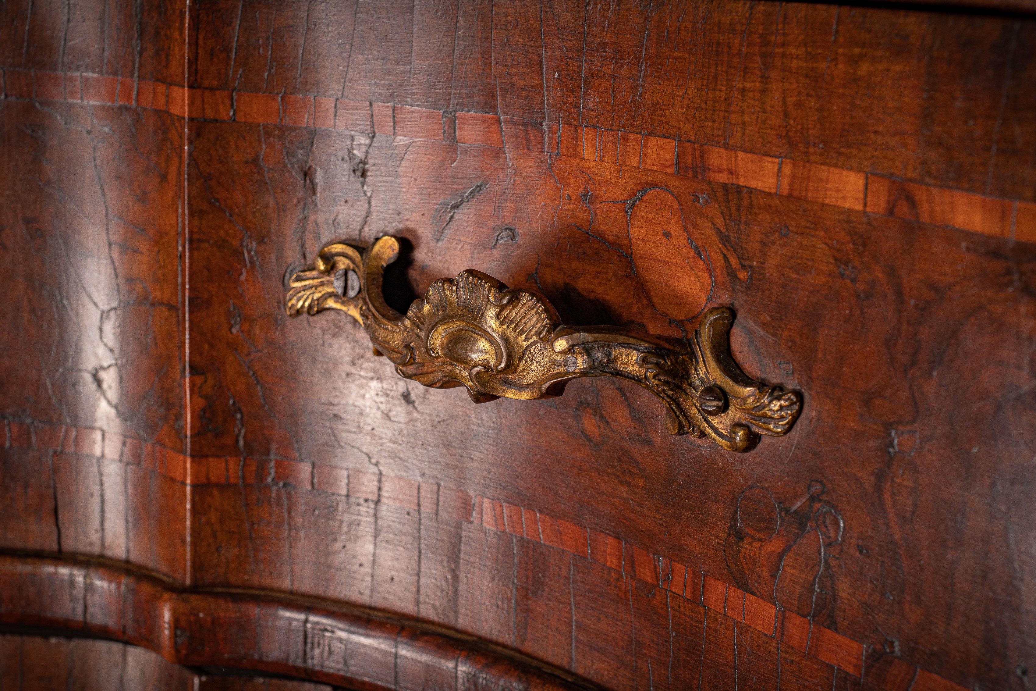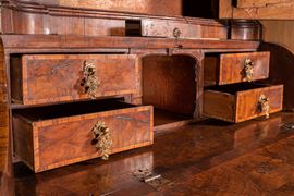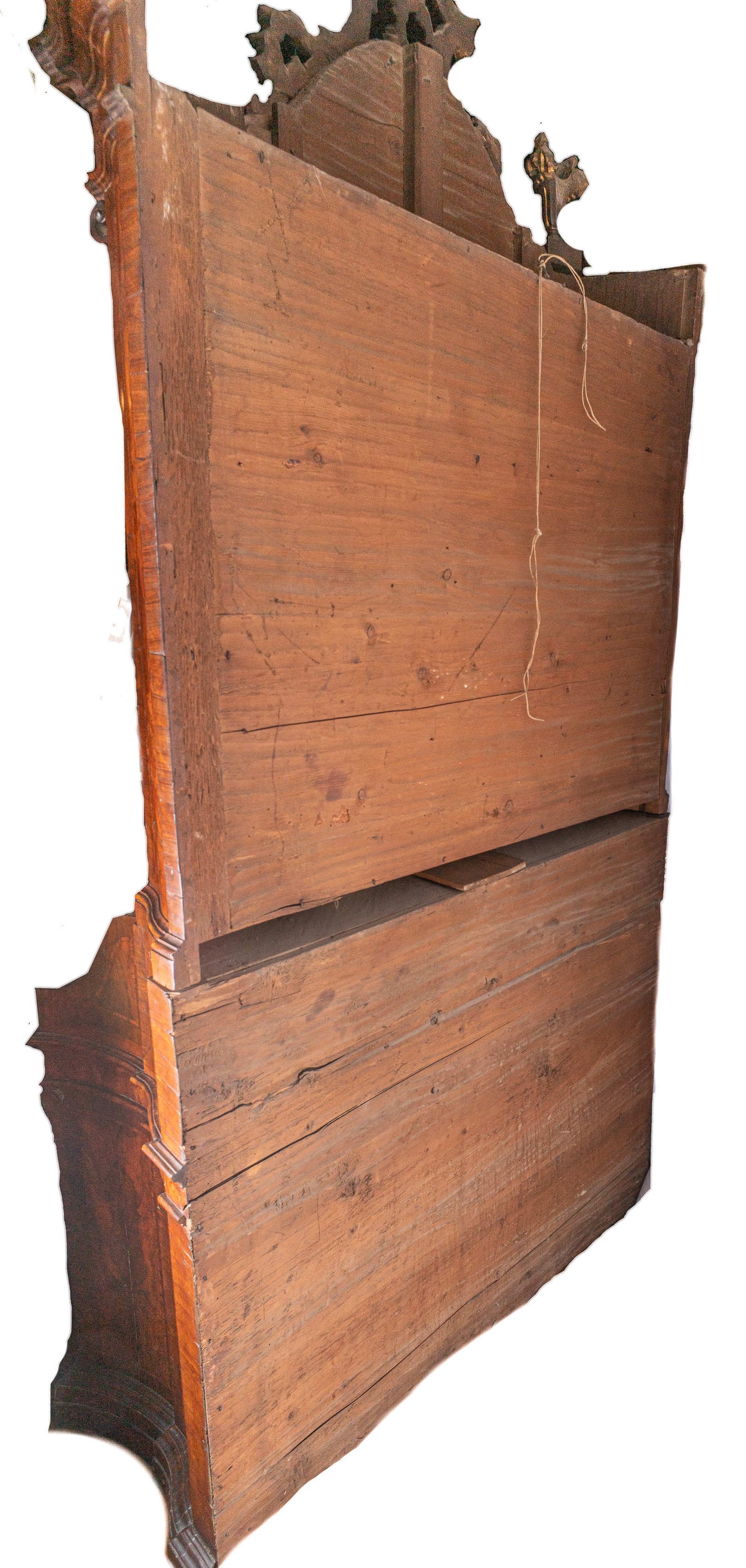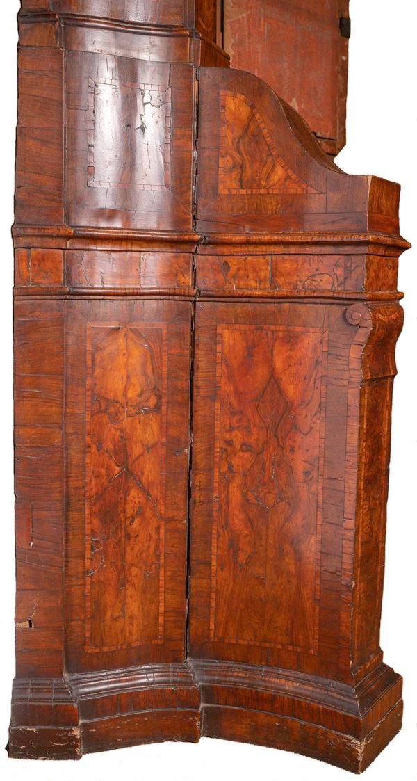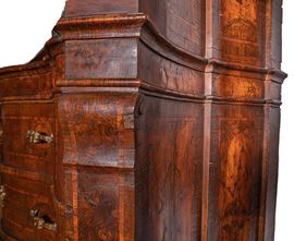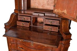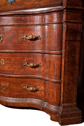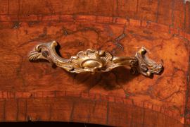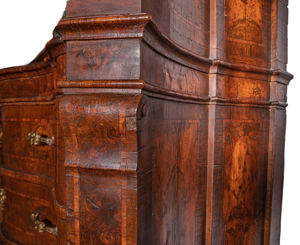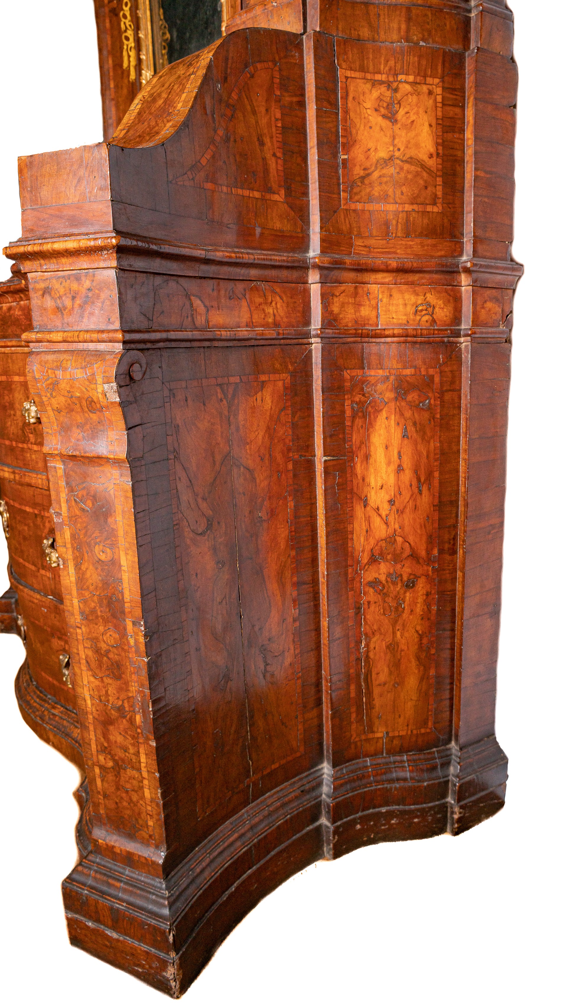 raro e imponente trumeau lastronato in radica di noce, metà del XVIII secolo, mosso sul fronte e con fianchi mossi a doppia mossa. Parte superiore con alzata a specchio incorniciata da modanature sagomate, sormontata da cimasa intagliata e dorata con riserva ovale dipinta. Corpo inferiore con ribalta celante cassettiera e vani interni, piede a zoocolo. Maniglie e bocchette in bronzo cesellato e dorato.