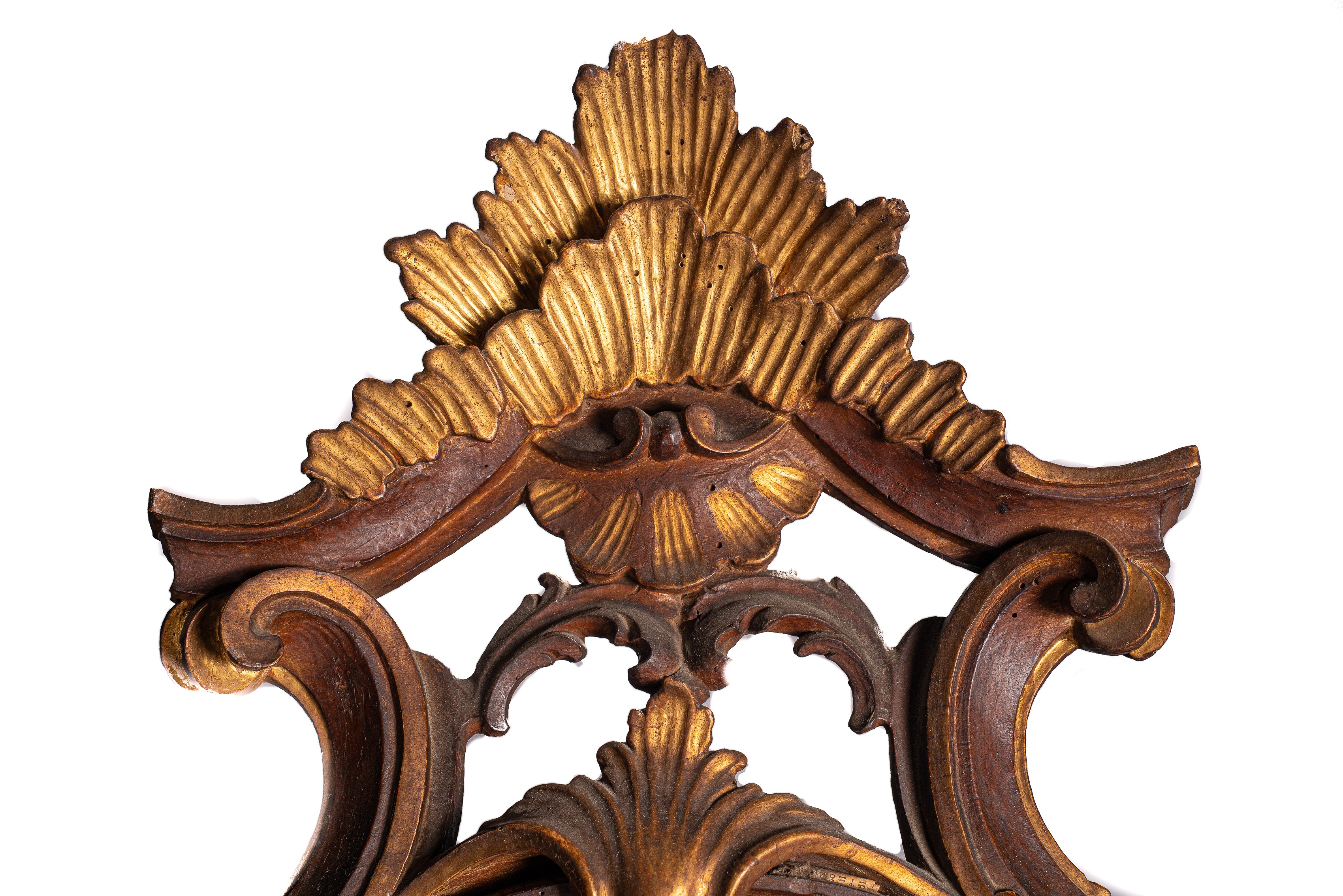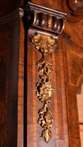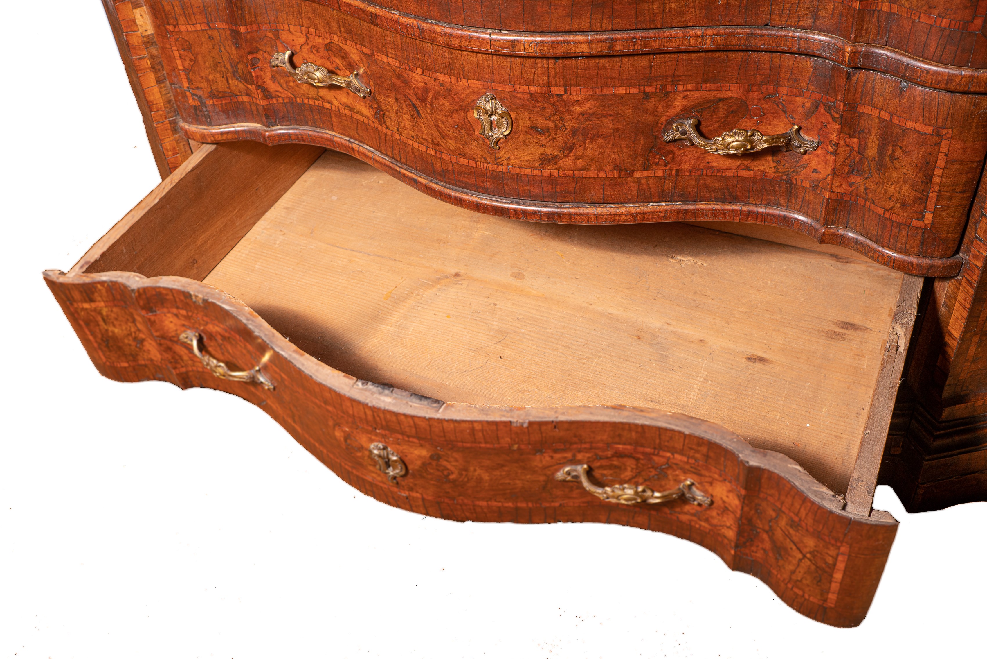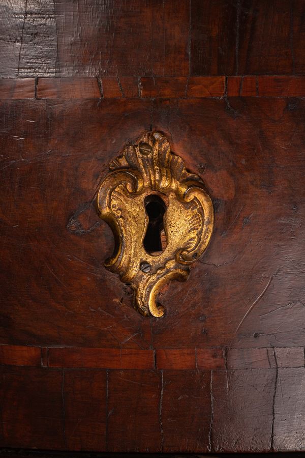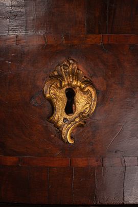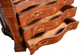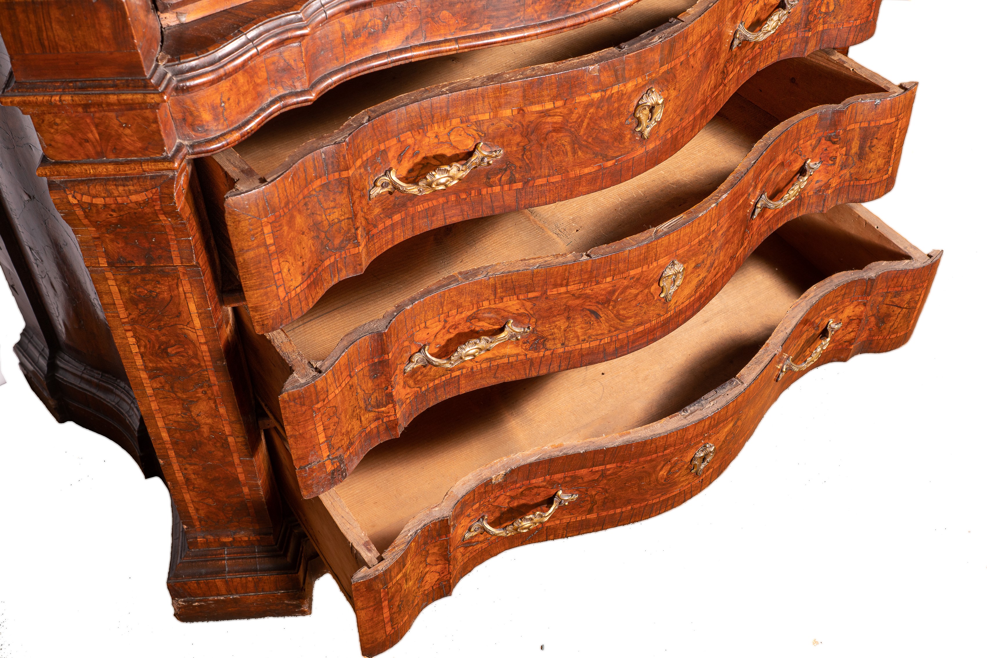 raro e imponente trumeau lastronato in radica di noce, metà del XVIII secolo, mosso sul fronte e con fianchi mossi a doppia mossa. Parte superiore con alzata a specchio incorniciata da modanature sagomate, sormontata da cimasa intagliata e dorata con riserva ovale dipinta. Corpo inferiore con ribalta celante cassettiera e vani interni, piede a zoocolo. Maniglie e bocchette in bronzo cesellato e dorato.