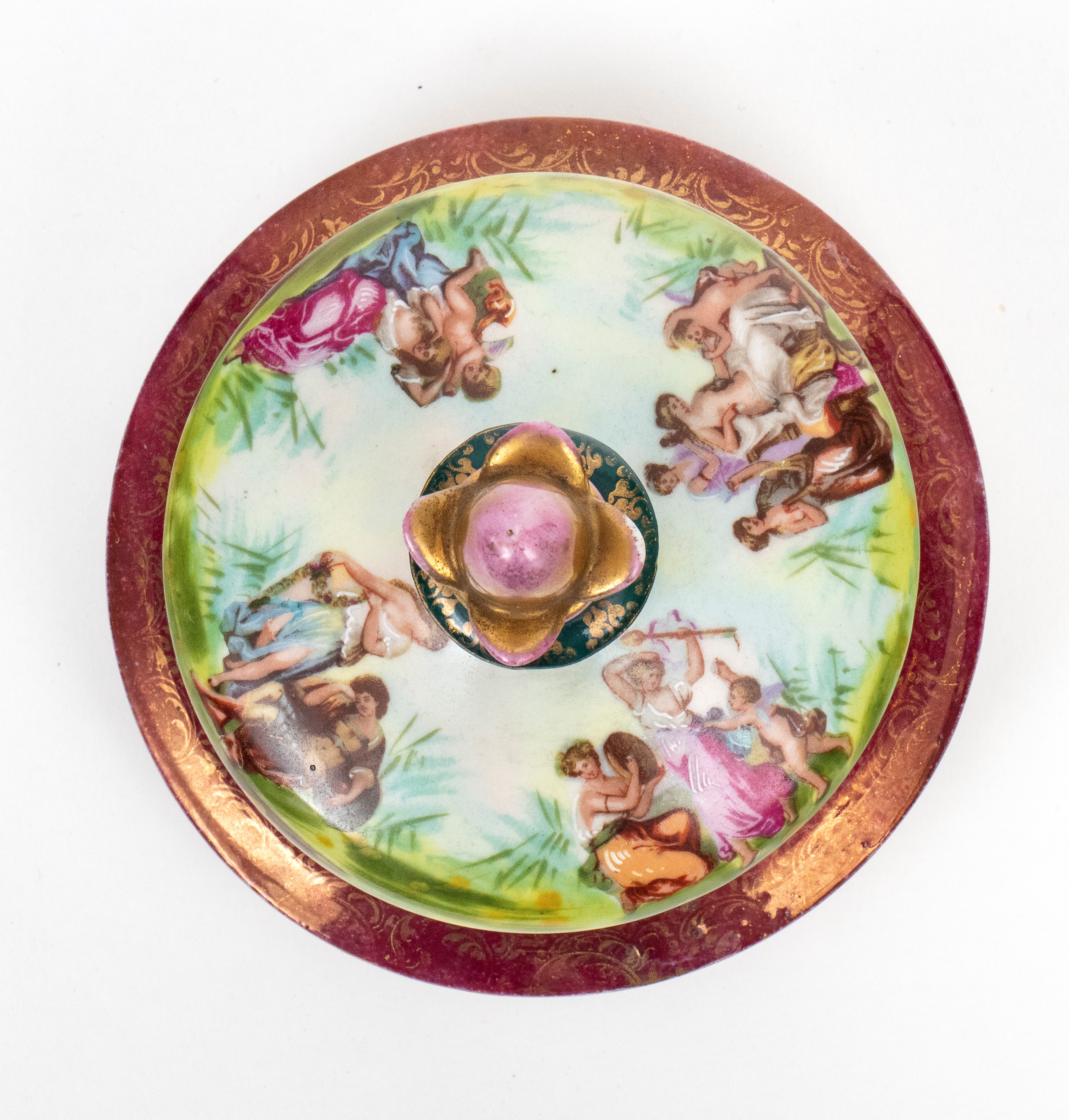 finemente dipinto con scene mitologiche con personaggi e putti, ornamenti floreali sui bordi e base.
