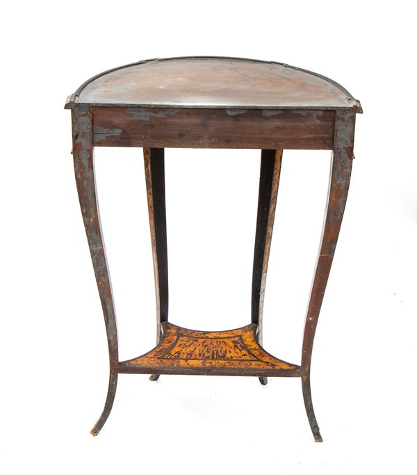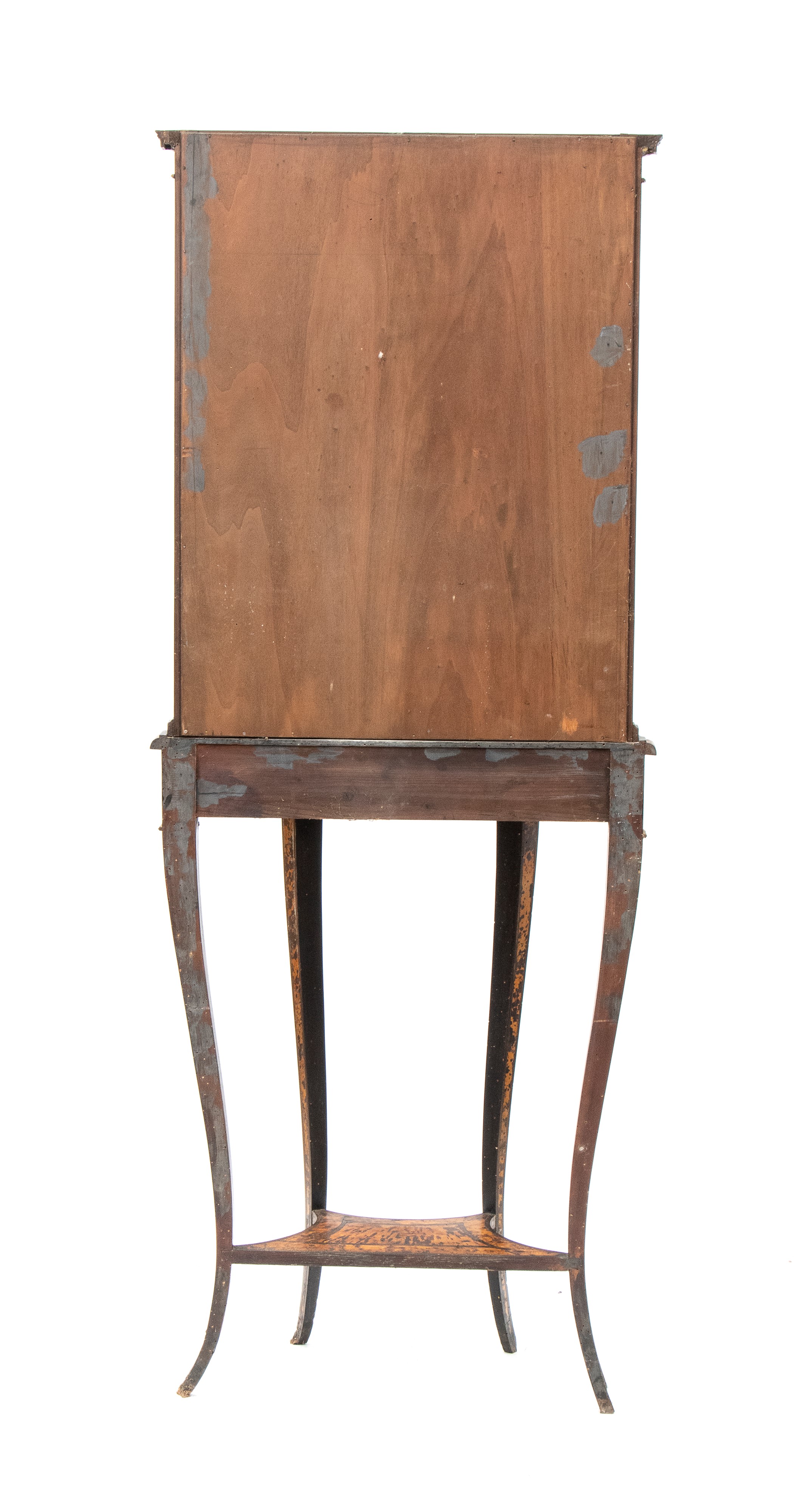La struttura, in legno massello, si caratterizza per le linee mosse e slanciate, con corpo centrale arcuato, vetri curvi originali e gambe alte a sciabola, raccordate da una crociera inferiore sagomata. L’intero mobile è lastronato in tartaruga naturale con profili e riquadrature in legno ebanizzato. Il gioco cromatico tra le venature ambrate della tartaruga e il nero dell’ebano dona all’oggetto un effetto visivo di grande ricchezza e raffinatezza.