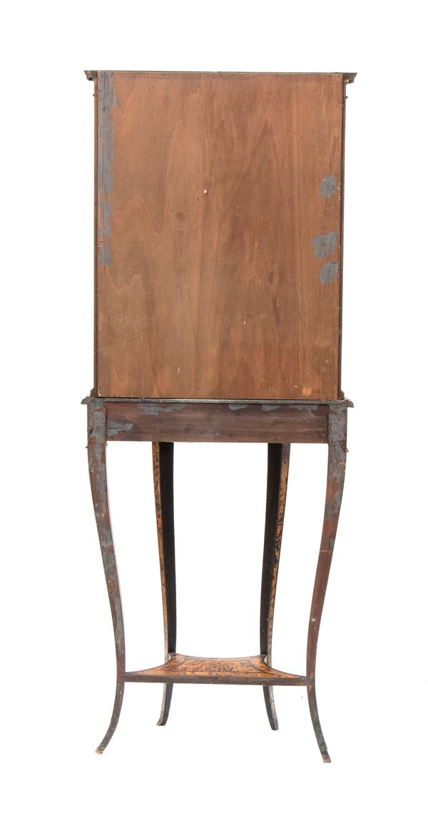 I vetri sono disposti su tre lati, compreso il frontale apribile a sportello, offrendo un’ottima visibilità al contenuto interno, disposto su un ripiano in vetro. Il bordo superiore e la fascia inferiore presentano raffinati motivi intagliati e perlinature, mentre la base poggia su quattro gambe arcuate decorate, coerenti con lo stile floreale e slanciato del mobile.