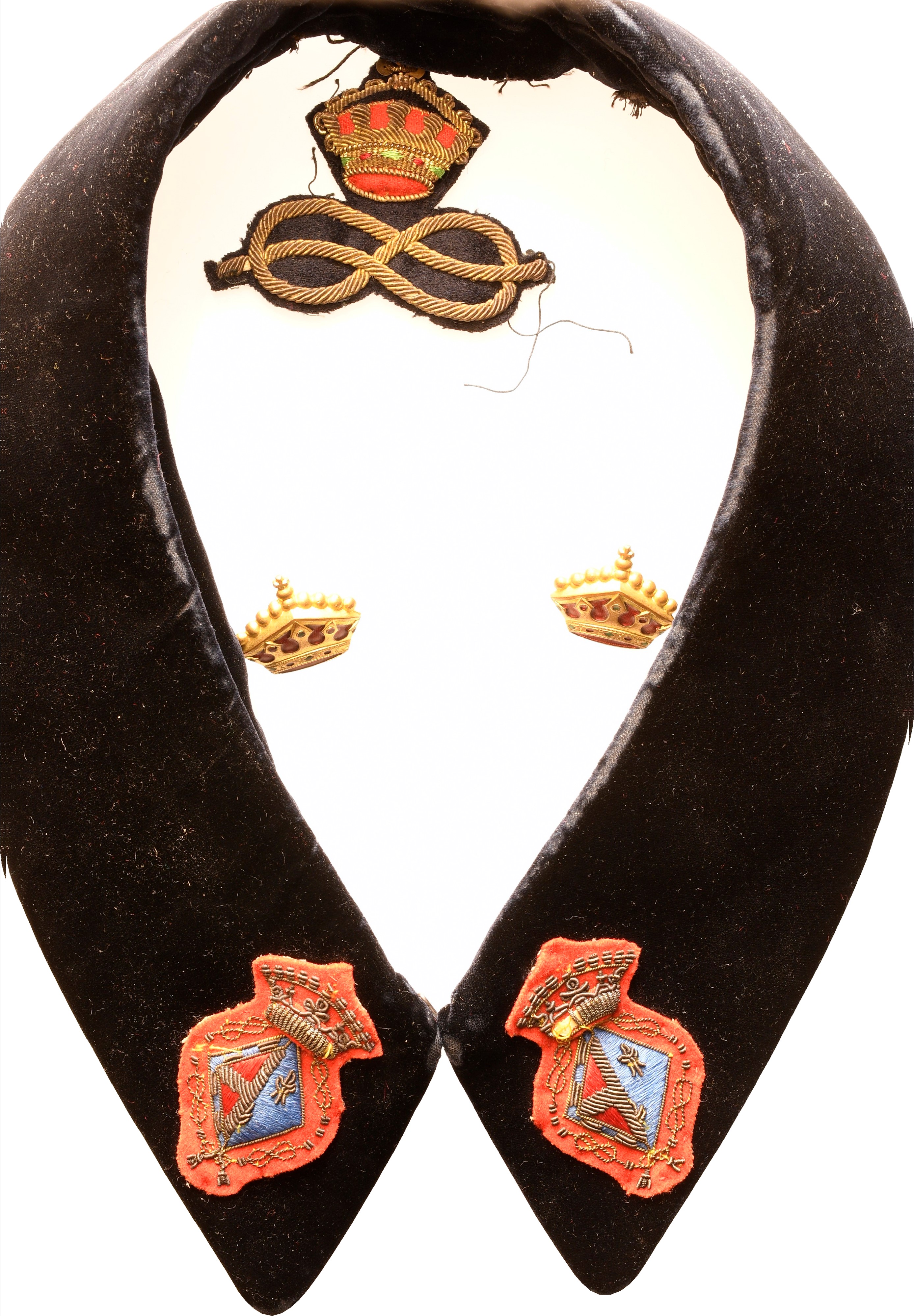 Casa del Duca di Aosta, lotto formato da collo in velluto con applicate le insegne della casa Aosta in canottiglia ricamata su fondo di panno rosso scarlato, due coroncine metalliche ducali e fregio ricamato di canottiglia dorata con nodo savoia e corona ducale, tutto in ottimo stato.