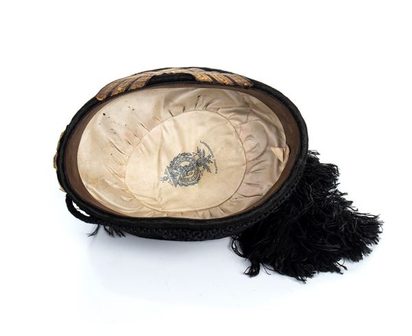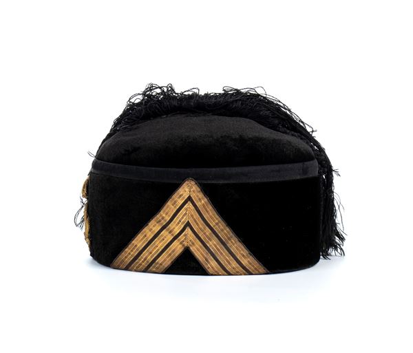 Fez colbac da ufficiale inferiore della MVSN stradale, corpo rigido ricoperto di velluto di seta, bel fregio ricamato in canottiglia dorata, grado laterale e cordone di seta, interno di seta con marchi del fabbricante, in ottimo stato.