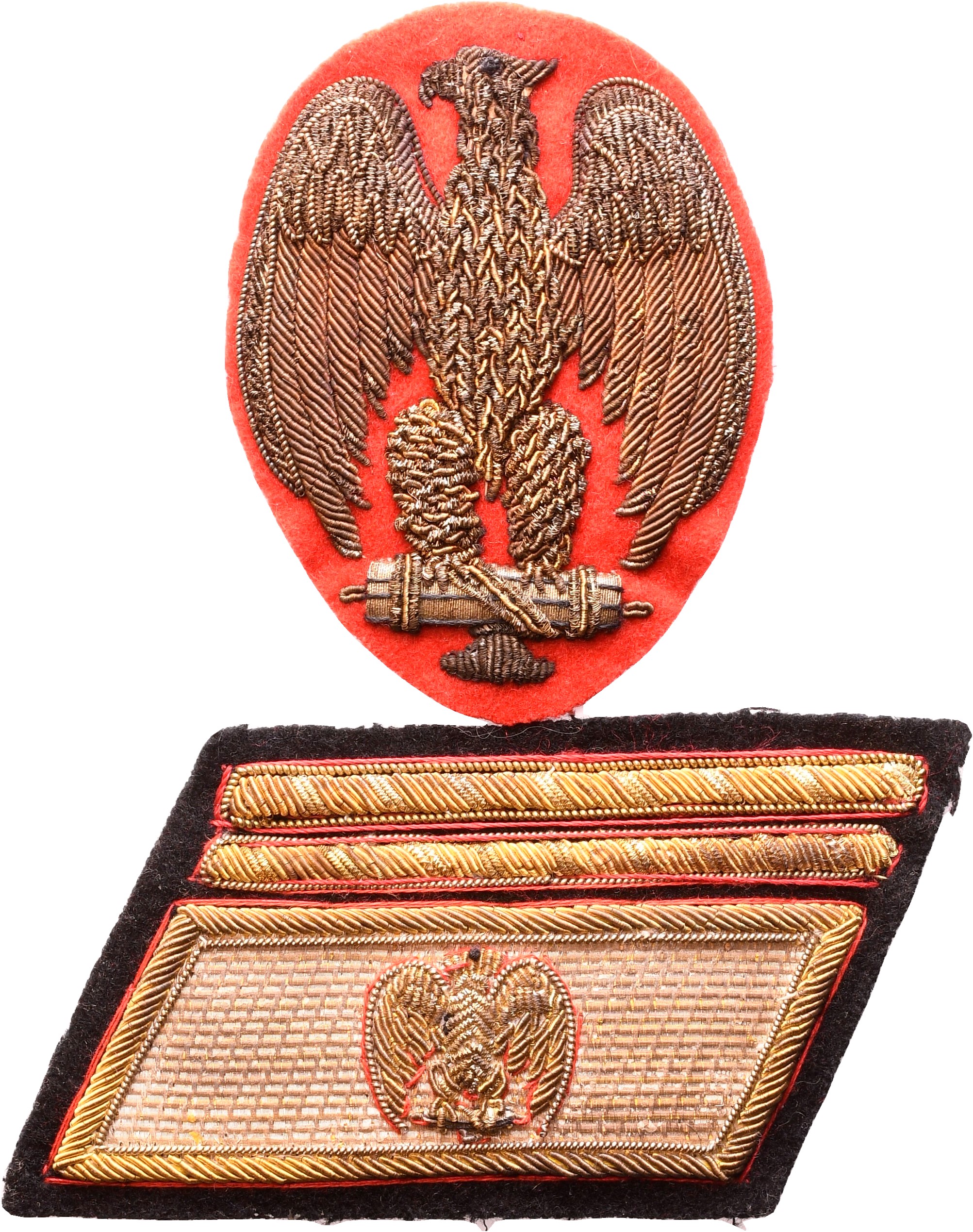 Bellissima aquila di canottiglia dorata ricamata su sfondo di panno scarlatto, grado laterale a losanga con due righe sopra il cartiglio d'argento caricato di aquila; in ottimo stato e di ottima fattura.