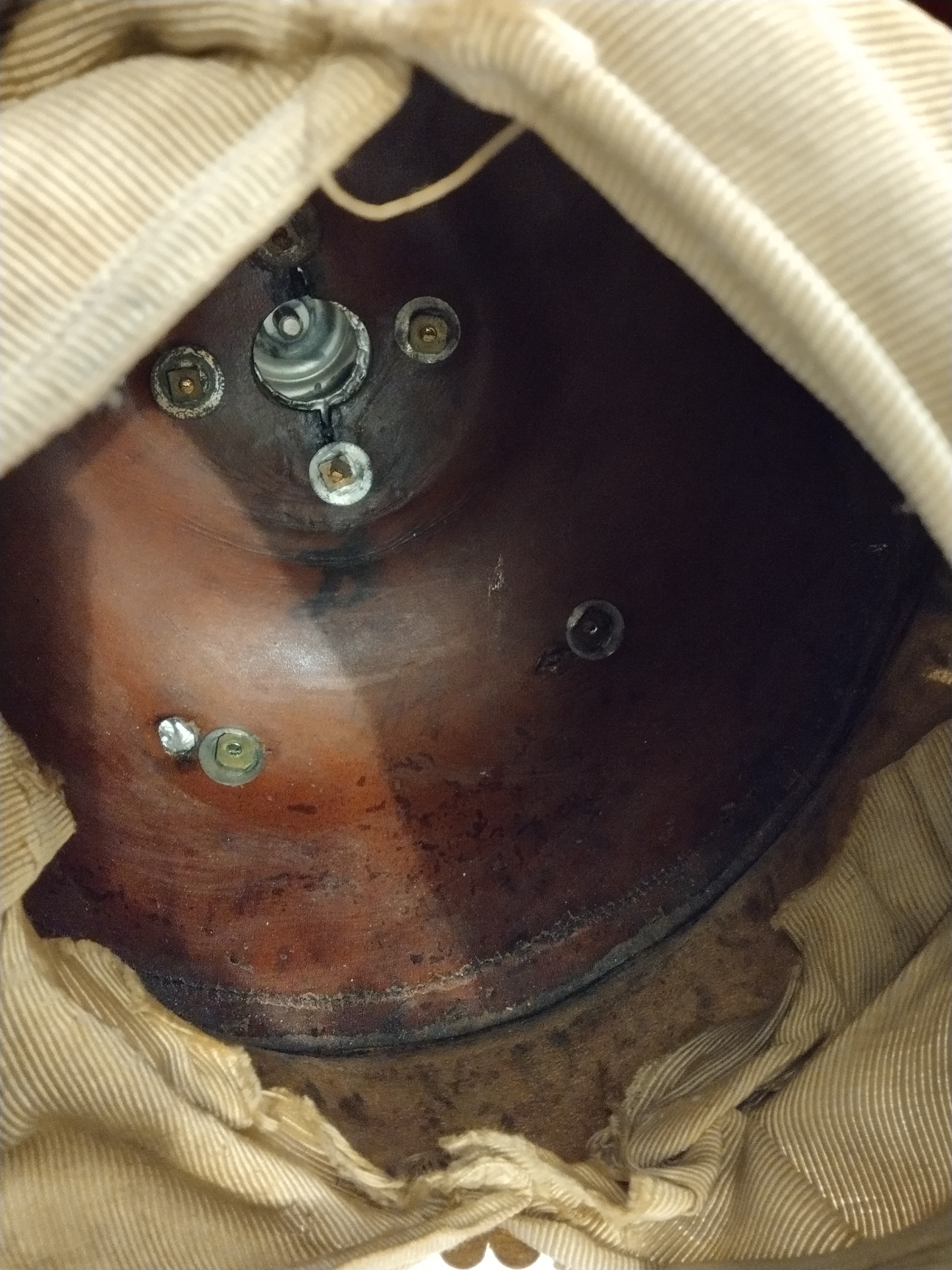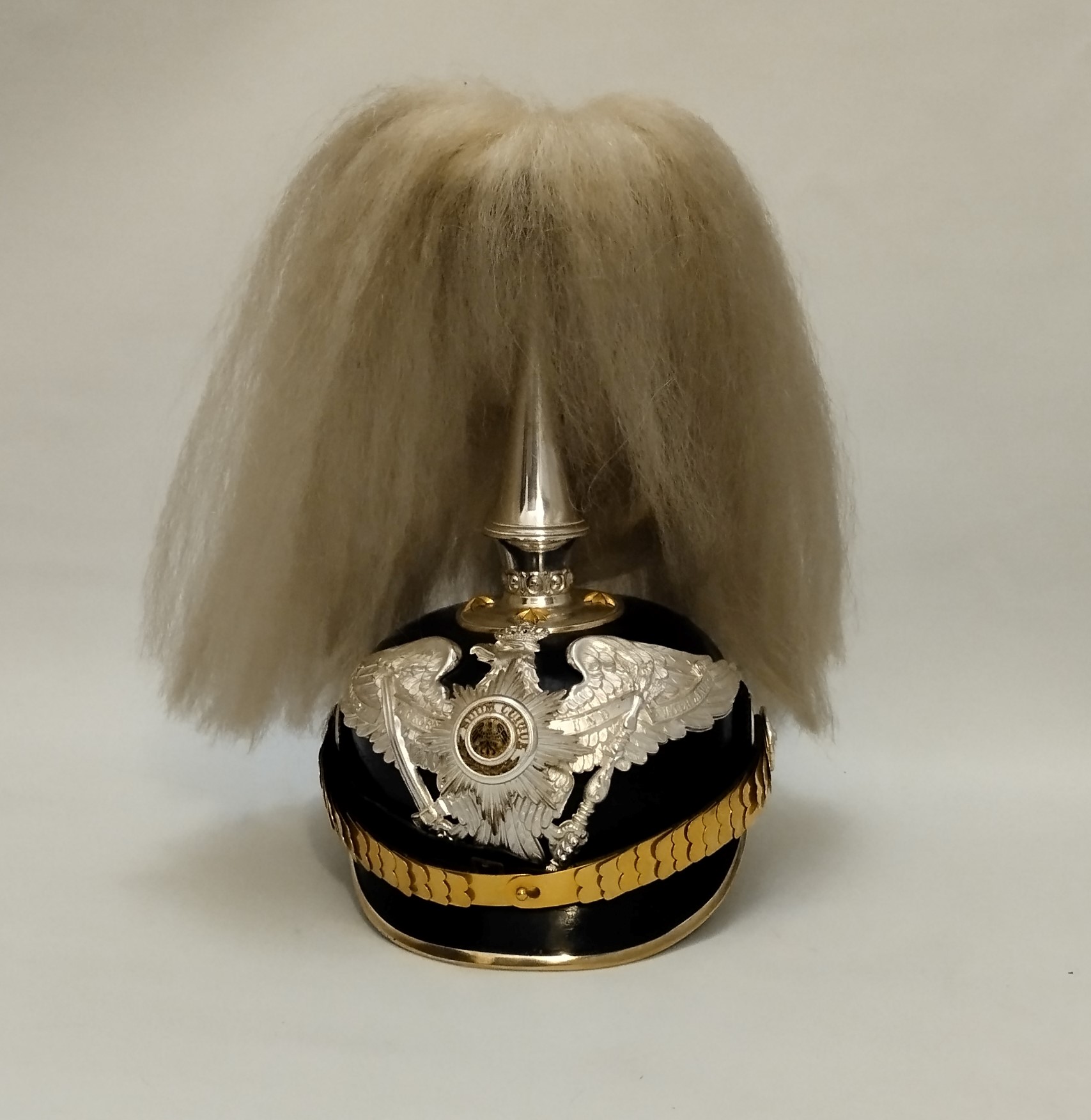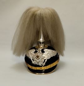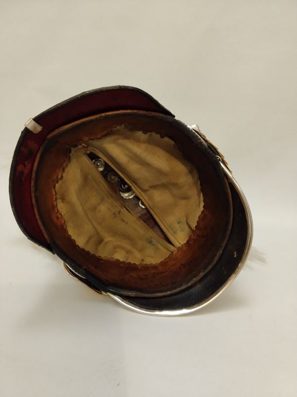 Elmo in cuoio bollito laccato nero, fregio e chiodo in metallo argentato, soggolo a scaglie piatte dorato, il piatto del chiodo è tondo, chiodo liscio con capitello a disco e arbush in pelo naturale, completo di coccarde, alluda interna e cuffia di seta. Molto bello; presenta restauri diffusi.