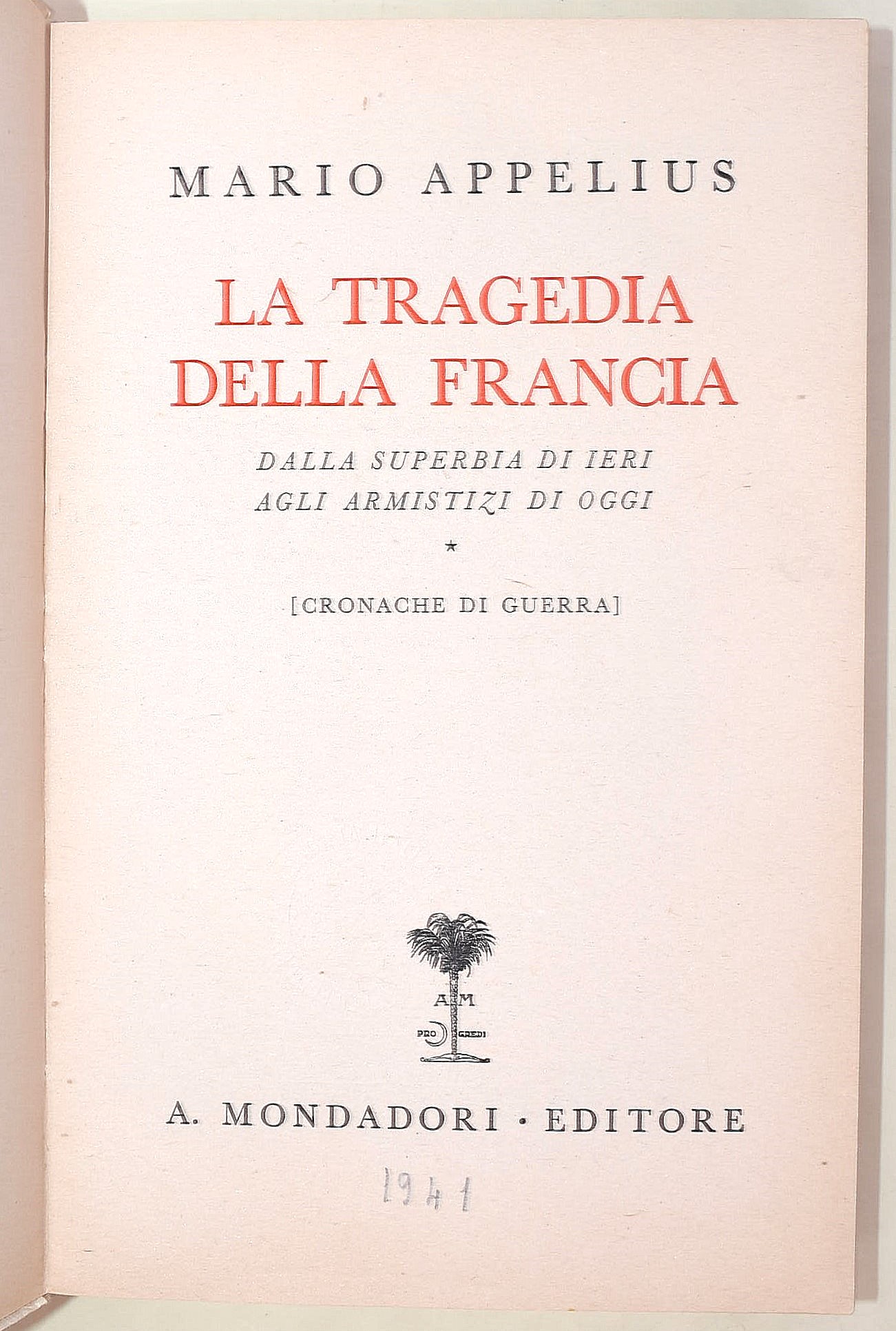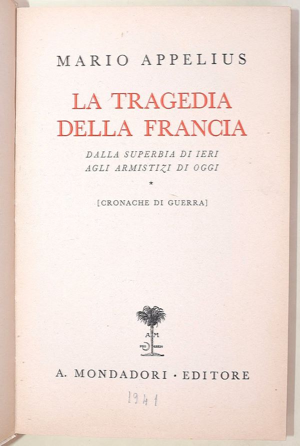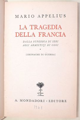 La Tragedia della Francia. Dalla superbia di ieri agli armistizi di oggi. Cronache di guerra di Mario Appelius, Mondadori, 1941-XIX. Brossura.