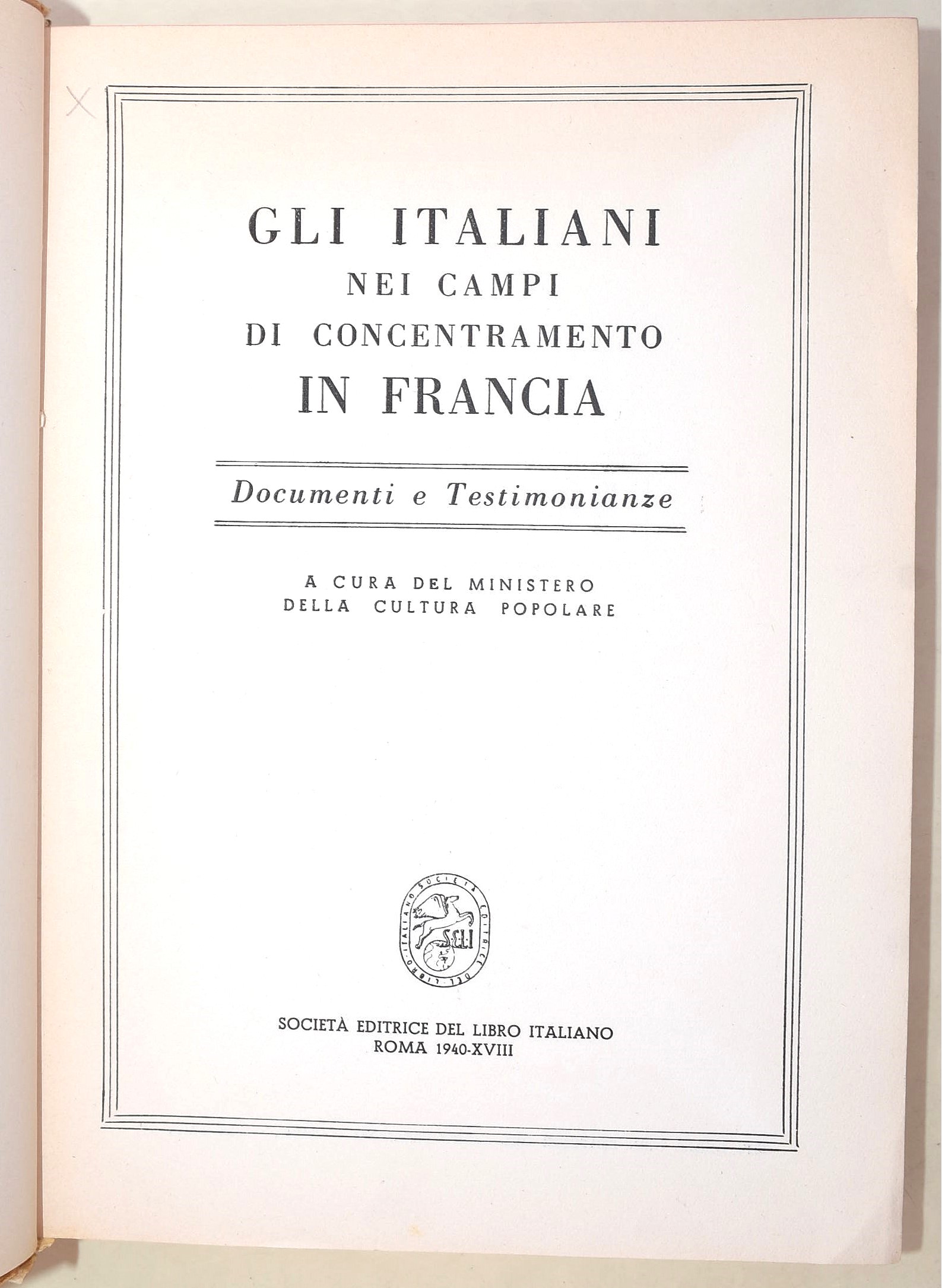 Gli italiani nei campi di concentramento in Francia, Società Editrice del Libro Italiano, 1940-XVIII. Brossura.