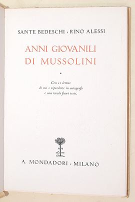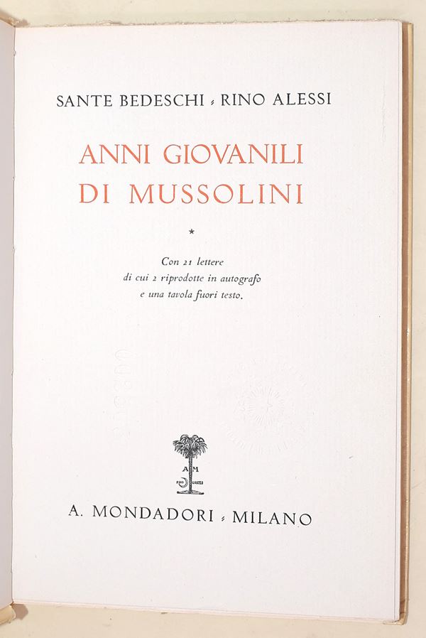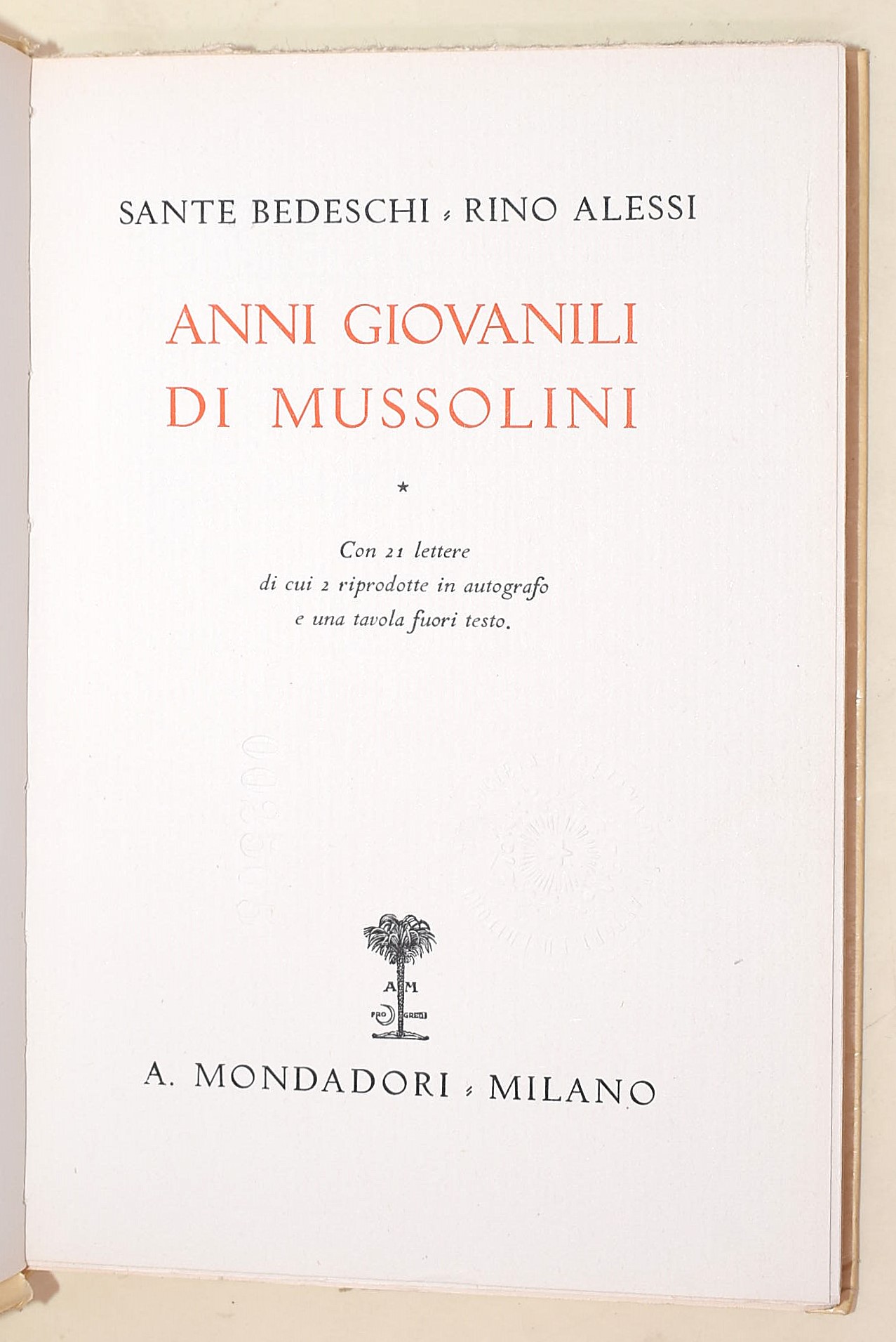 Bedeschi, Sante - Alessi, Rino: Anni Giovanili di Mussolini, Mondadori, 1939. Brossura. Prima edizione.