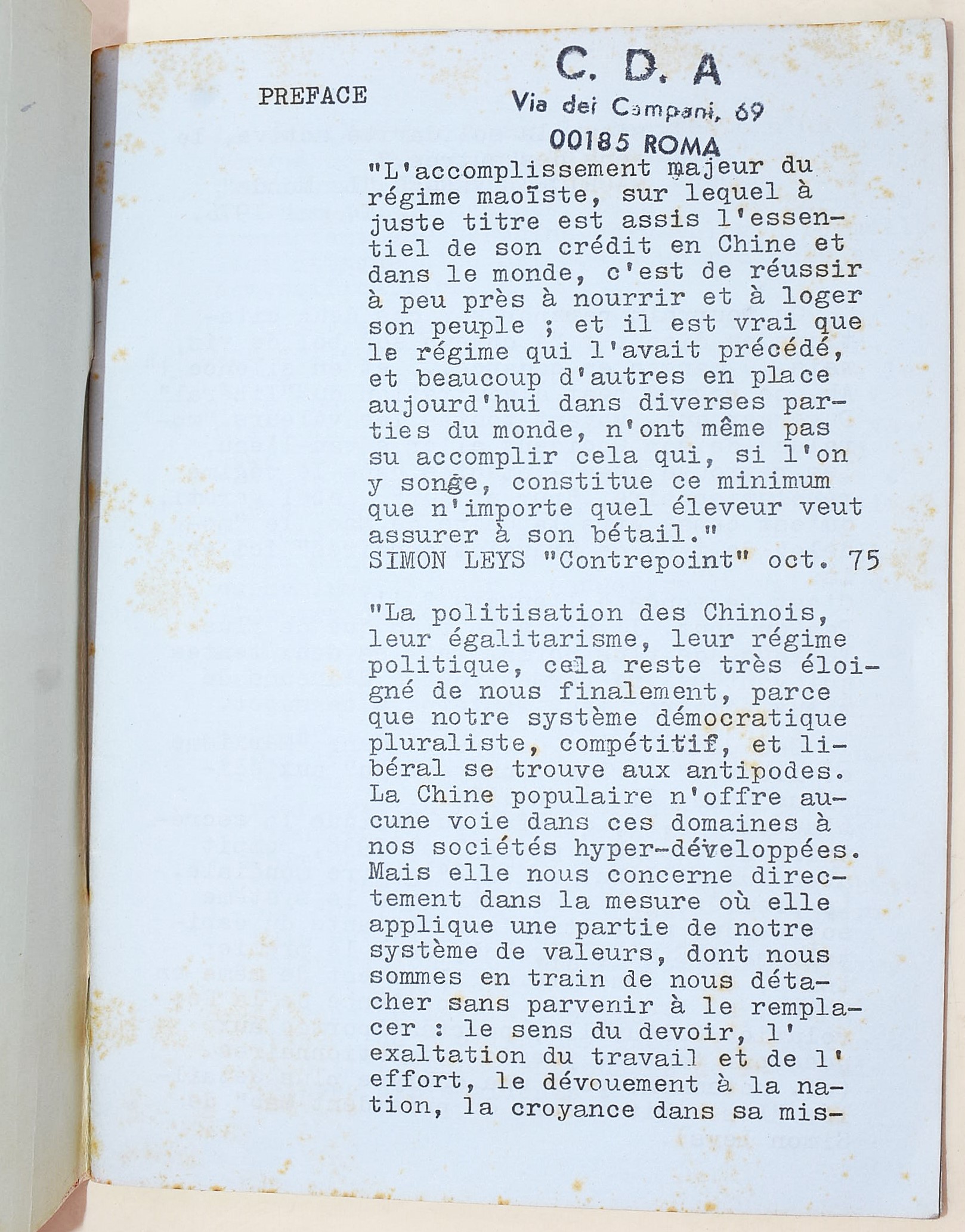 Où va la Chine? 1976. Opuscolo su carta azzurrina. Timbro "C.D.A. Via dei Campani, 69 00185 Roma".
