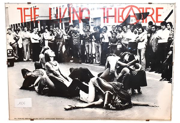Poster grafico in rosso e nero con scritta stilizzata “The living Theatre” con simboli di pace e anarchia. 70x50 cm; insieme a poster fotografico di raduno Hippie con didascalia in lingua italiana da: "abbiamo paura della liberazione sessuale.” 68x49 cm.
