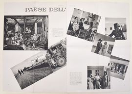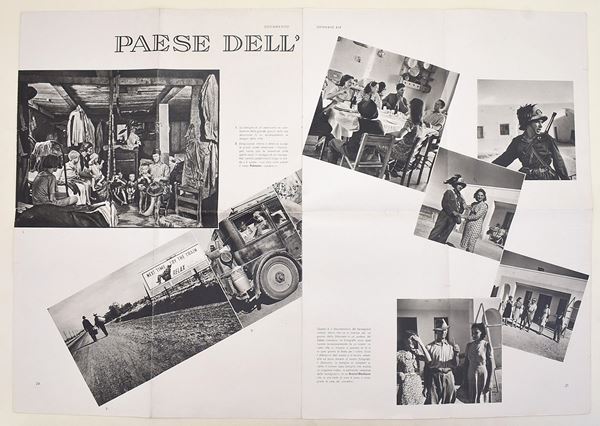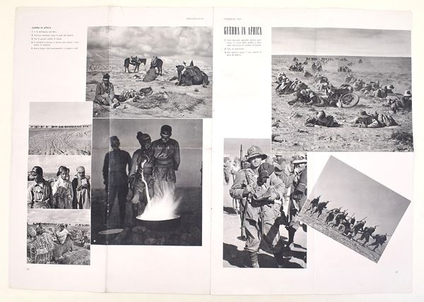 2 poster ripiegati originali estratti da riviste d'epoca anni '40, eseguiti su disegno di Mario Guerri. Dimensioni: 60x42 cm ca. Segni di punti metallici al centro. Stampati in bianco e nero fronte e retro. Nel retro articoli delle riviste.