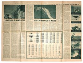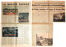 Battaglia di Punta Stilo da 2 riviste di guerra anni '40. Grande inserto poster con resoconto della Battaglia Navale di Punta Stilo. Dimensioni: 74x56 cm ca. Insieme al ritaglio del Messaggero dell'Abruzzo. Originali del 1940. Ripiegati in 8. Ottimo stato di conservazione.