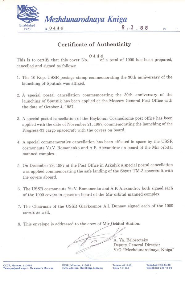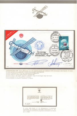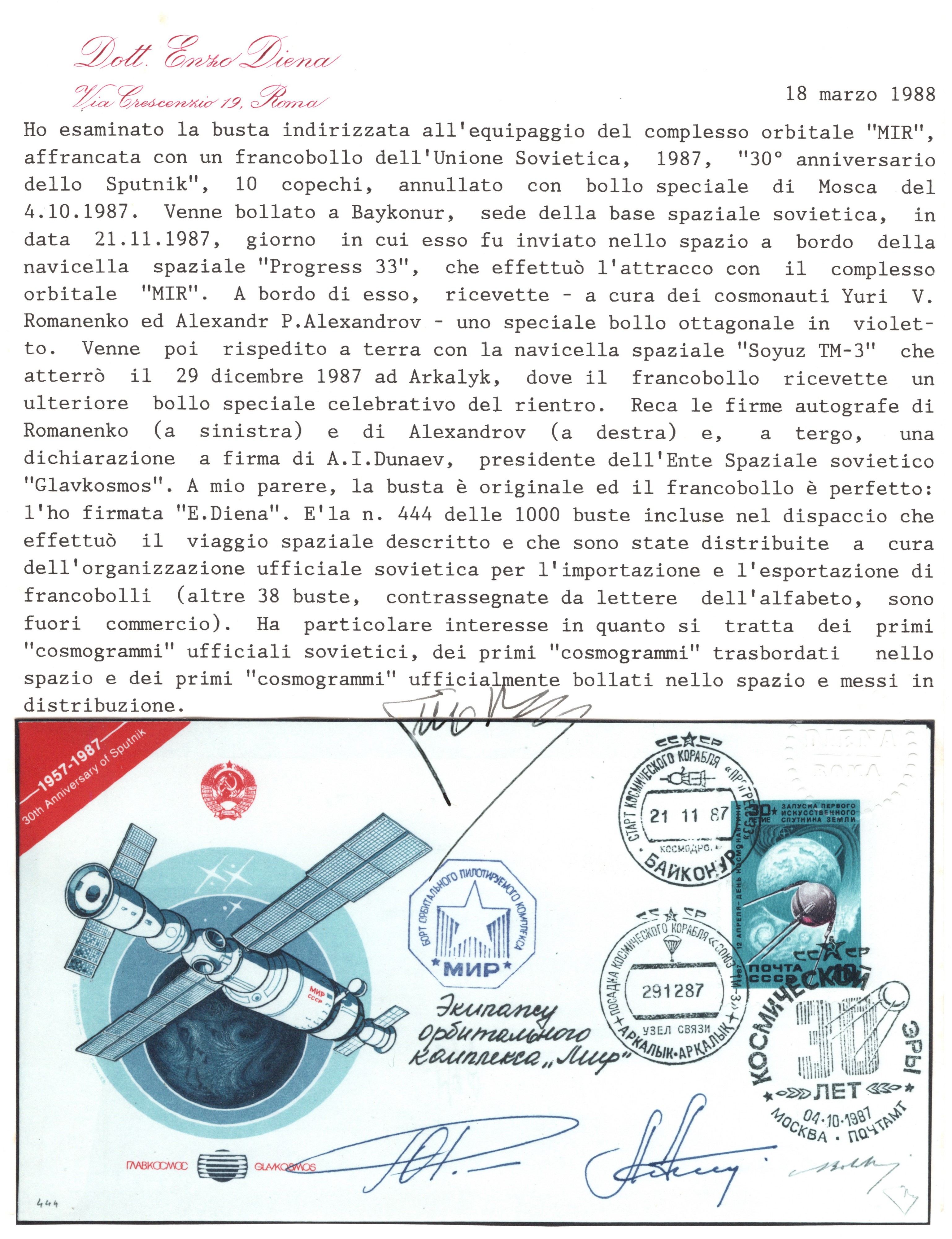 1987 - Lettera annullata inzialmente nella sede spaziale di Baykonur, per poi ricevere l'annullo speciale nella navicella spaziale ''Progress 33''. N. 444 delle 1000 esistenti. Certificato di autenticità Mezhdunarodnaya Kniga, dettagliato certificato Enzo Diena, confezione Bolaffi con biglietto d'accompagno scritto da Alberto Bolaffi. Raro insieme perfettamente conservato.